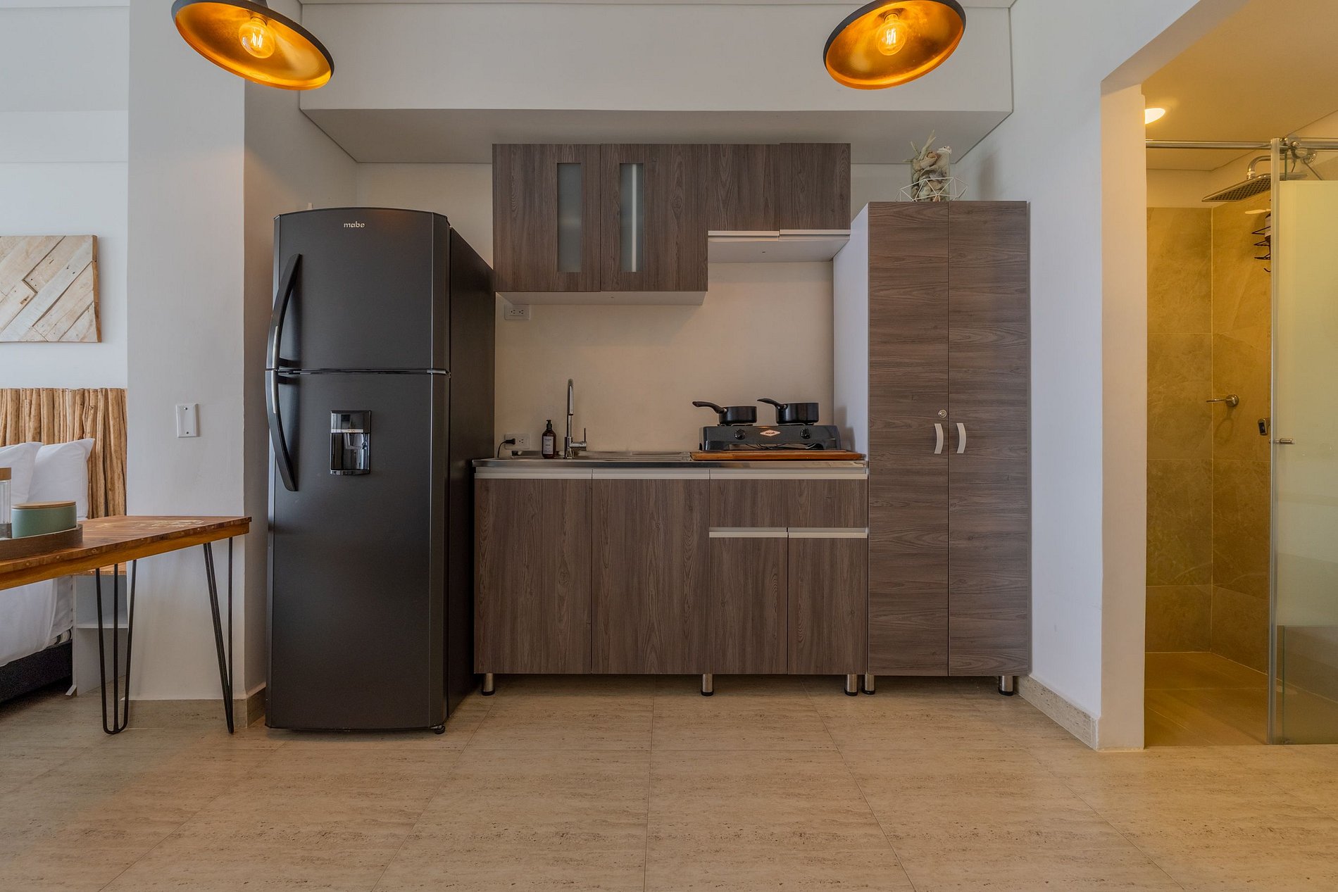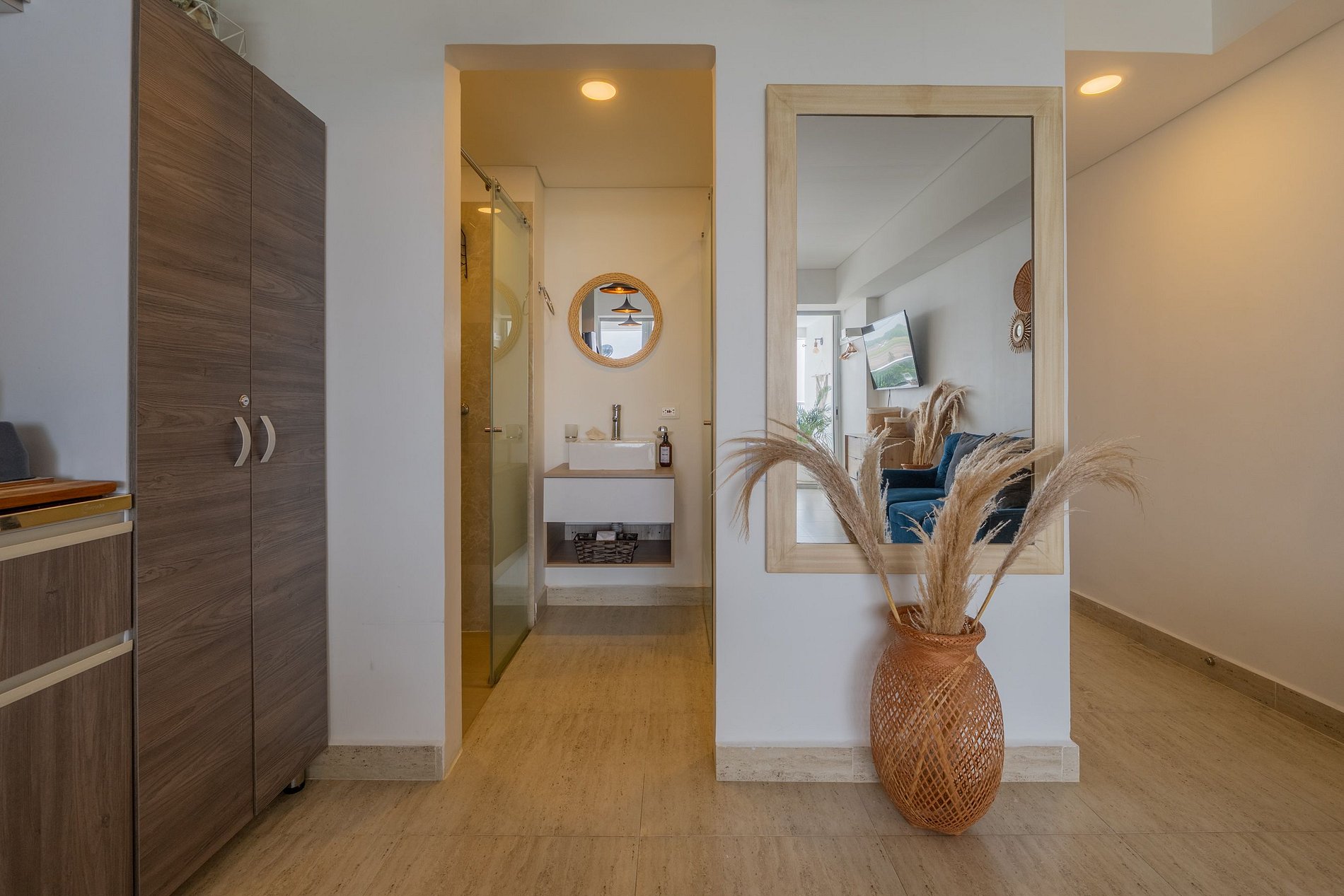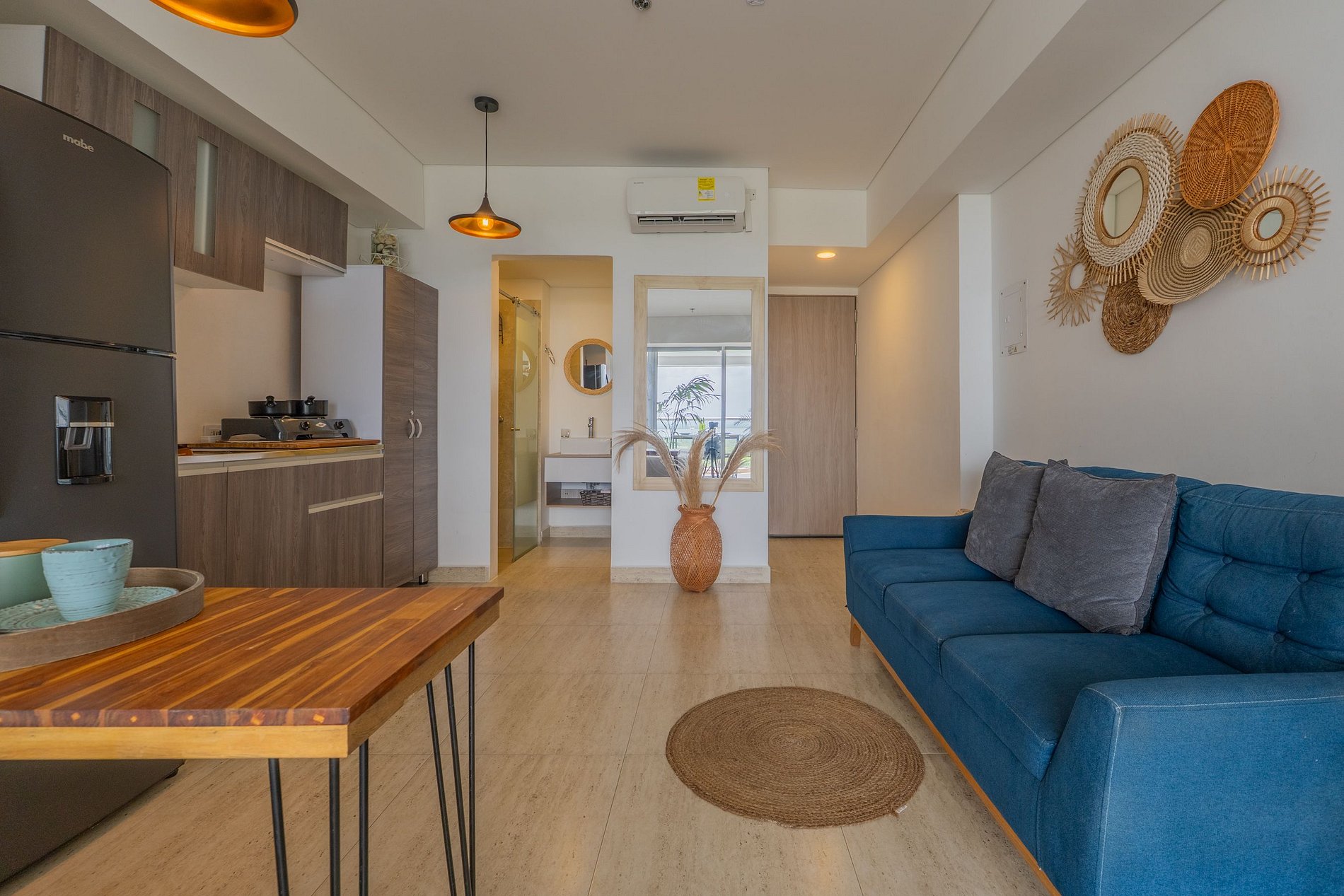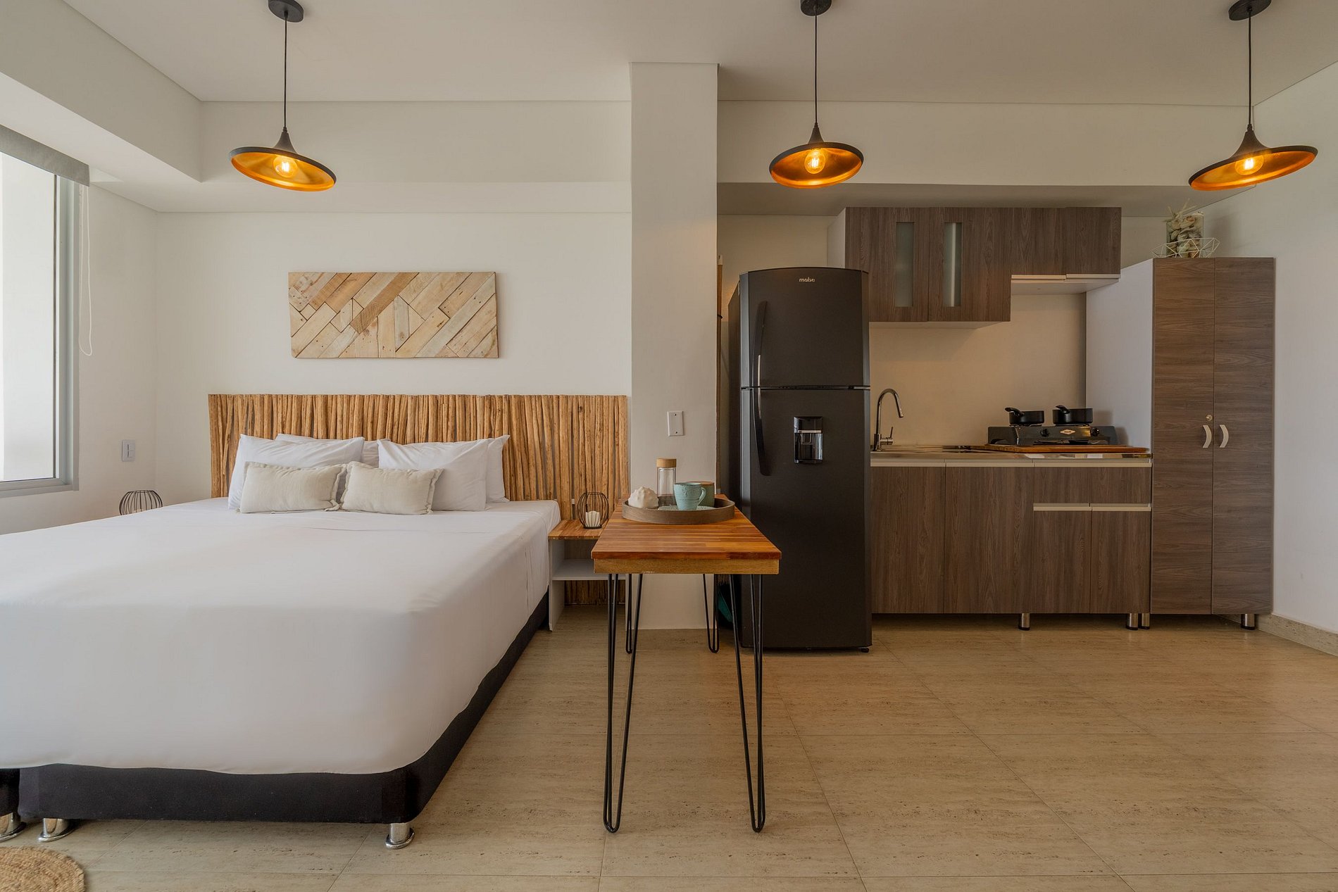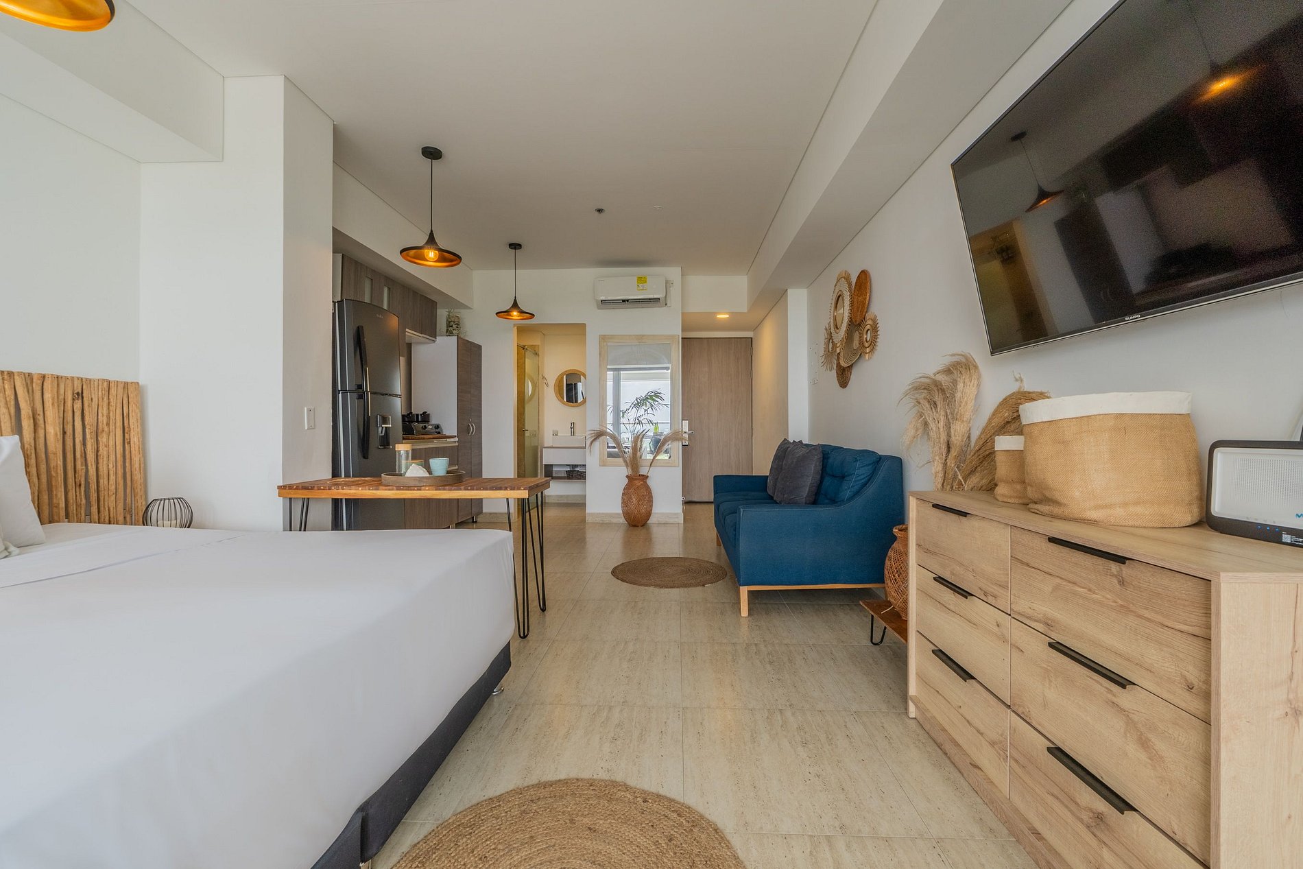 • Diseño boho moderno con tonos cálidos, madera y detalles naturales que invitan al descanso.