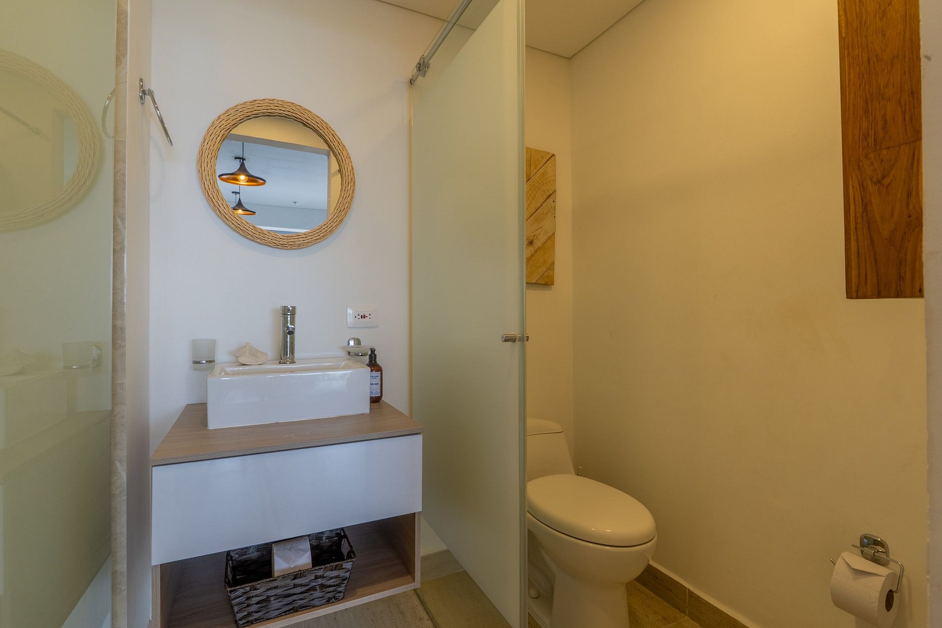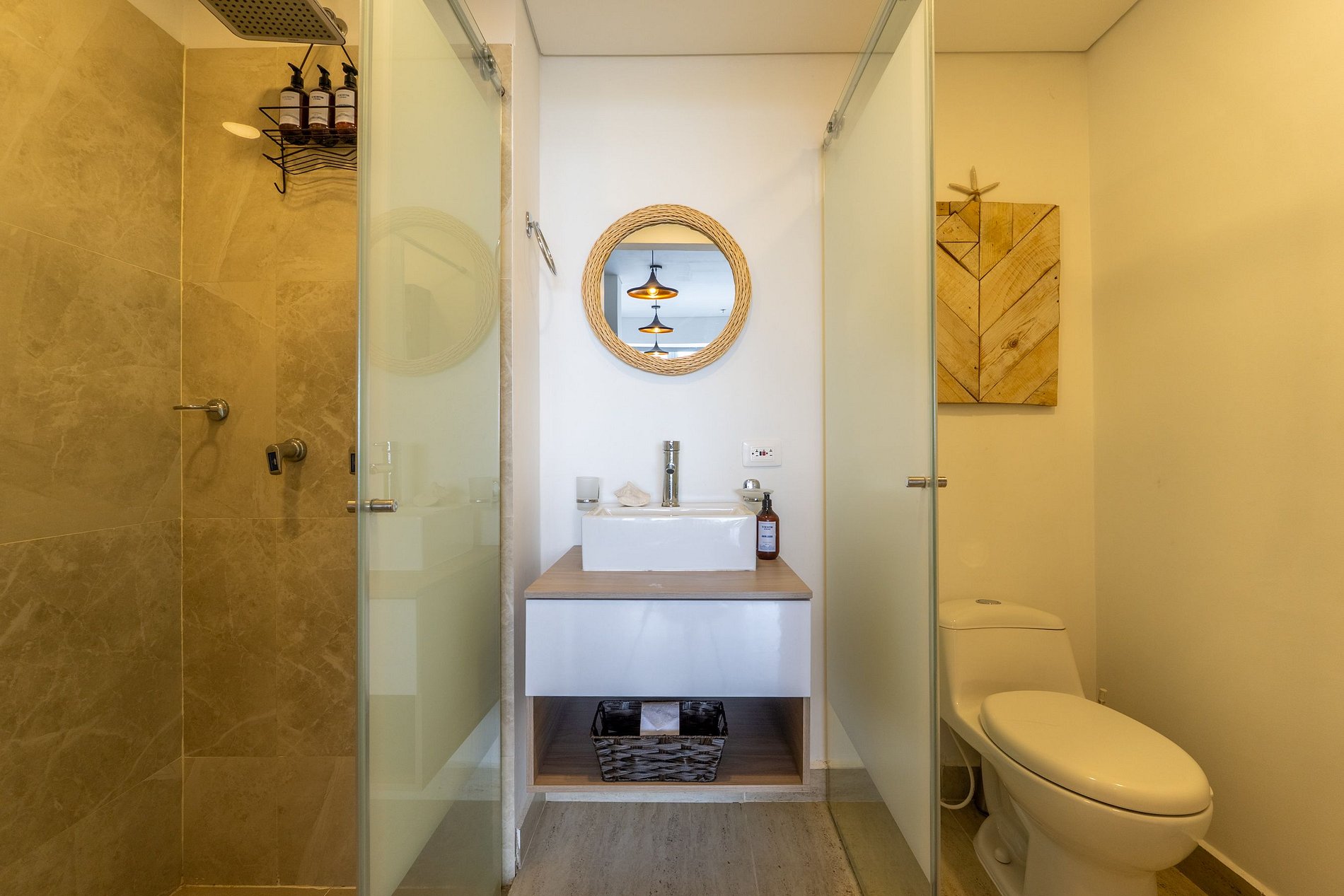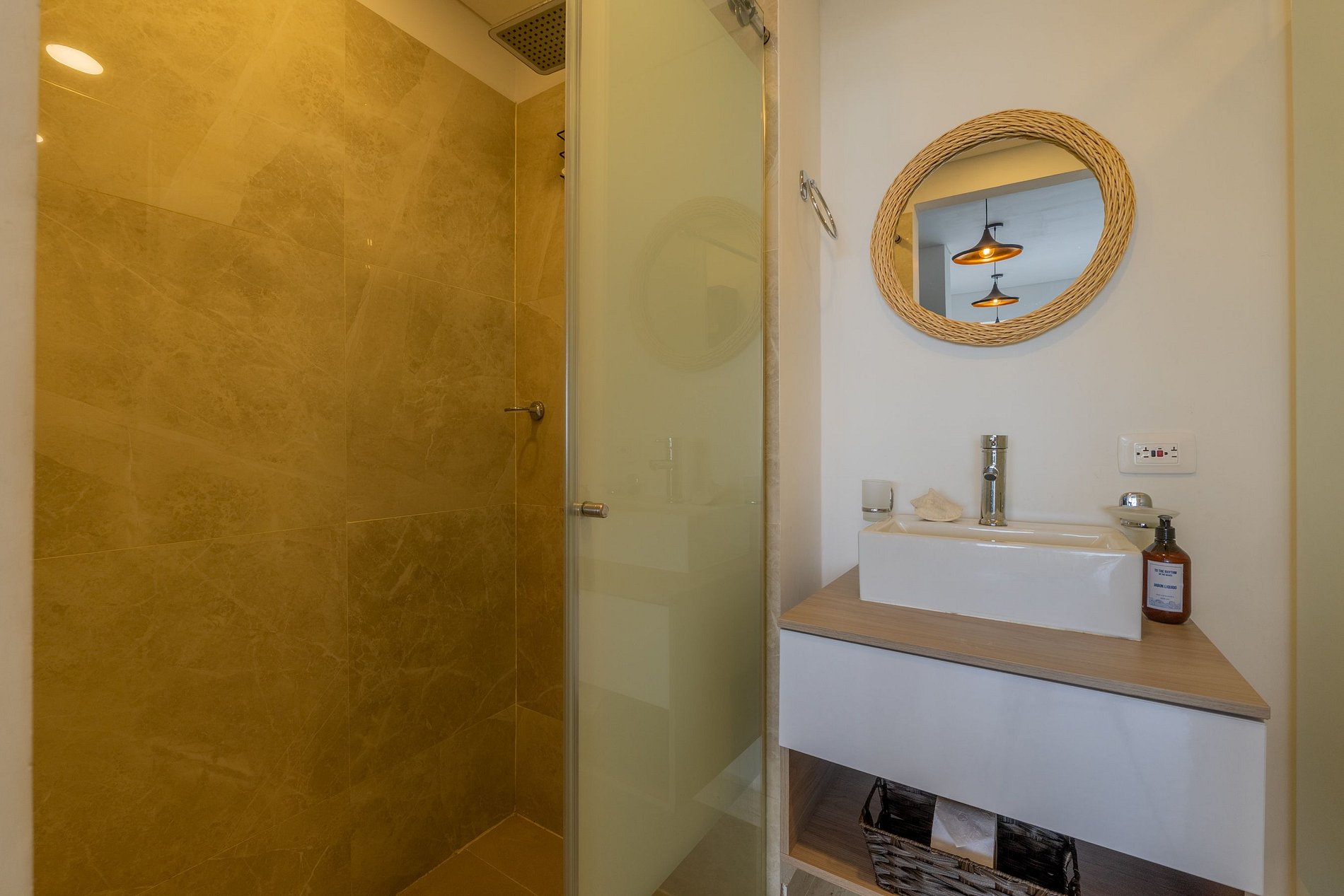 • Baño tipo hotel con ducha en vidrio y acabados modernos.