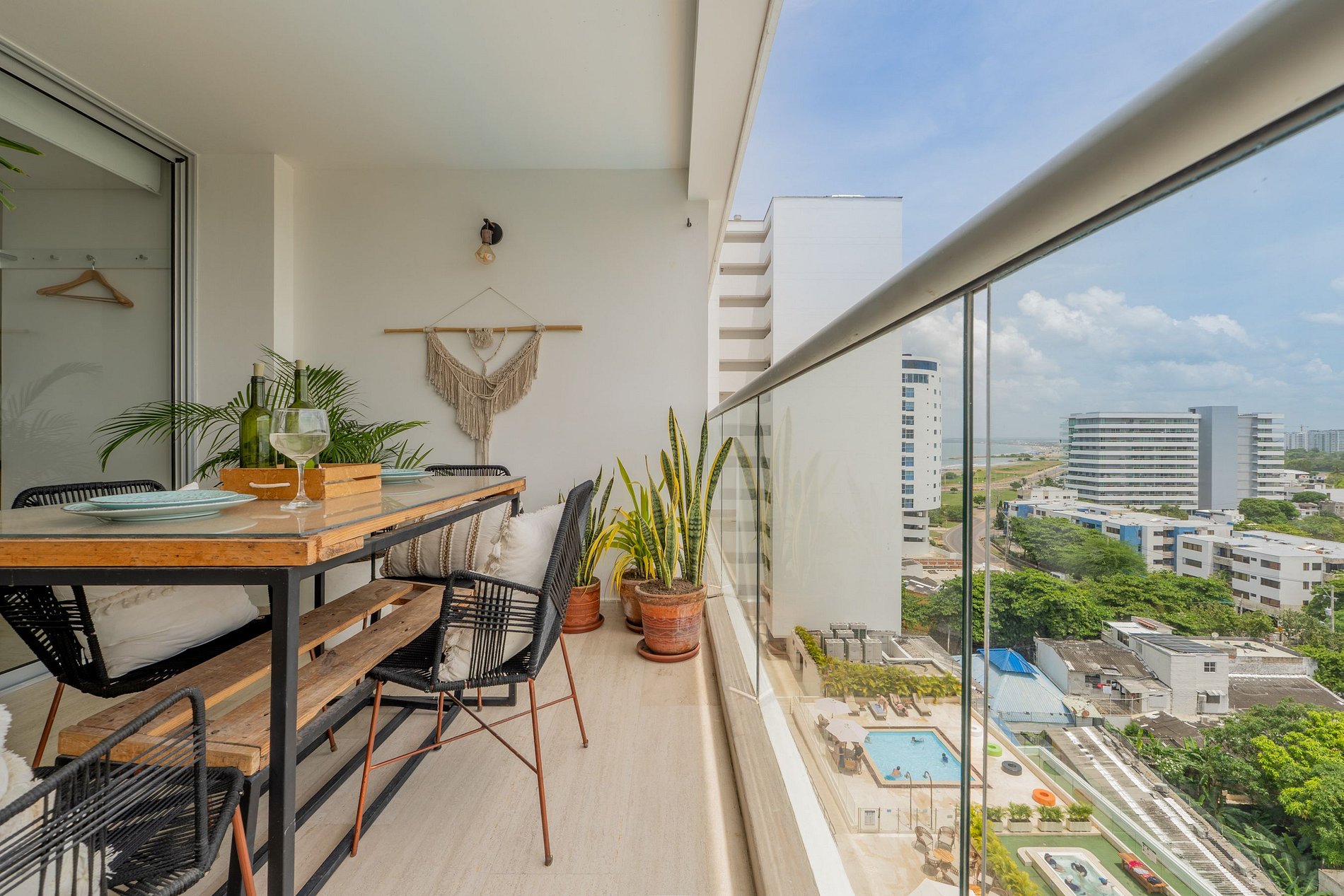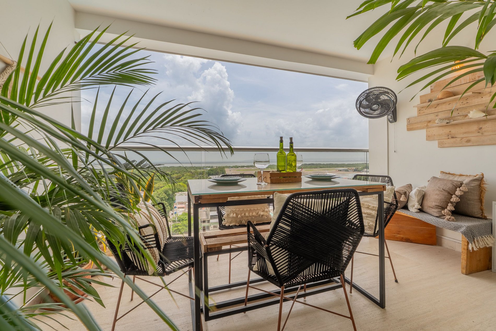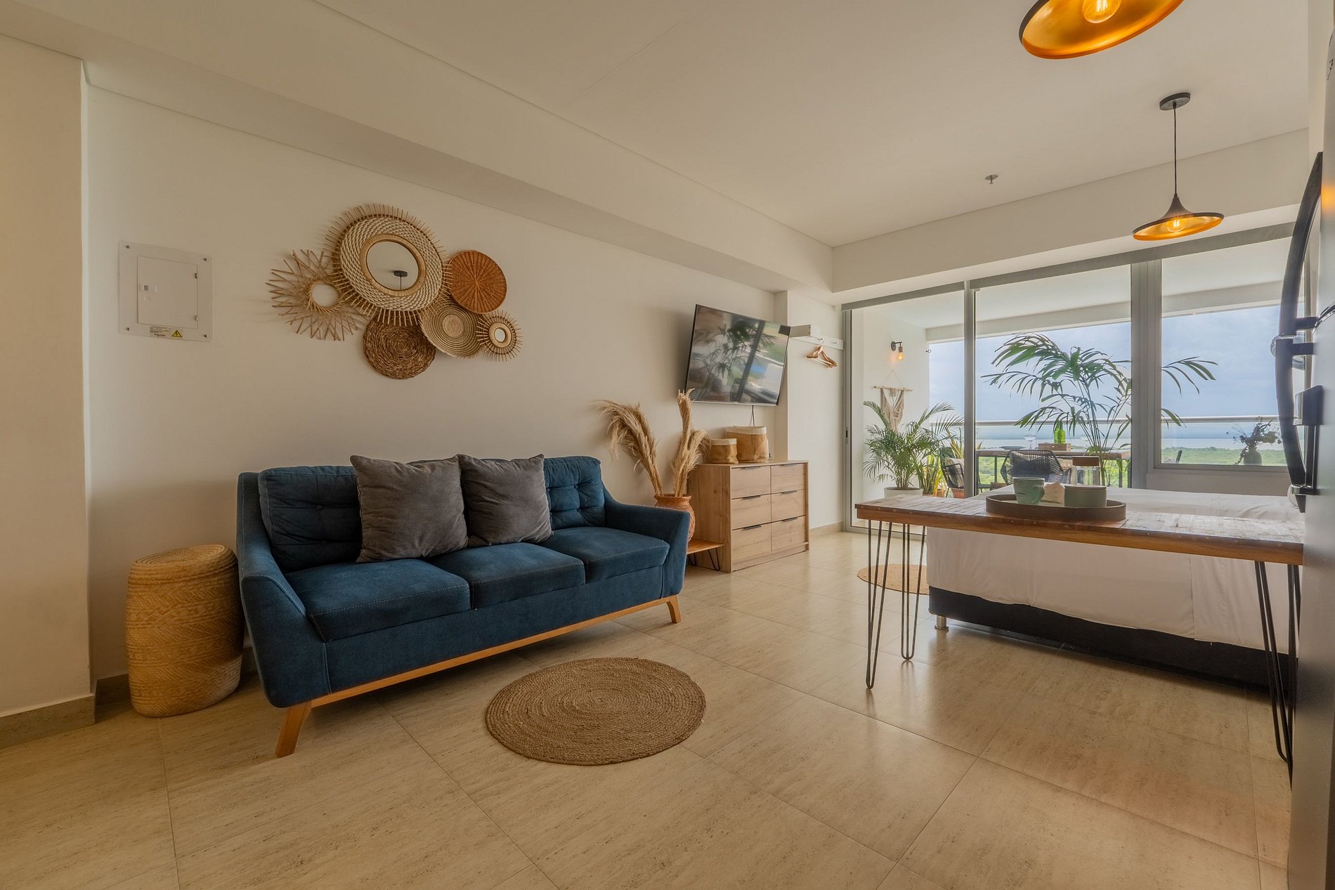Disfruta esta suite moderna en el piso 10 del edificio Cartagena Beach, con balcón amoblado y vista a la Ciénaga, la piscina y la ciudad. Su estilo boho combina madera y tonos naturales para un ambiente cálido y relajante. Cuenta con cama king, sofá cama, cocina equipada, Smart TV y aire acondicionado. El edificio ofrece piscina semiolímpica, piscina infantil, sauna, turco, lavandería, gimnasio y acceso directo a la playa. A 5 min del aeropuerto y 10 min del Centro Histórico.