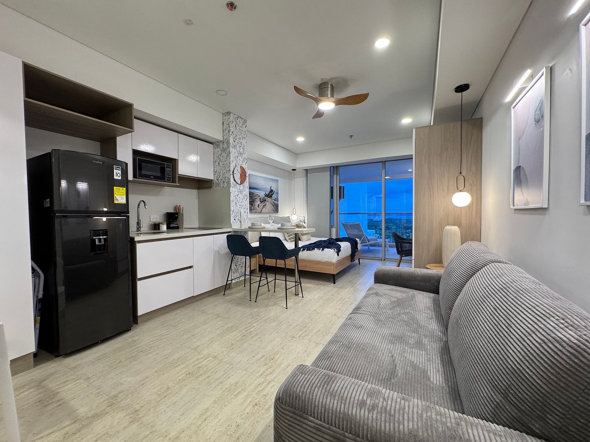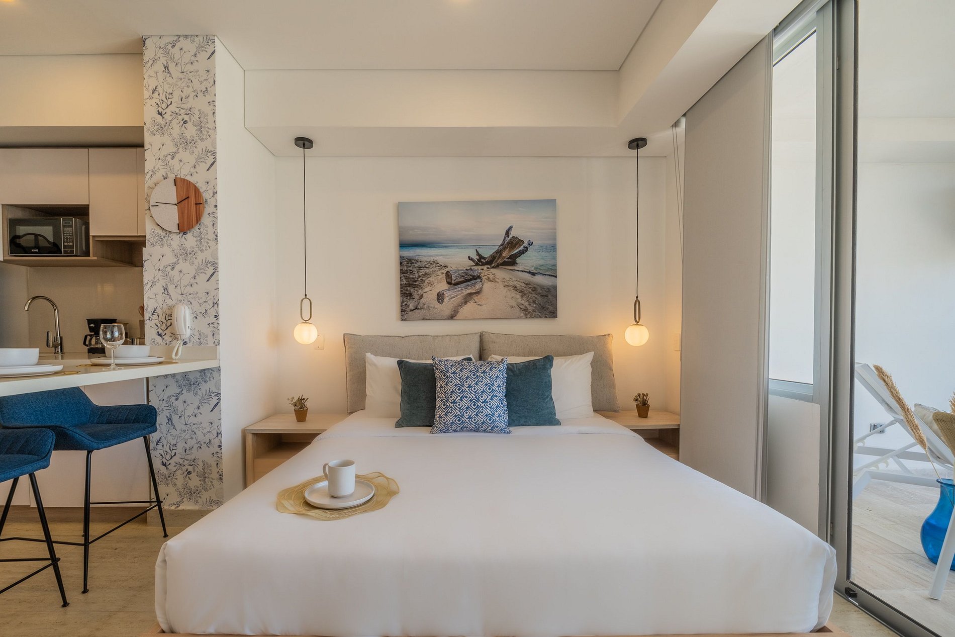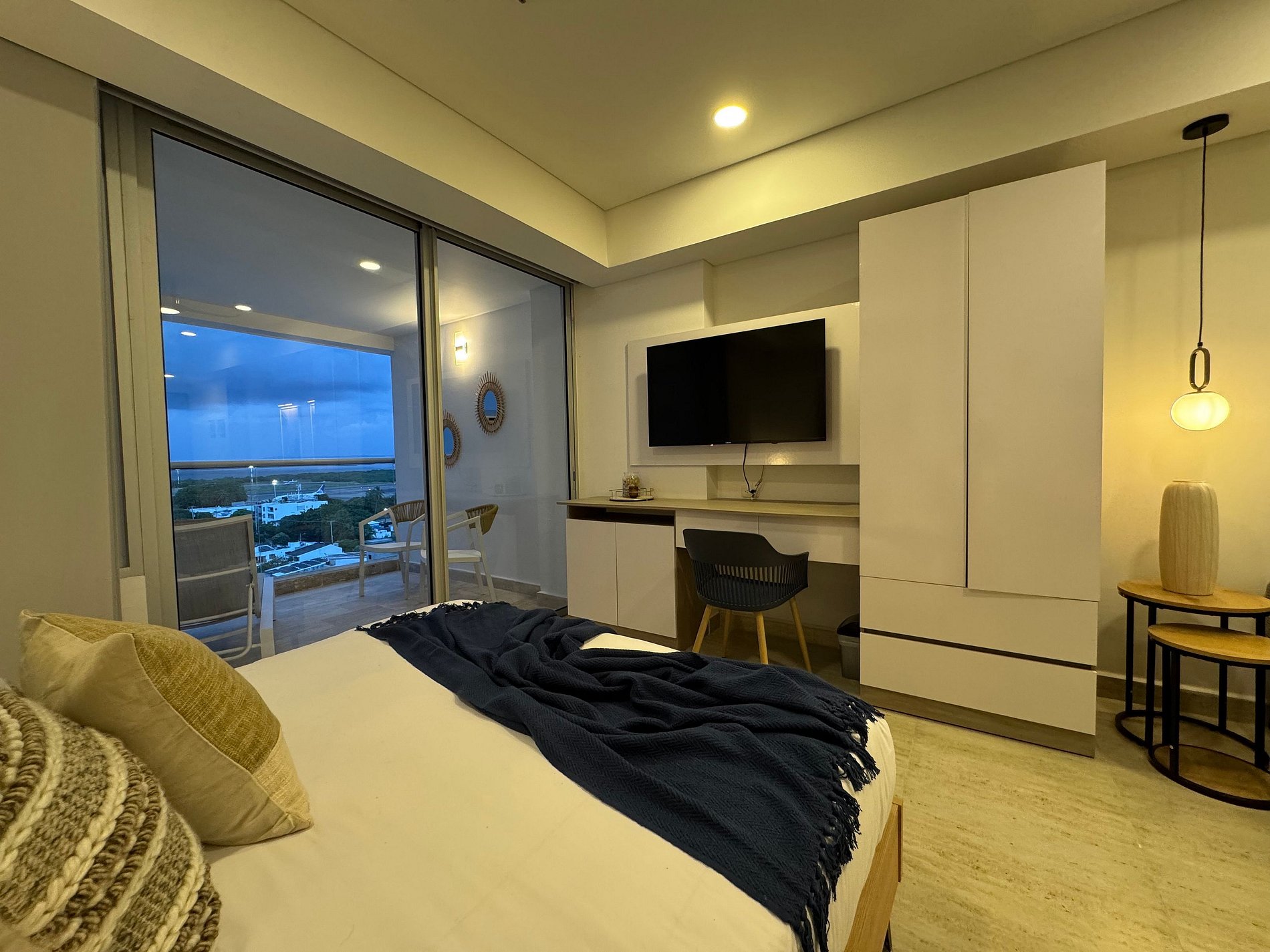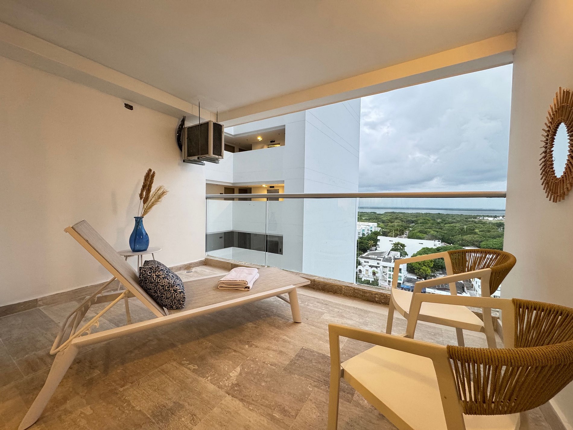 Suite mediterránea con estilo elegante y contemporáneo. Cama Queen y sofá cama doble, cocina equipada con lavadora, Smart TV, aire acondicionado, Wi-Fi rápido y balcón amoblado con vista a la Ciénaga y la ciudad. Ideal para 4 huéspedes que buscan confort y diseño.