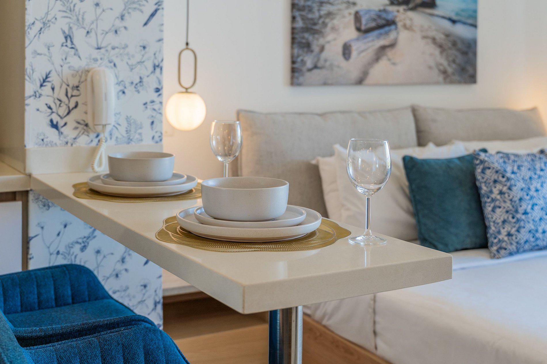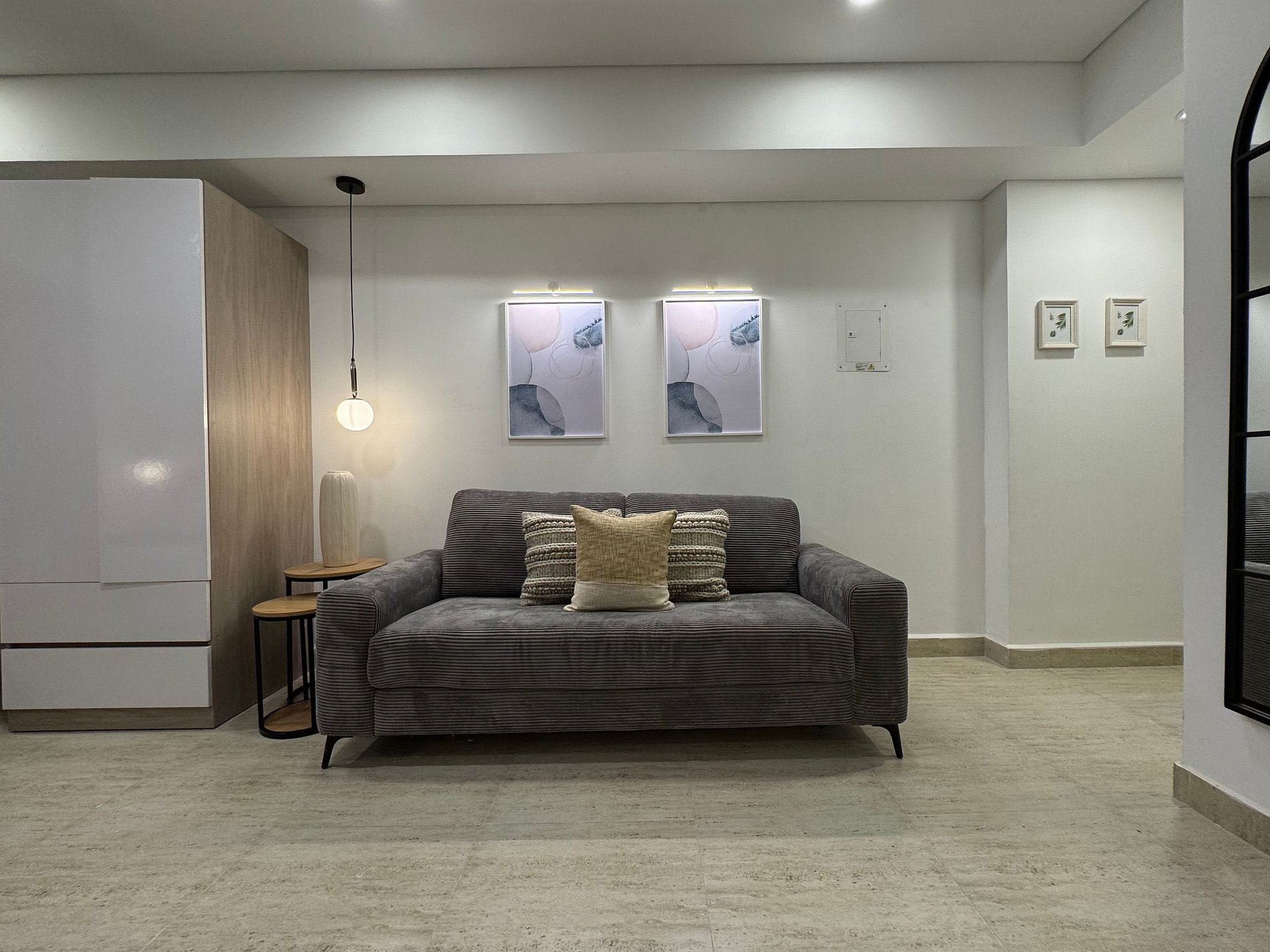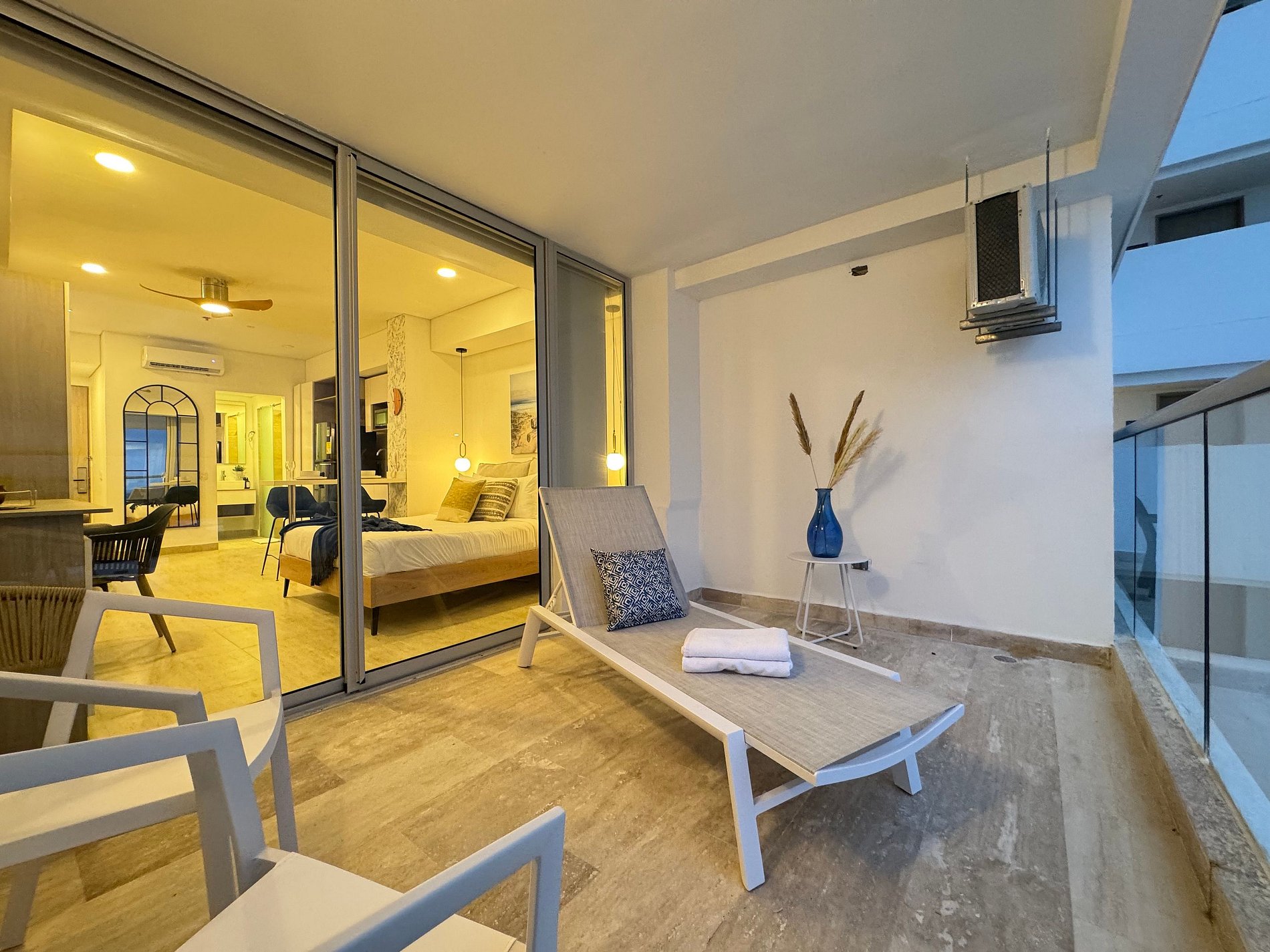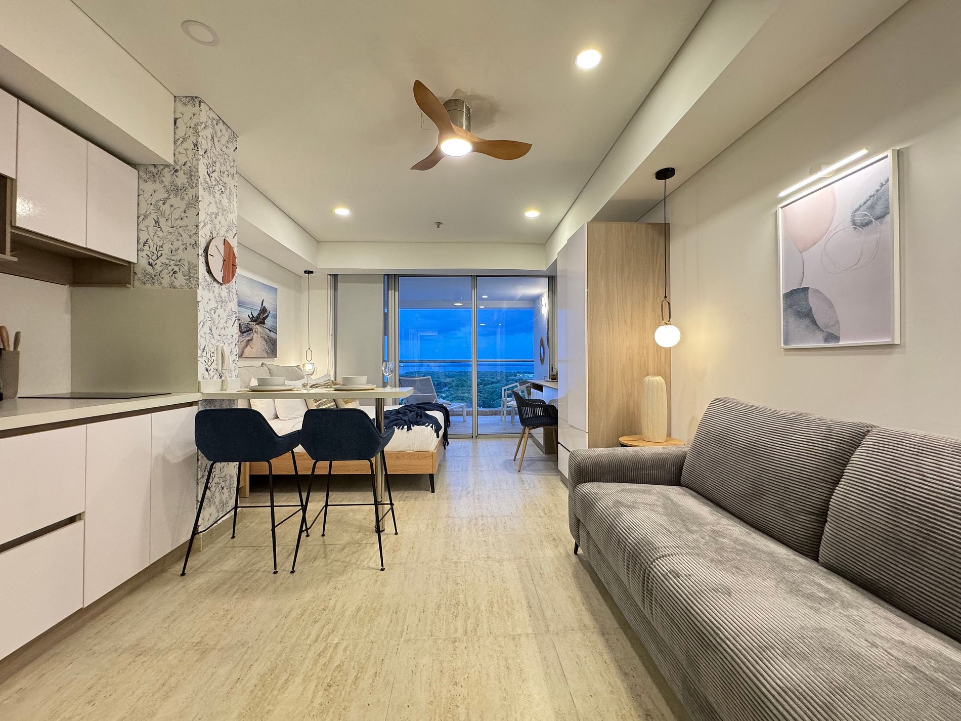 Suite mediterránea con estilo elegante y contemporáneo. Cama Queen y sofá cama doble, cocina equipada con lavadora, Smart TV, aire acondicionado, Wi-Fi rápido y balcón amoblado con vista a la Ciénaga y la ciudad. Ideal para 4 huéspedes que buscan confort y diseño.