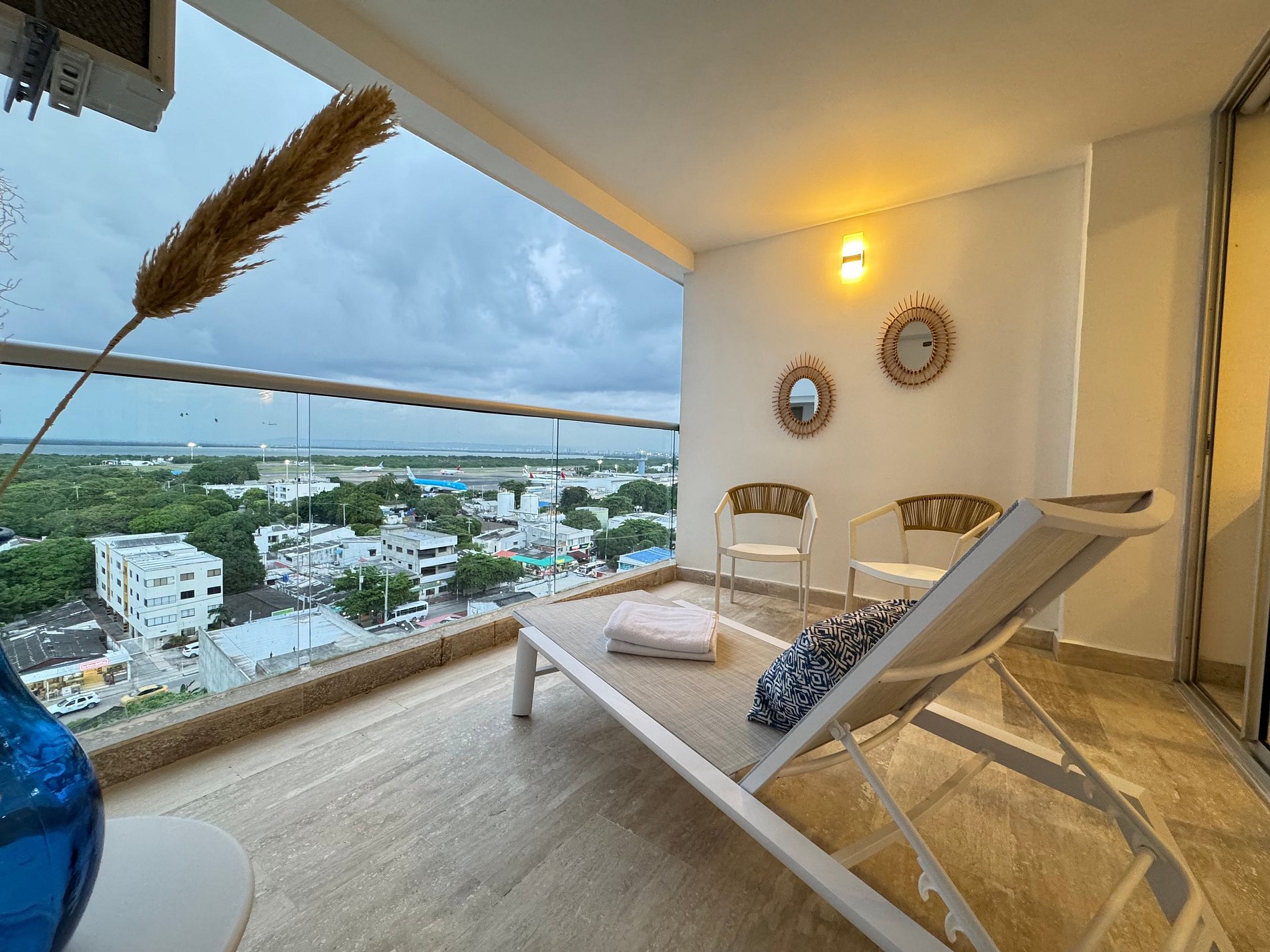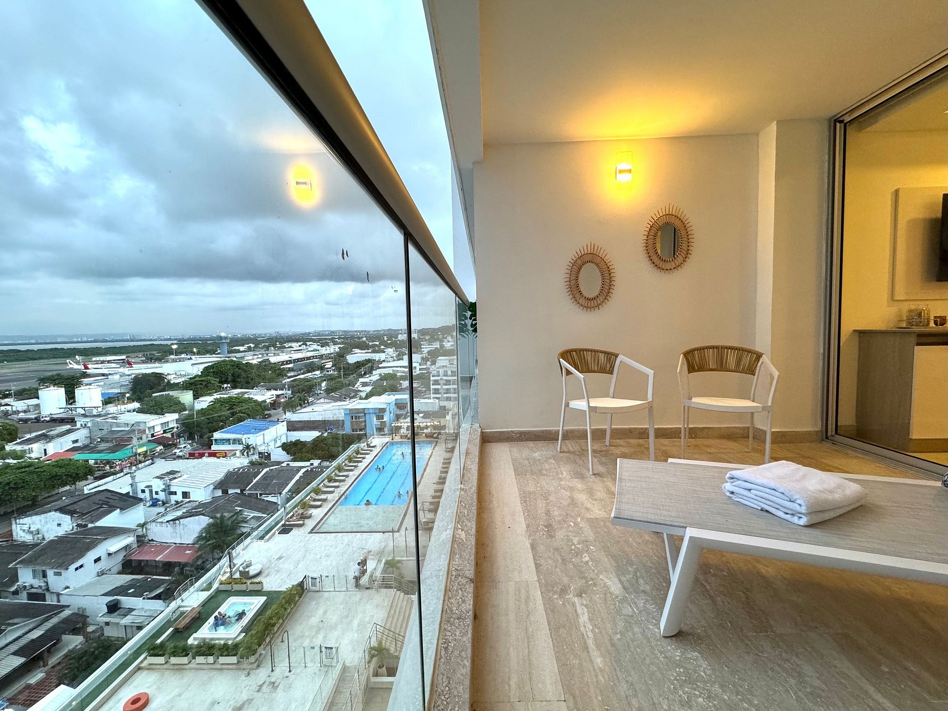 Disfruta esta elegante suite en el piso 10 del edificio Cartagena Beach. Con diseño contemporáneo y tonos cálidos. Con cama Queen y sofá cama doble de lujo, ambos muy cómodos. Su amplia terraza amoblada tiene vista a la Ciénaga y la ciudad. Cocina moderna totalmente equipada, Smart TV, aire acondicionado y Wi-Fi rápido. El edificio cuenta con piscina semiolímpica, piscina infantil, sauna, turco, gimnasio, lavandería y acceso directo a la playa. A 5 min del aeropuerto y 10 del Centro Histórico