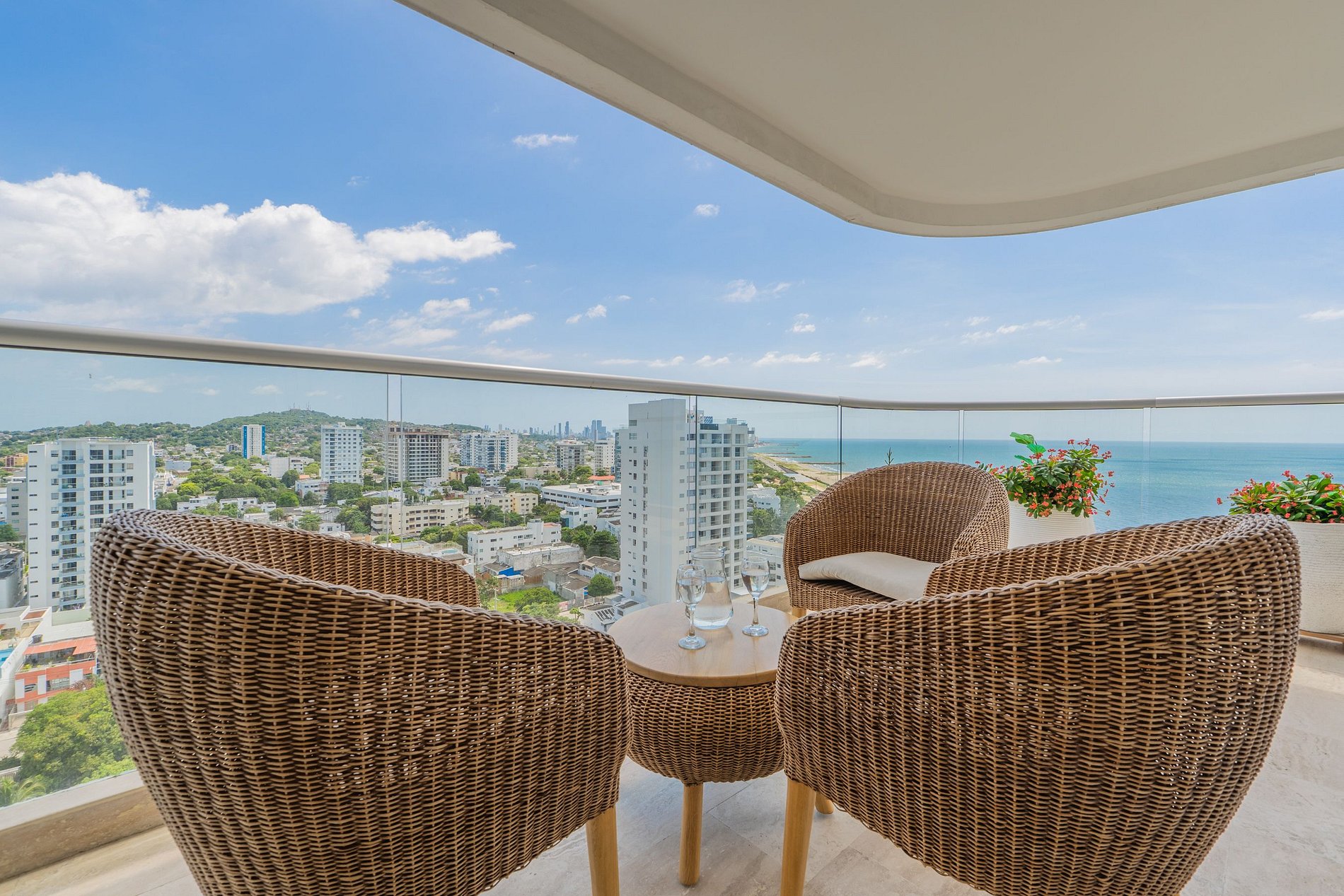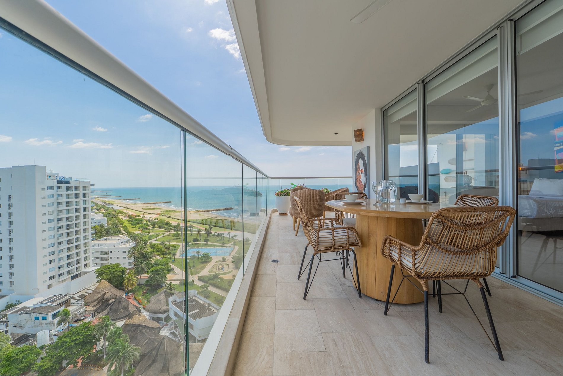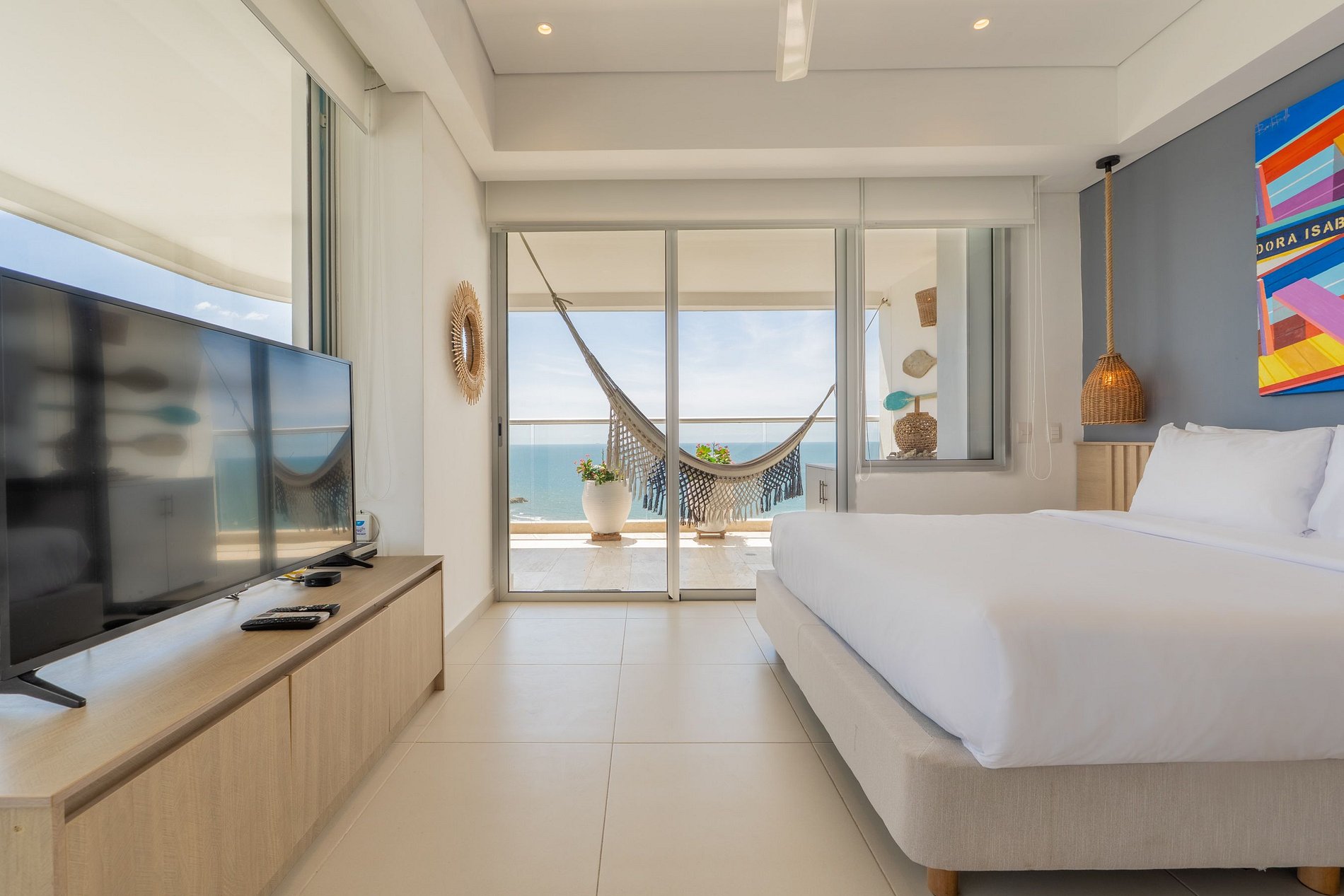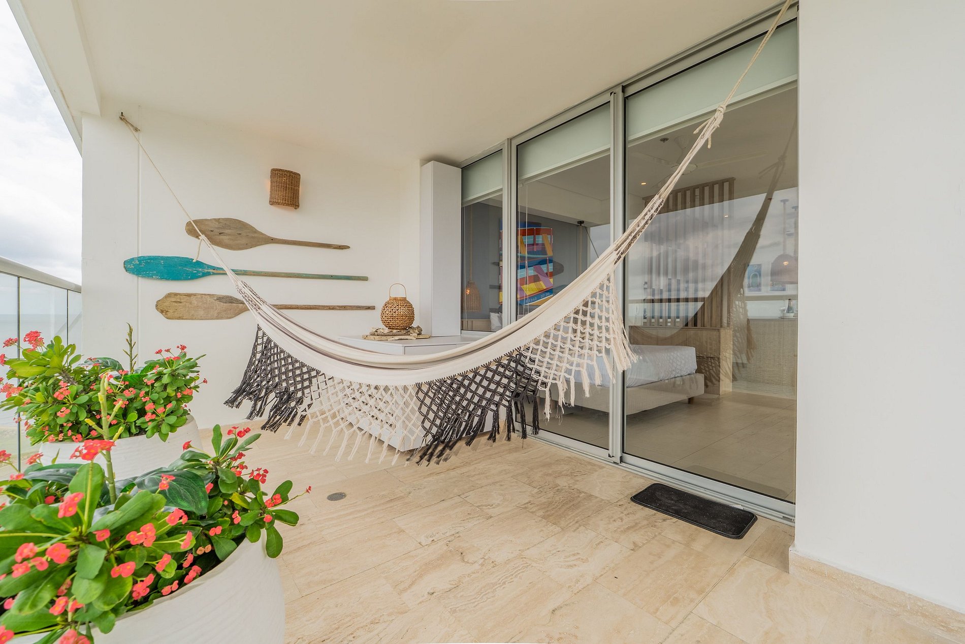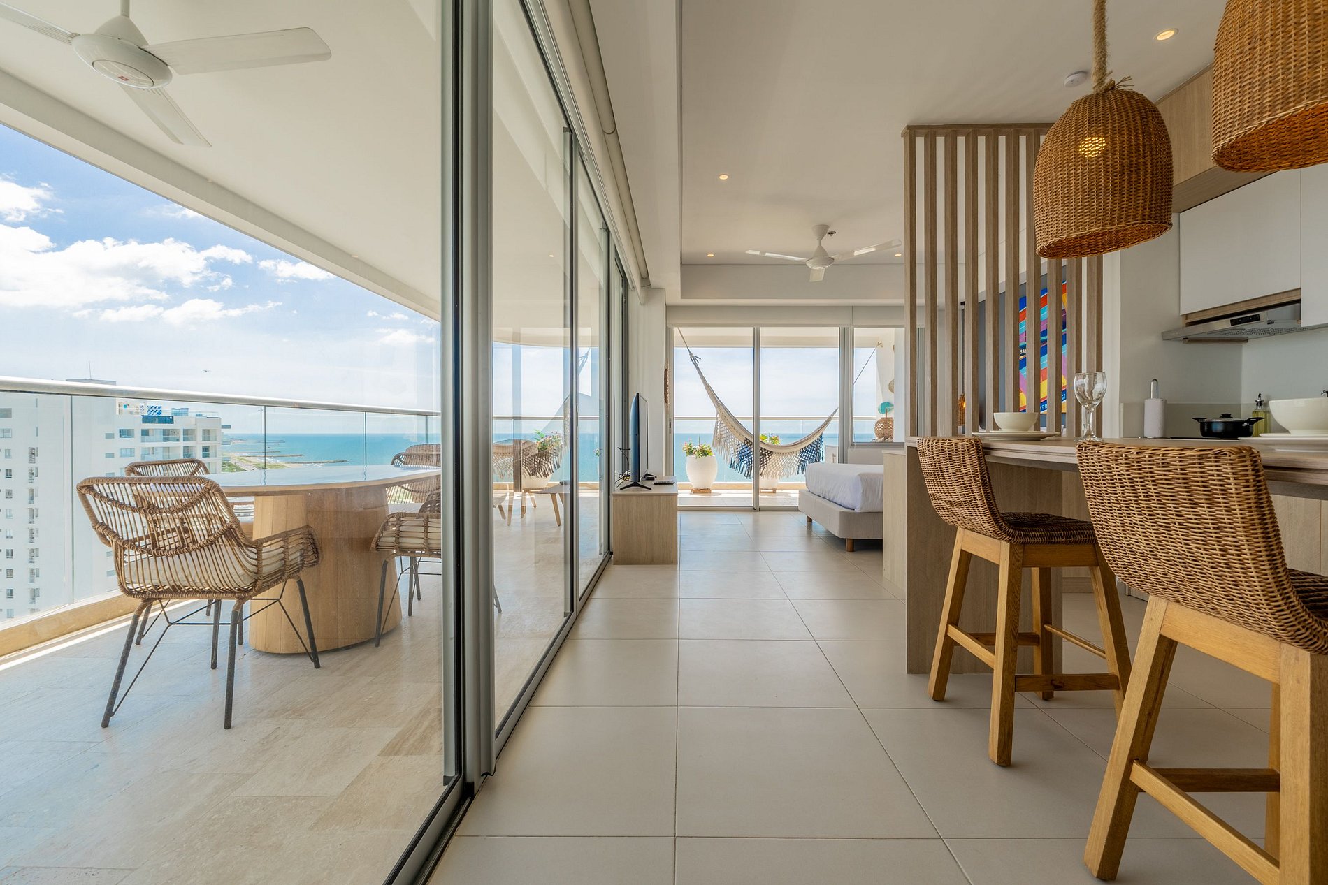 Moderno apartamento con cama queen y cocina equipada. Destaca su amplio balcón panorámico con hamaca y comedor exterior con vista al mar. Ideal para relajarse y disfrutar Cartagena con total confort.