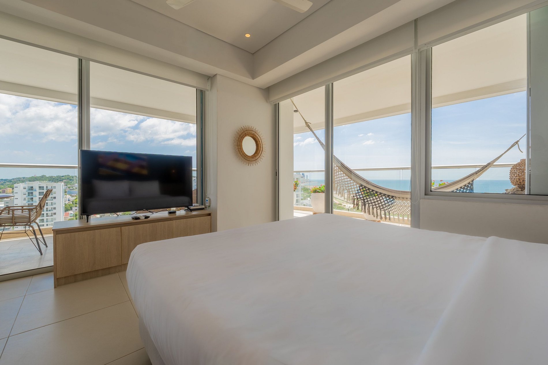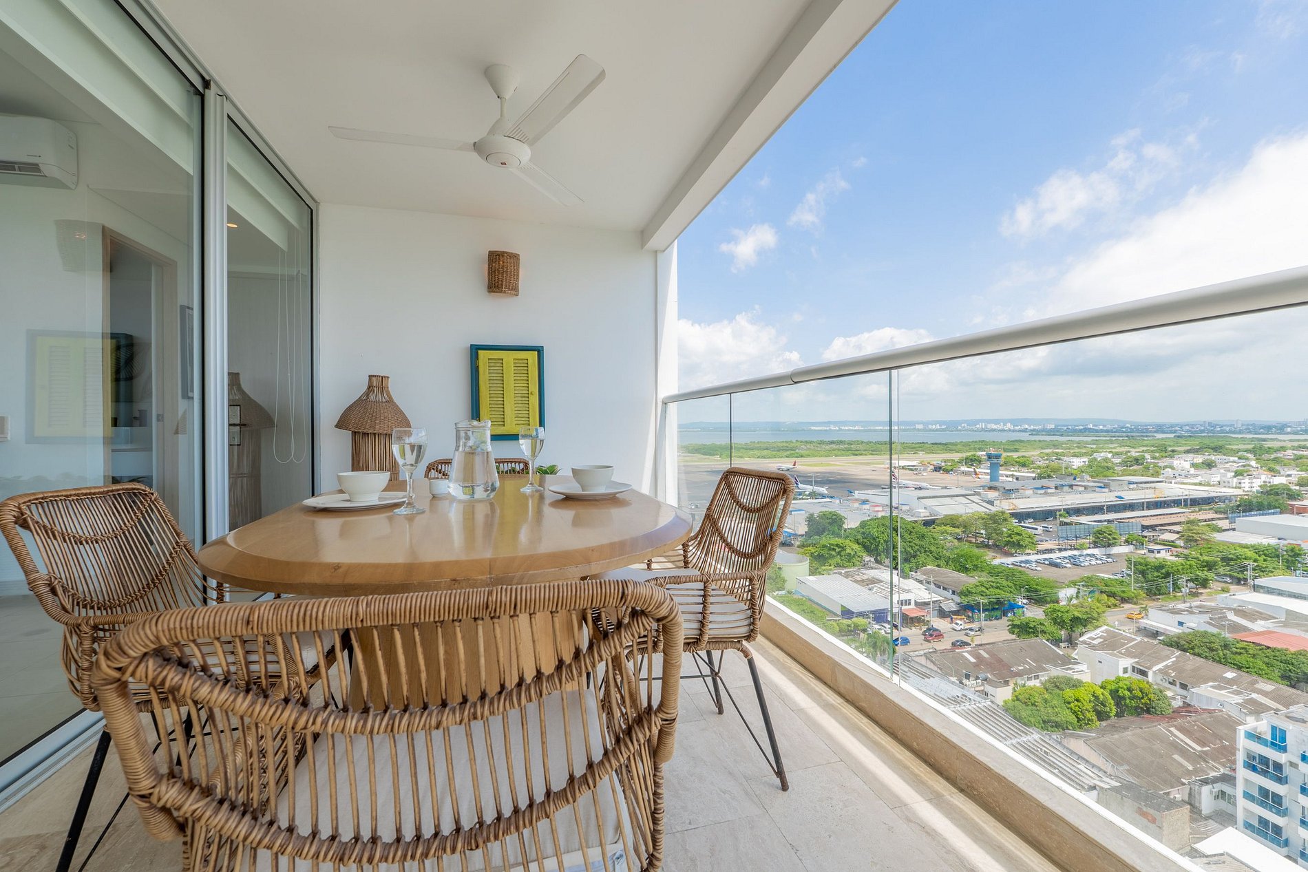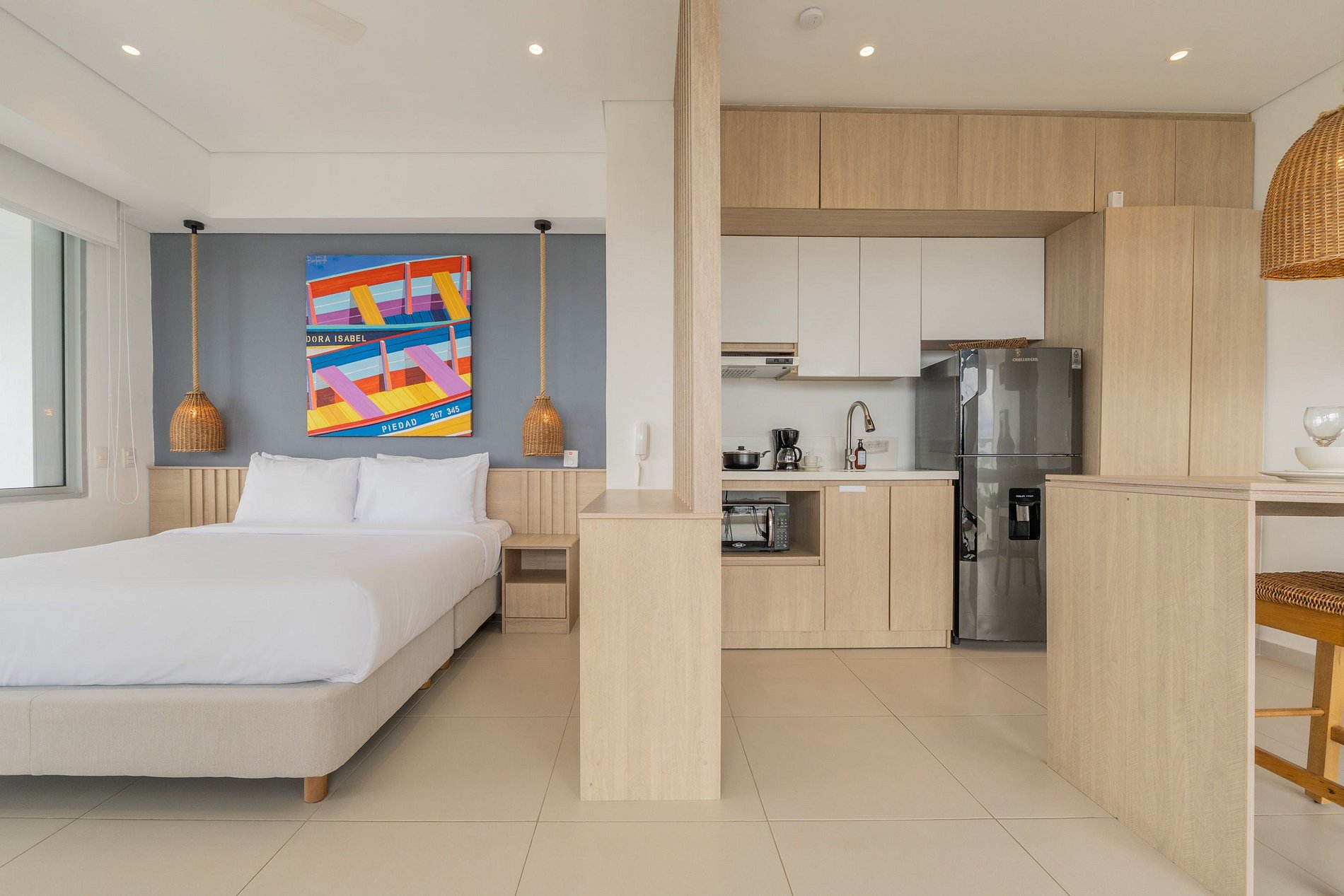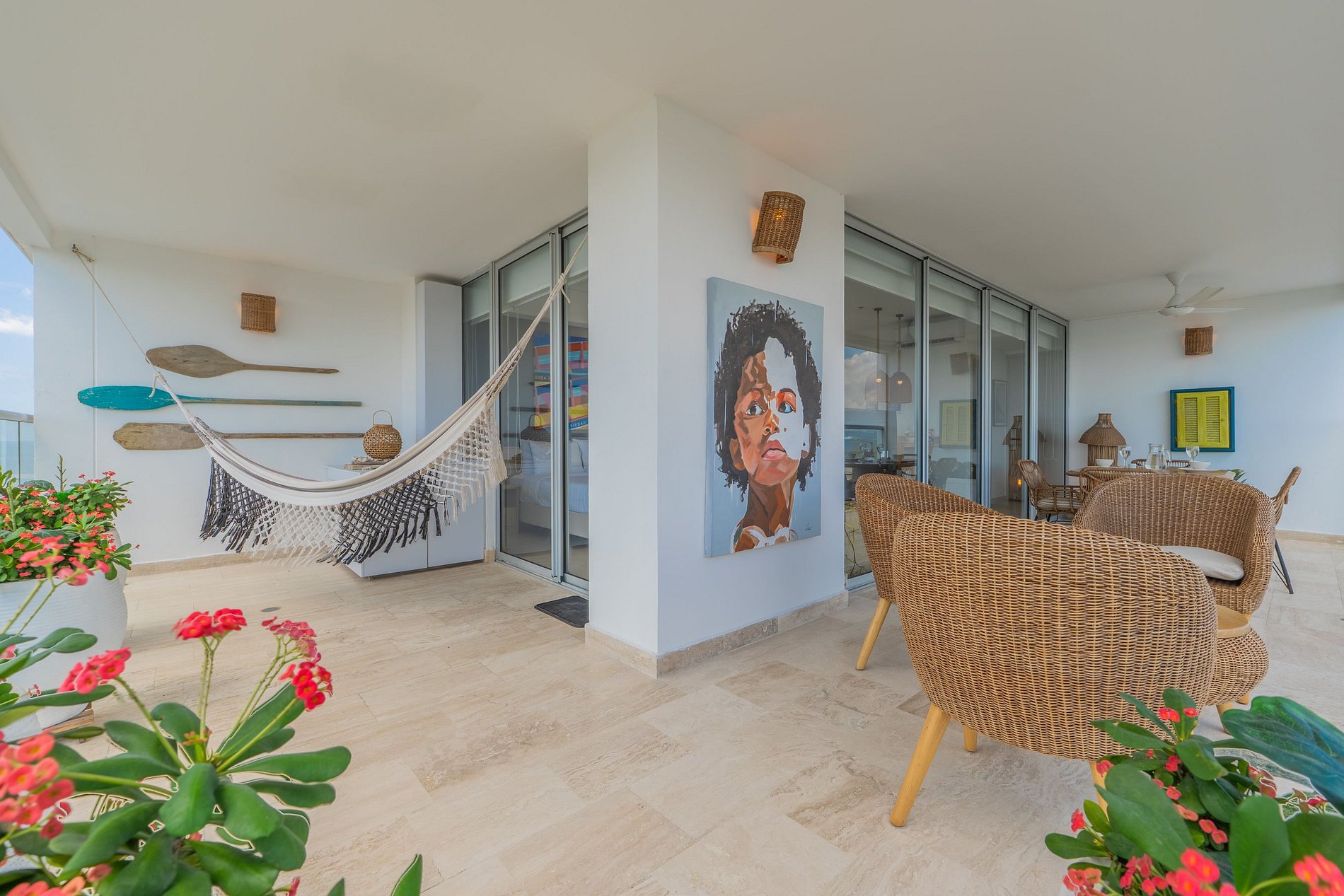 Moderno apartamento con cama queen y cocina equipada. Destaca su amplio balcón panorámico con hamaca y comedor exterior con vista al mar. Ideal para relajarse y disfrutar Cartagena con total confort.