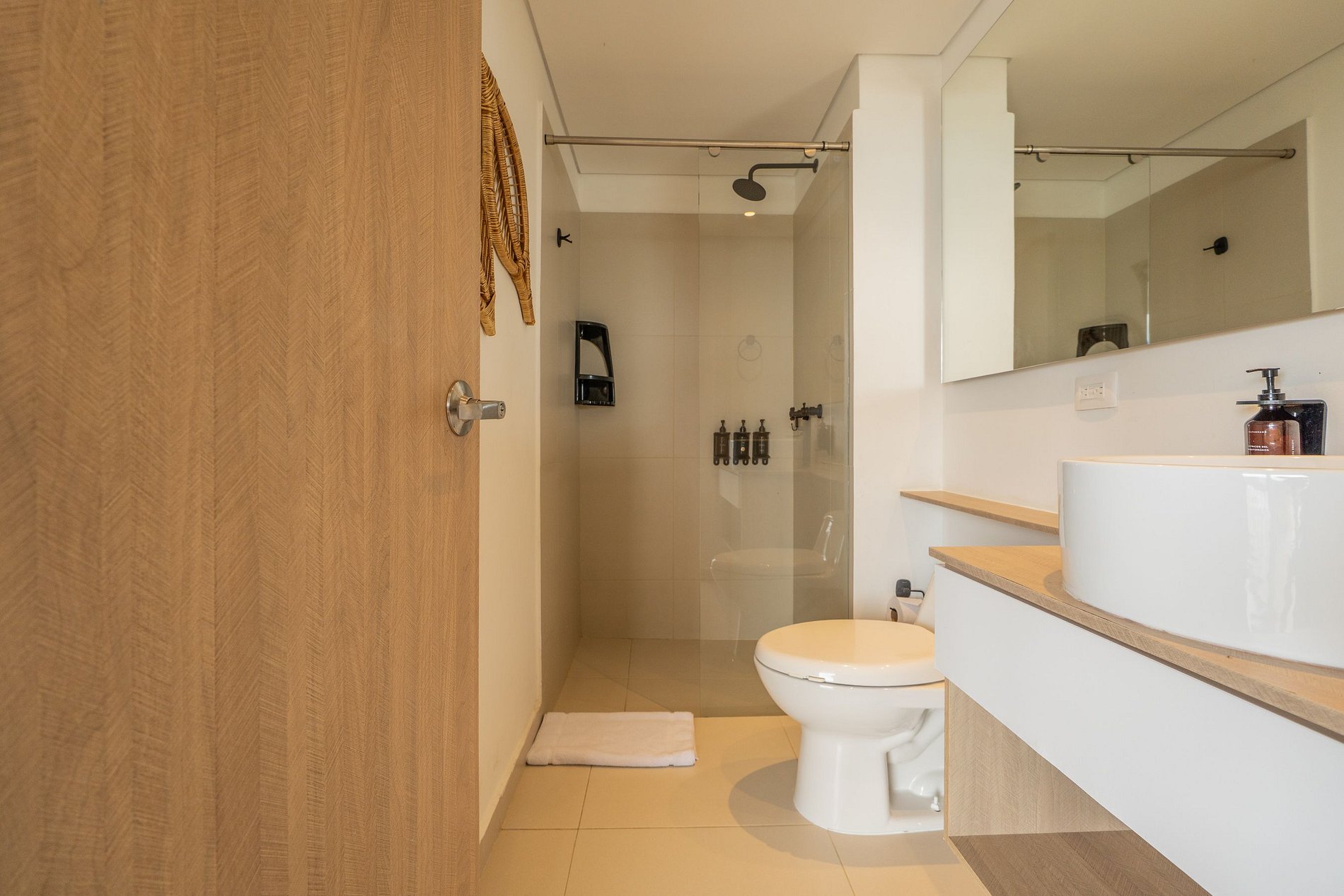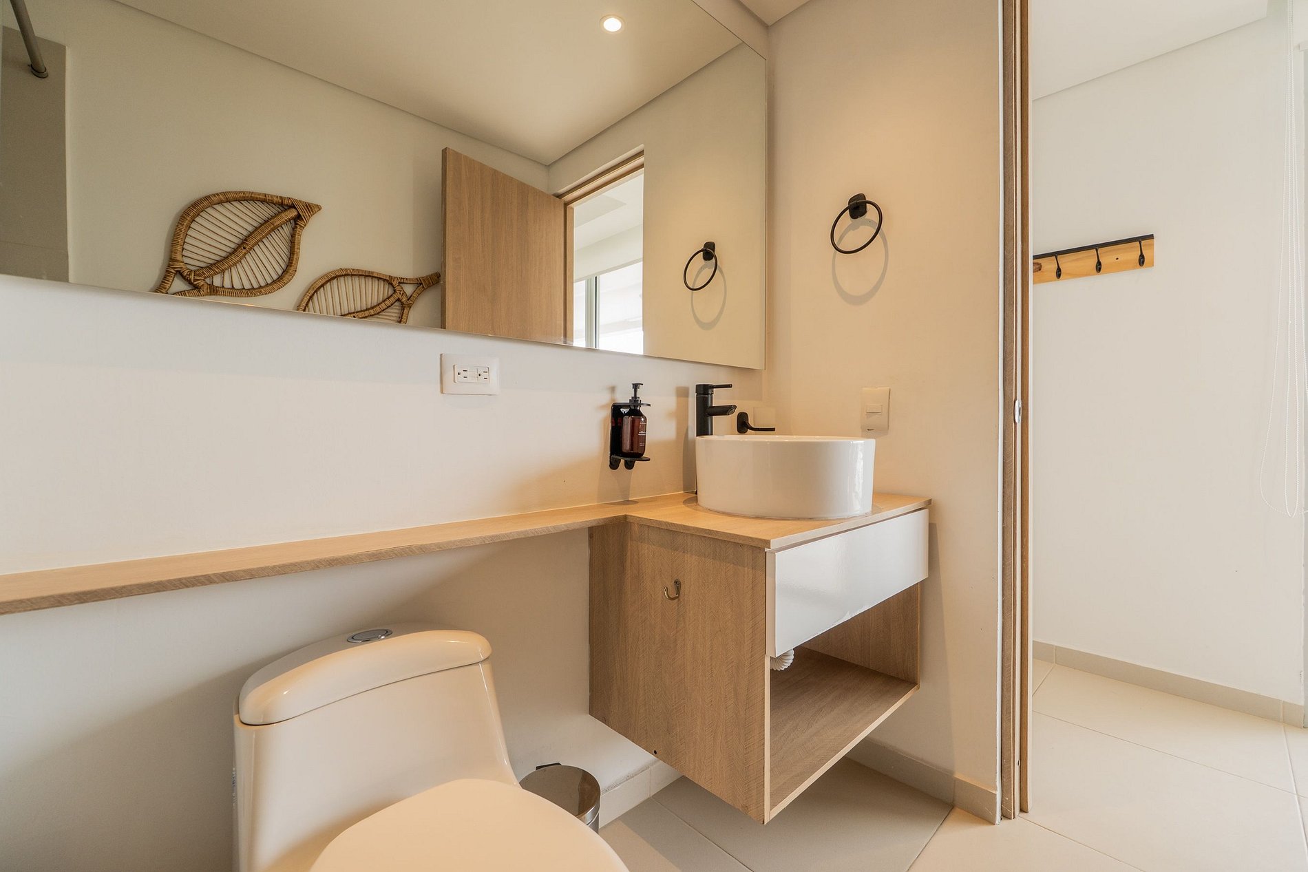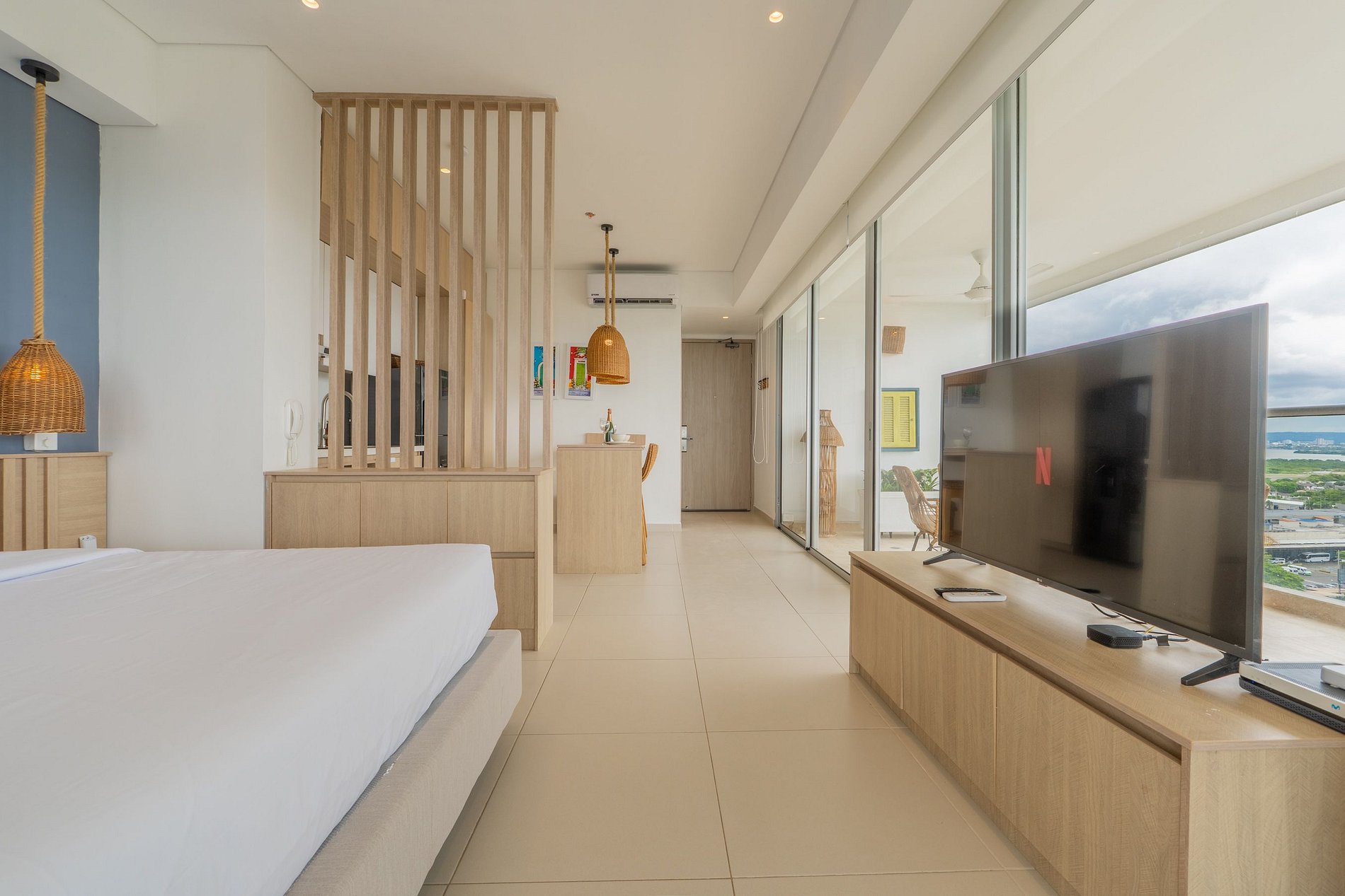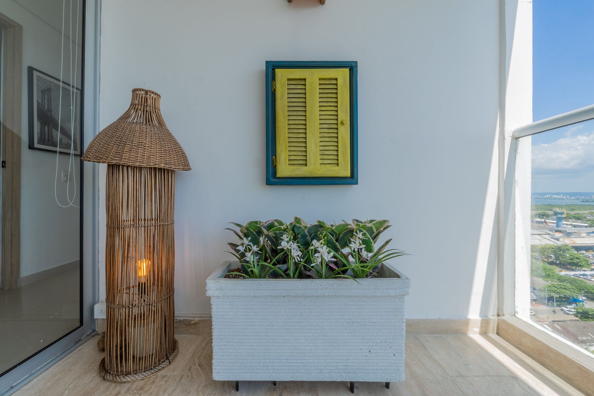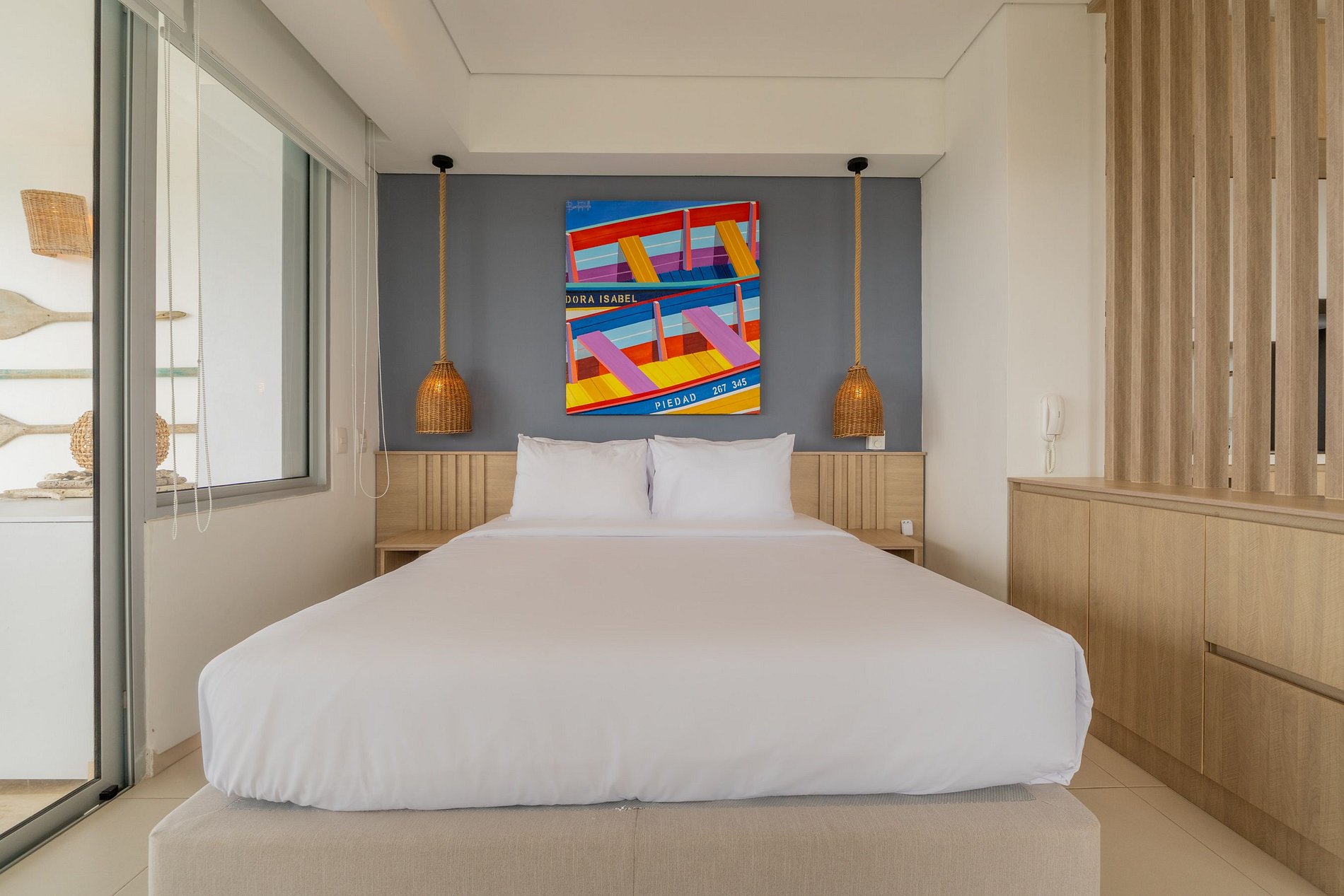 Moderno apartamento con cama queen y cocina equipada. Destaca su amplio balcón panorámico con hamaca y comedor exterior con vista al mar. Ideal para relajarse y disfrutar Cartagena con total confort.