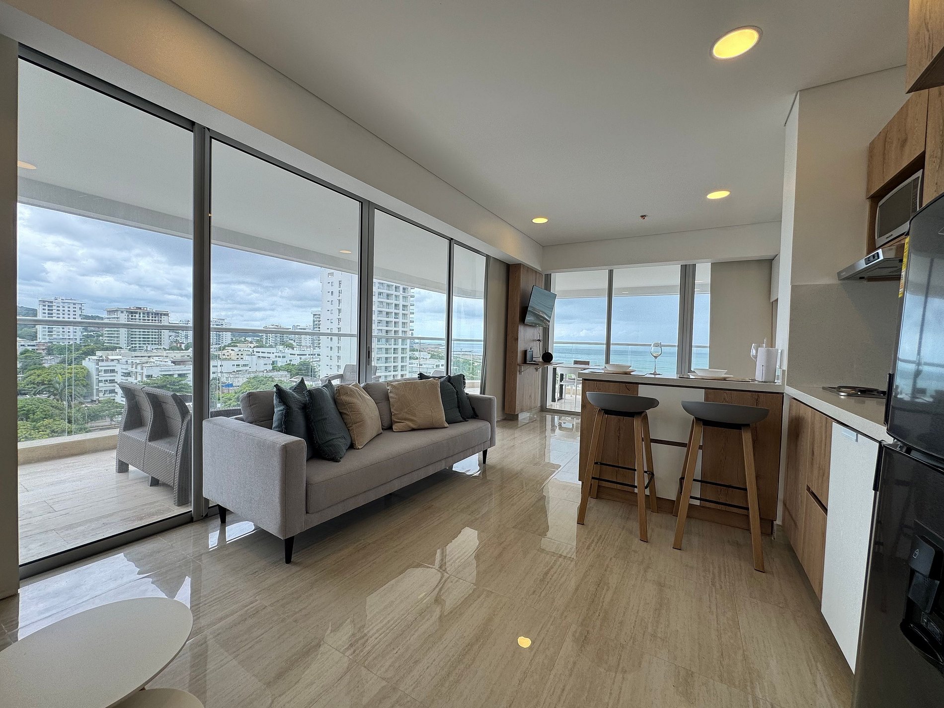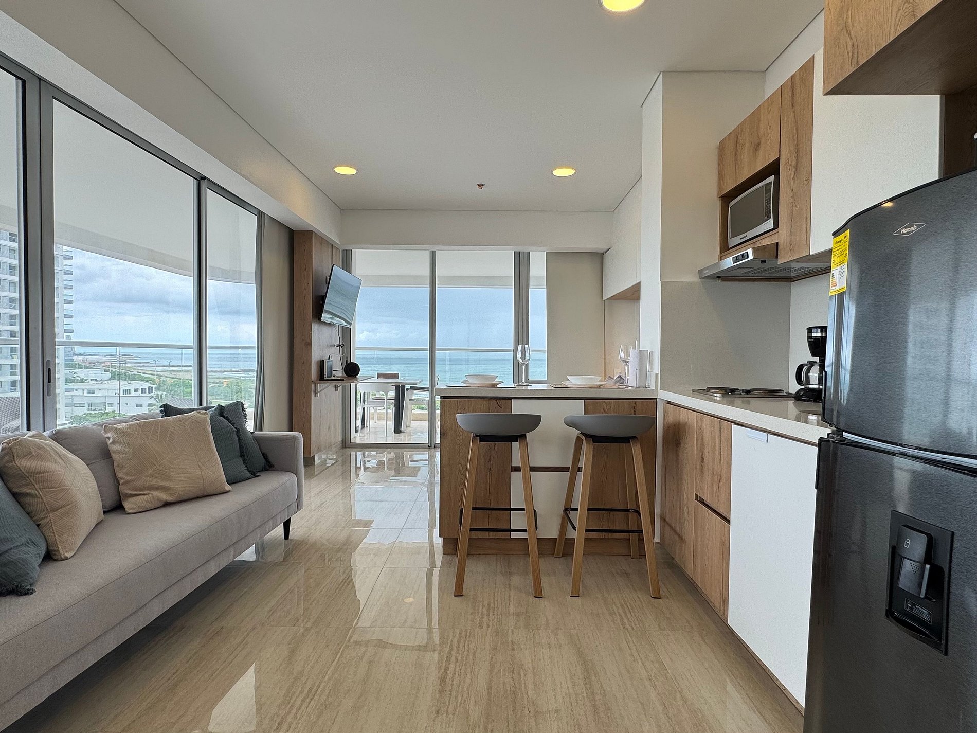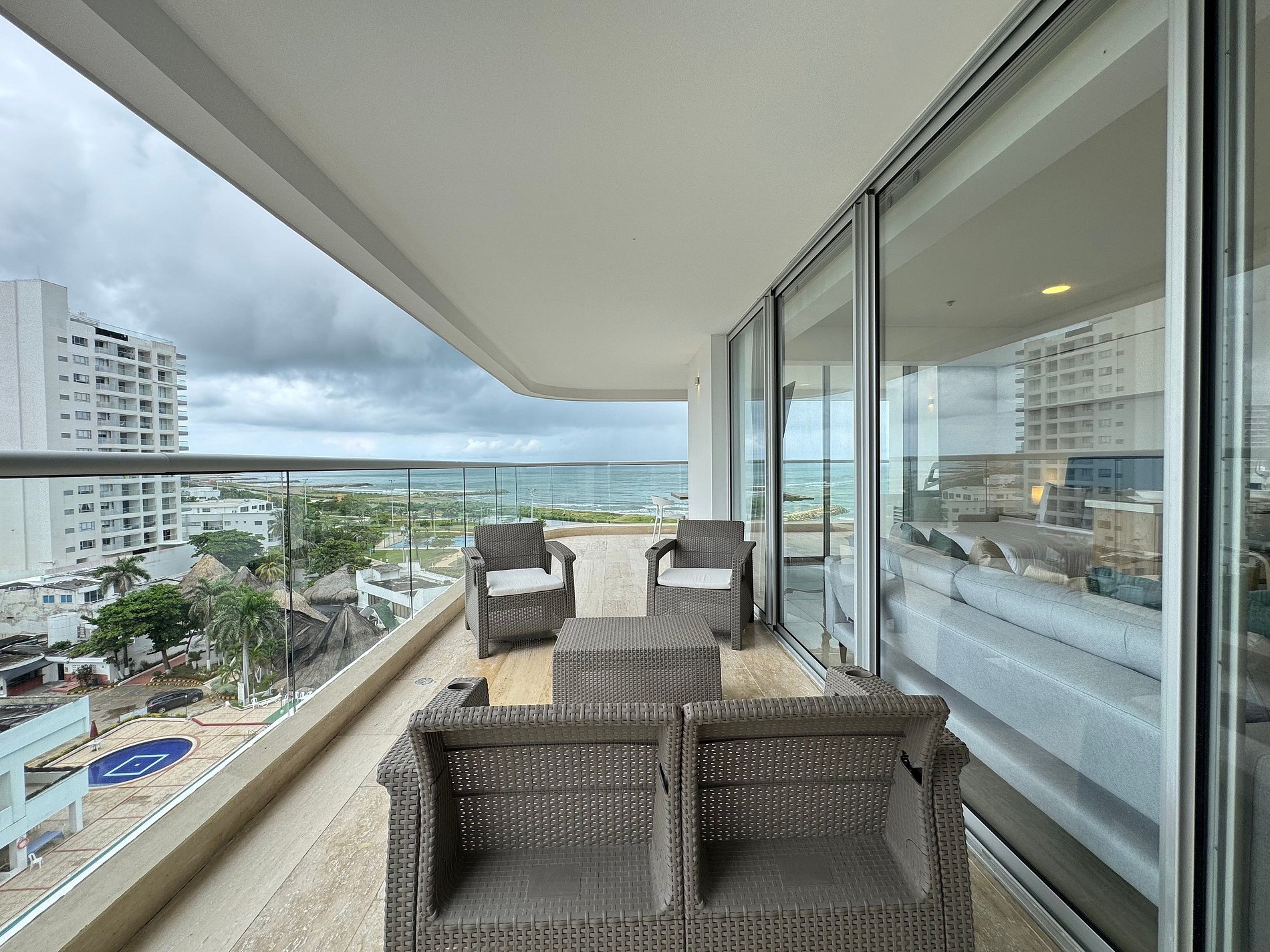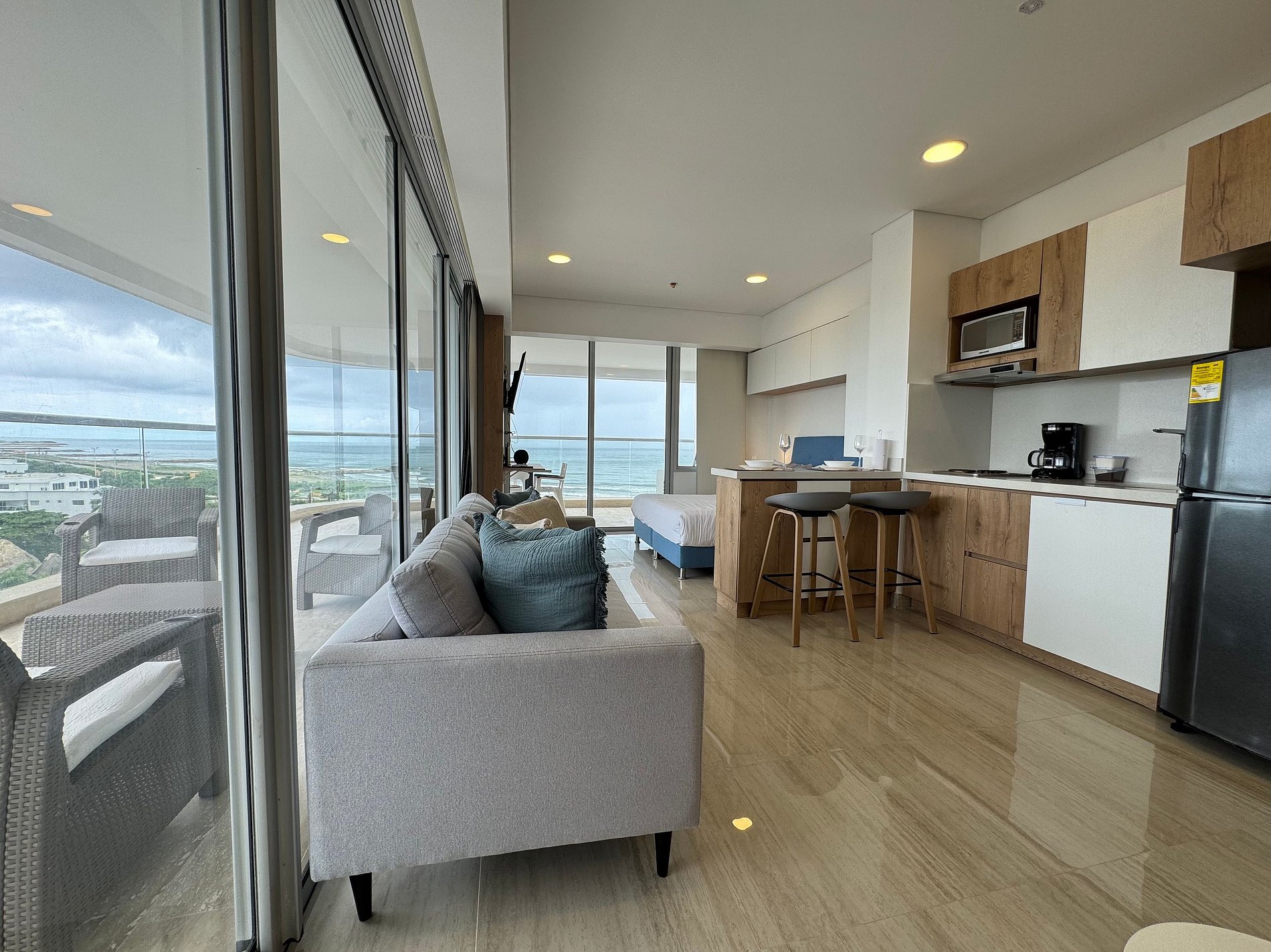 Moderno apartamento con cama Queen, sofá cama y cocina equipada. Destaca su amplio balcón panorámico con sala exterior con vista al mar. Ideal para relajarse y disfrutar Cartagena con total confort.
