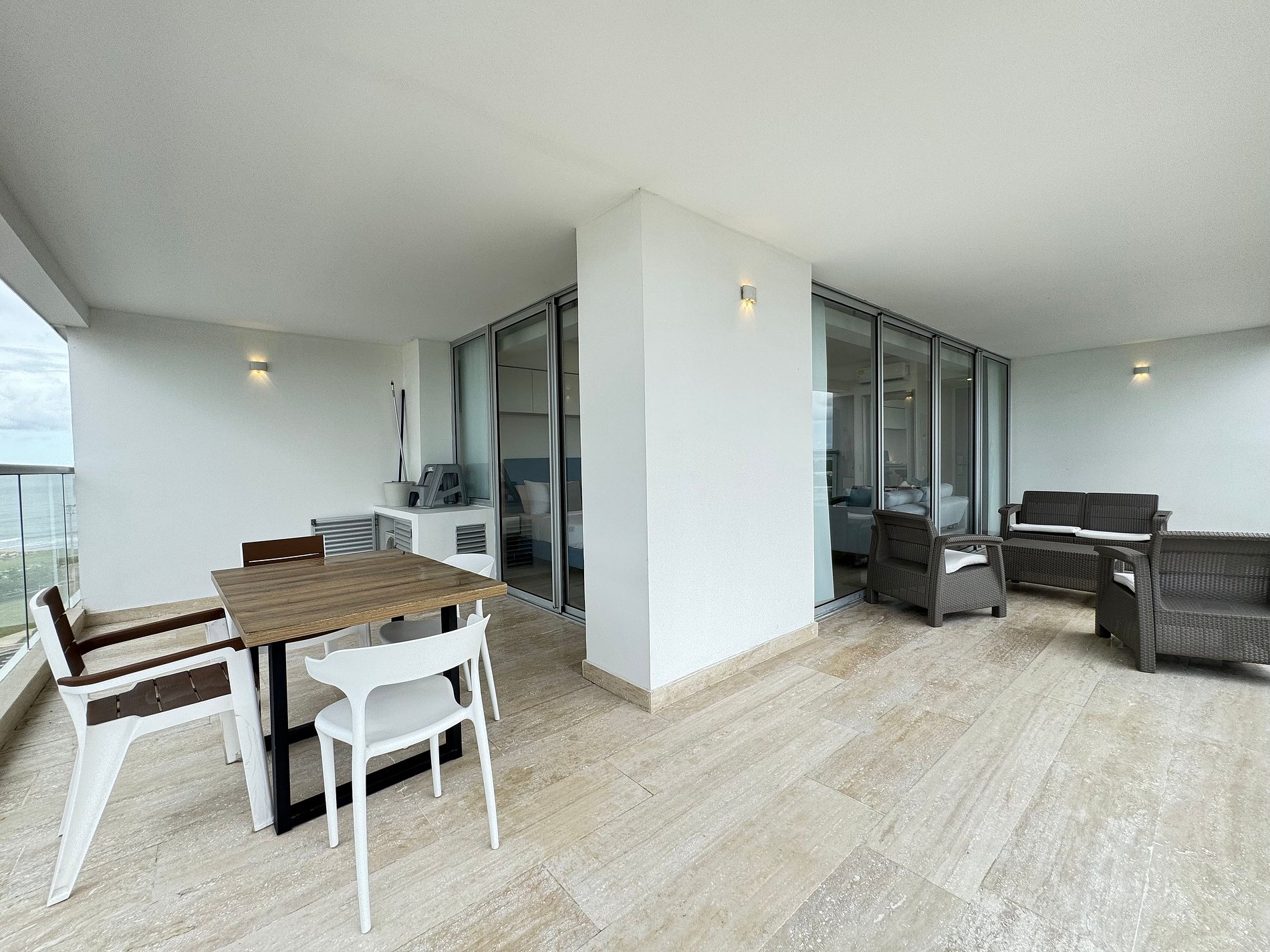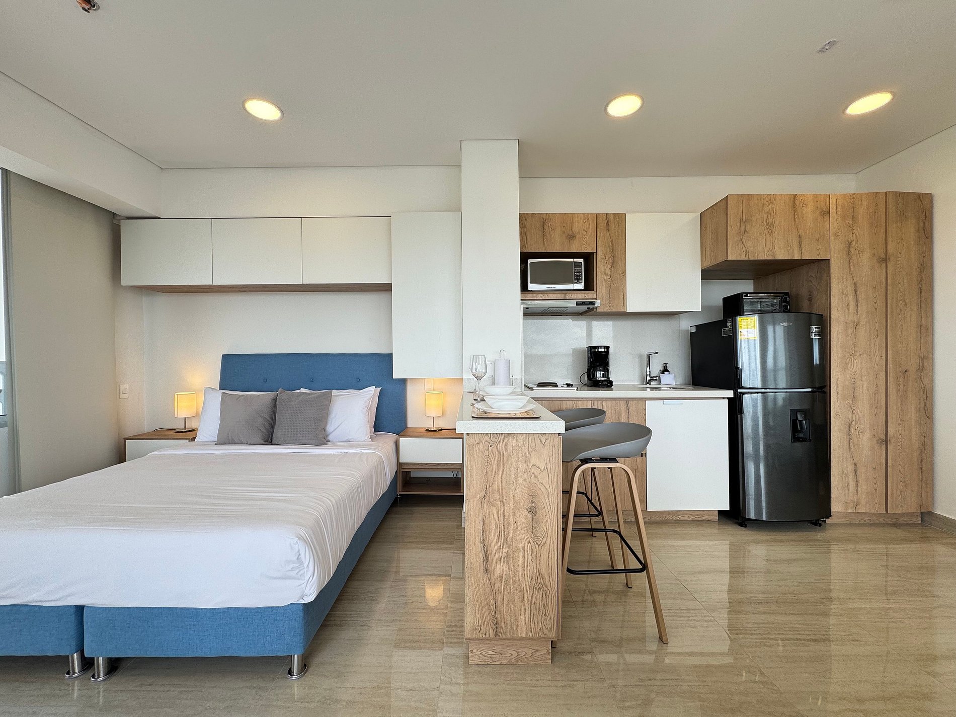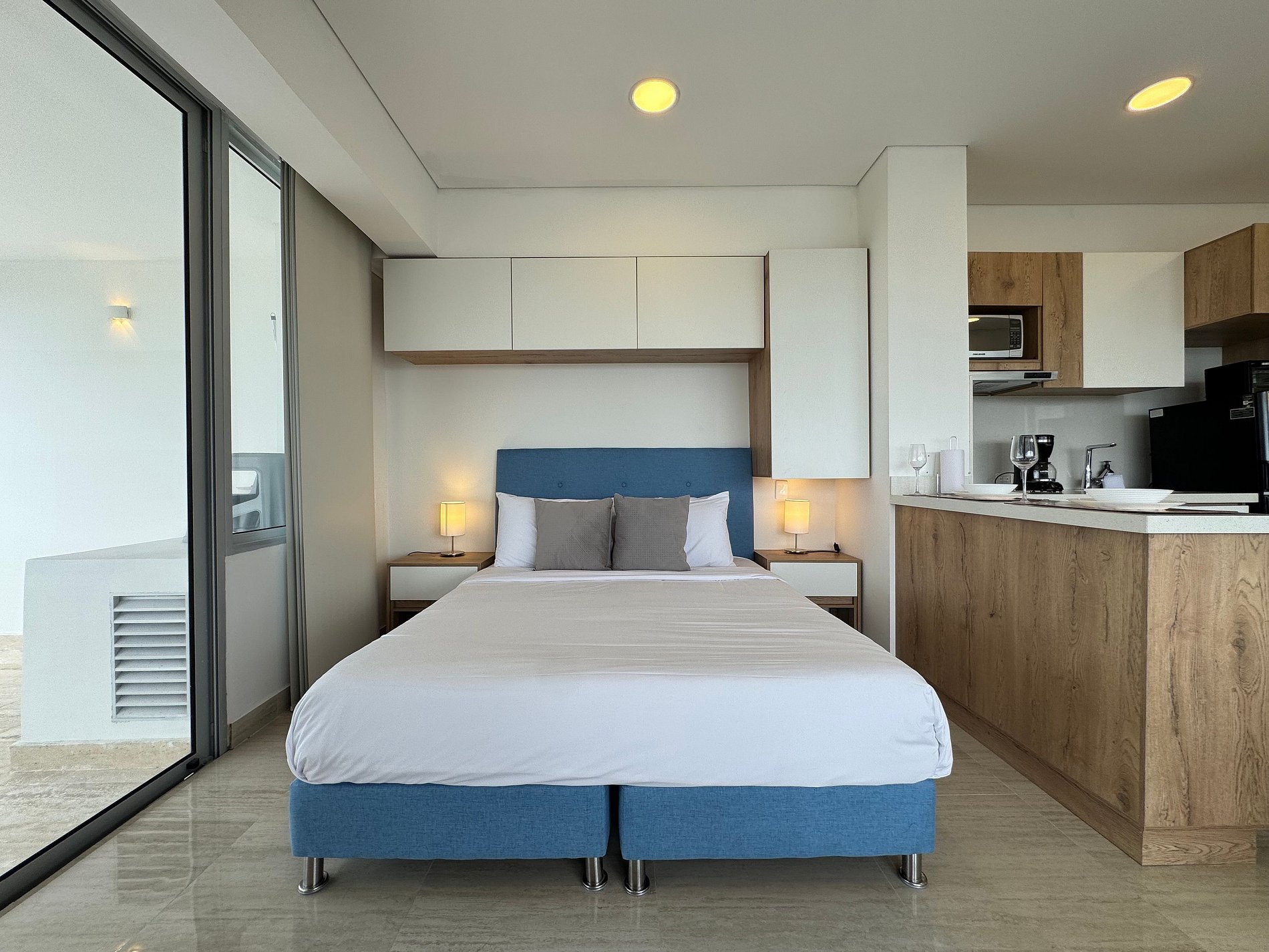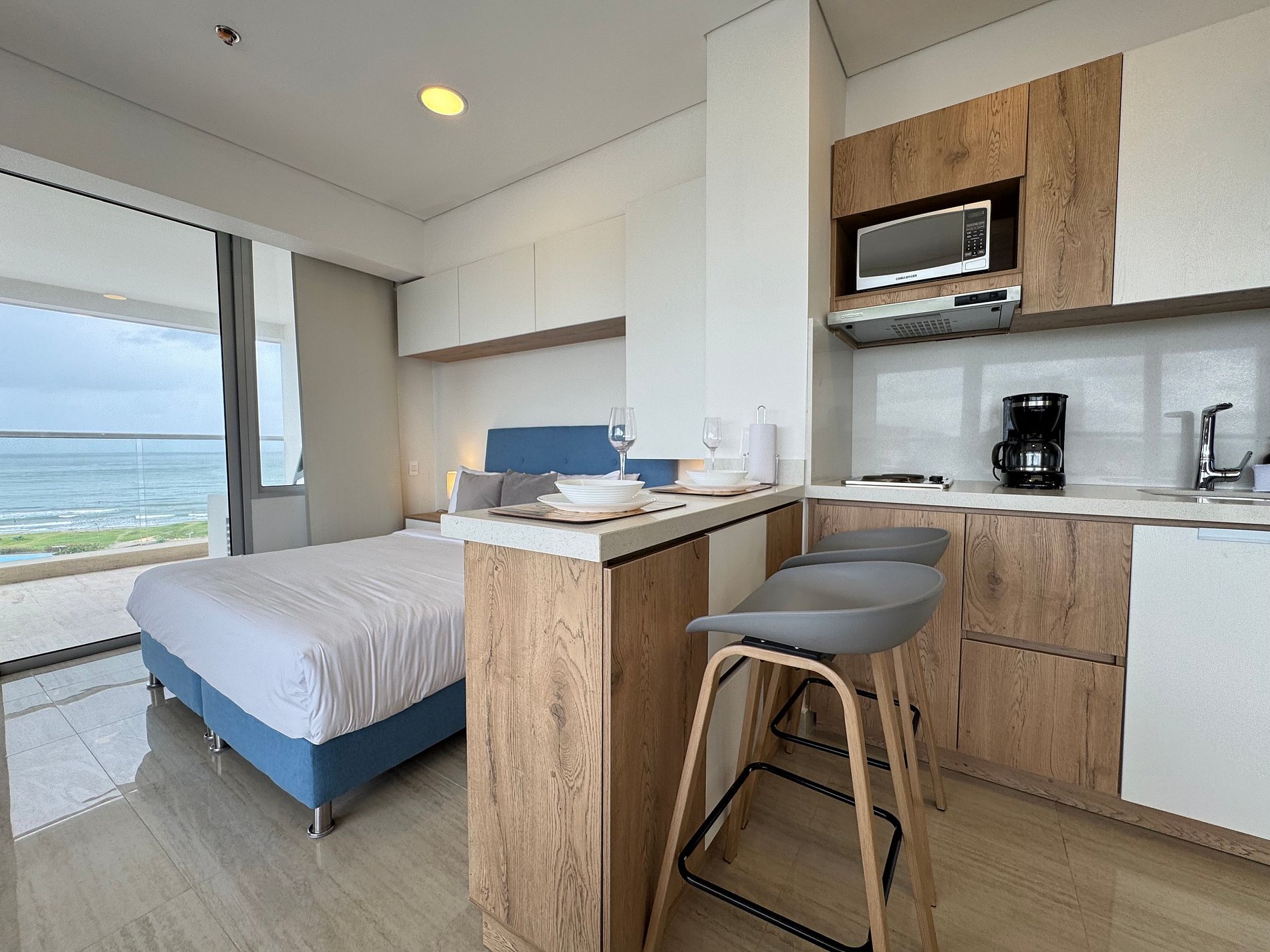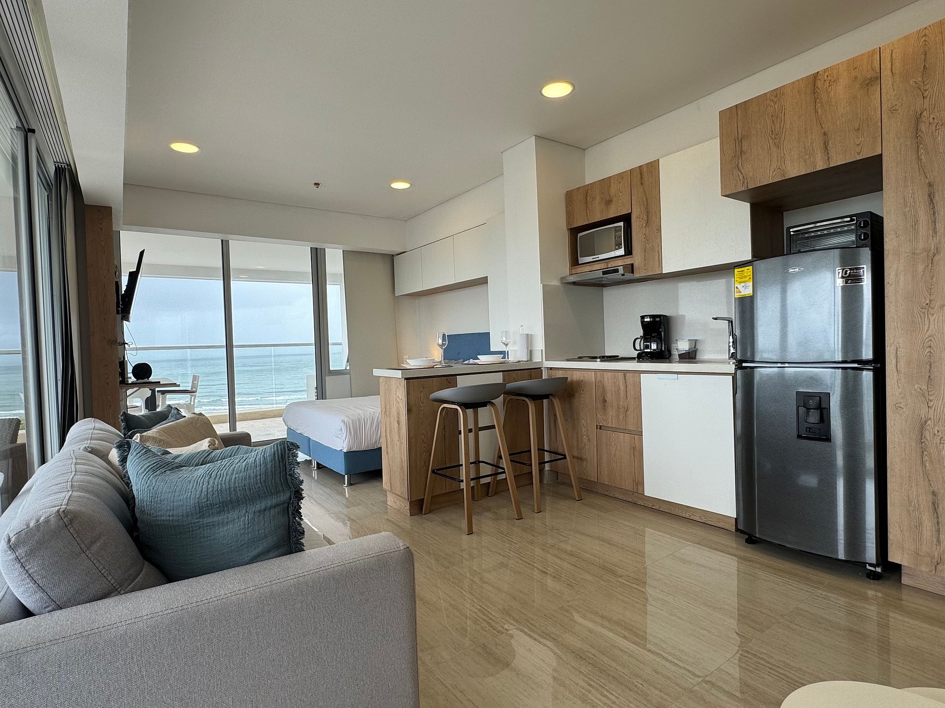 Moderno apartamento con cama Queen, sofá cama y cocina equipada. Destaca su amplio balcón panorámico con sala exterior con vista al mar. Ideal para relajarse y disfrutar Cartagena con total confort.