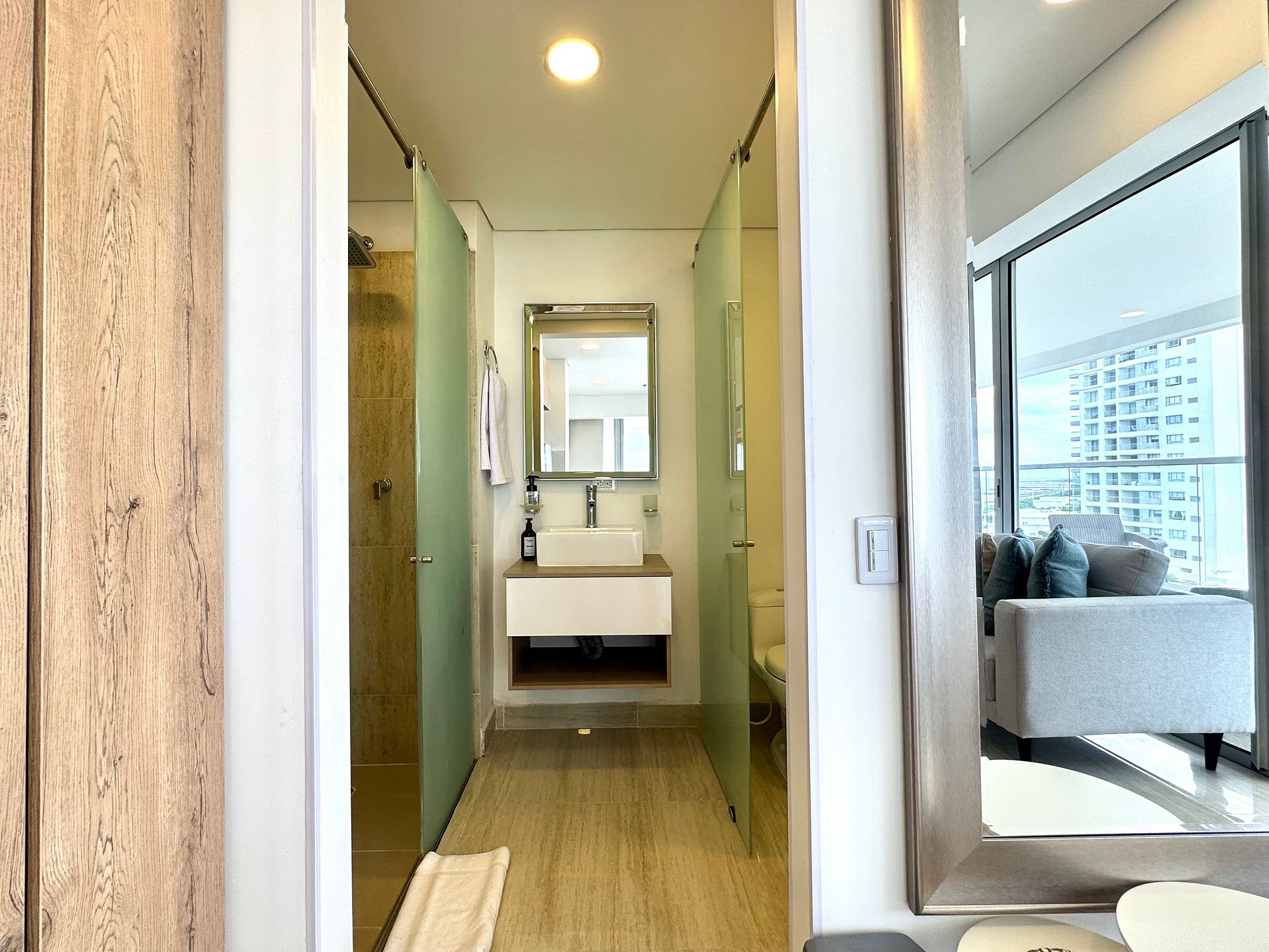 Disfruta de un espacio único en este apartamento con balcón panorámico y sala comoda frente al mar. Cuenta con cama Queen, sofá cama, cocina totalmente equipada, aire acondicionado, Smart TV. El amplio balcón es ideal para relajarte, desayunar al aire libre o disfrutar de la brisa caribeña con una vista espectacular. Ubicado en el moderno edificio Cartagena Beach, a pocos minutos del aeropuerto y de las principales playas, es perfecto para viajes de descanso, familia o trabajo
