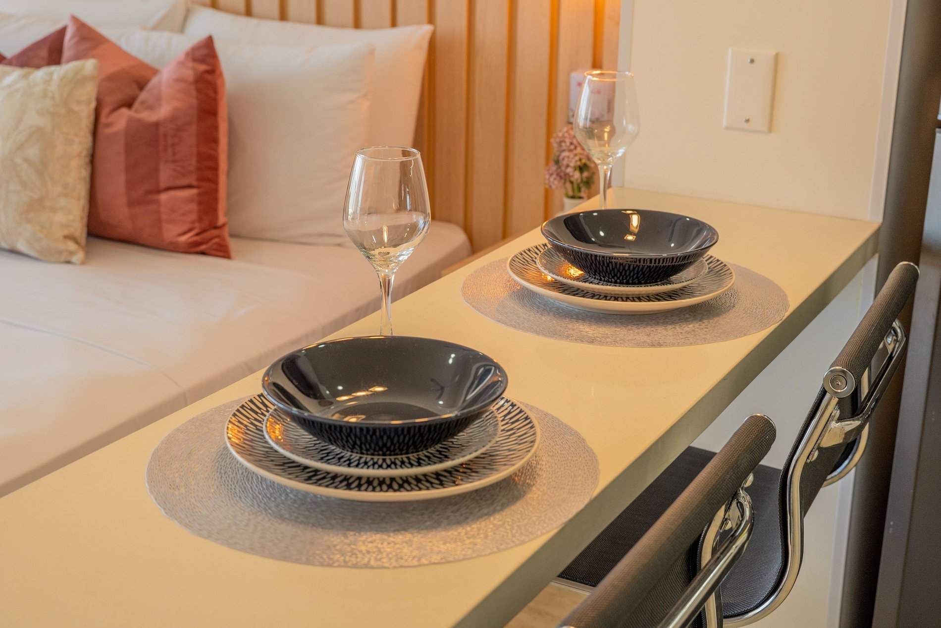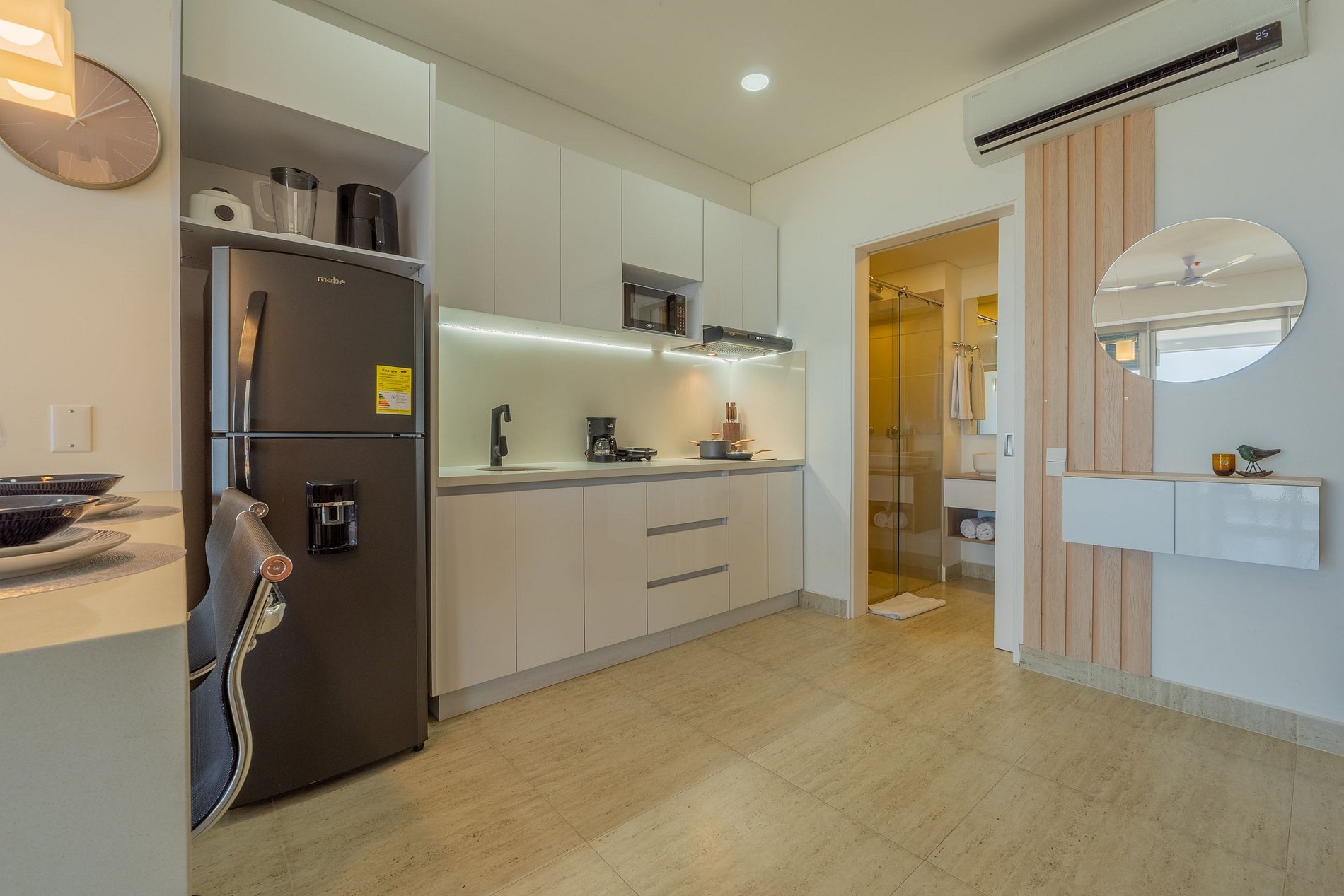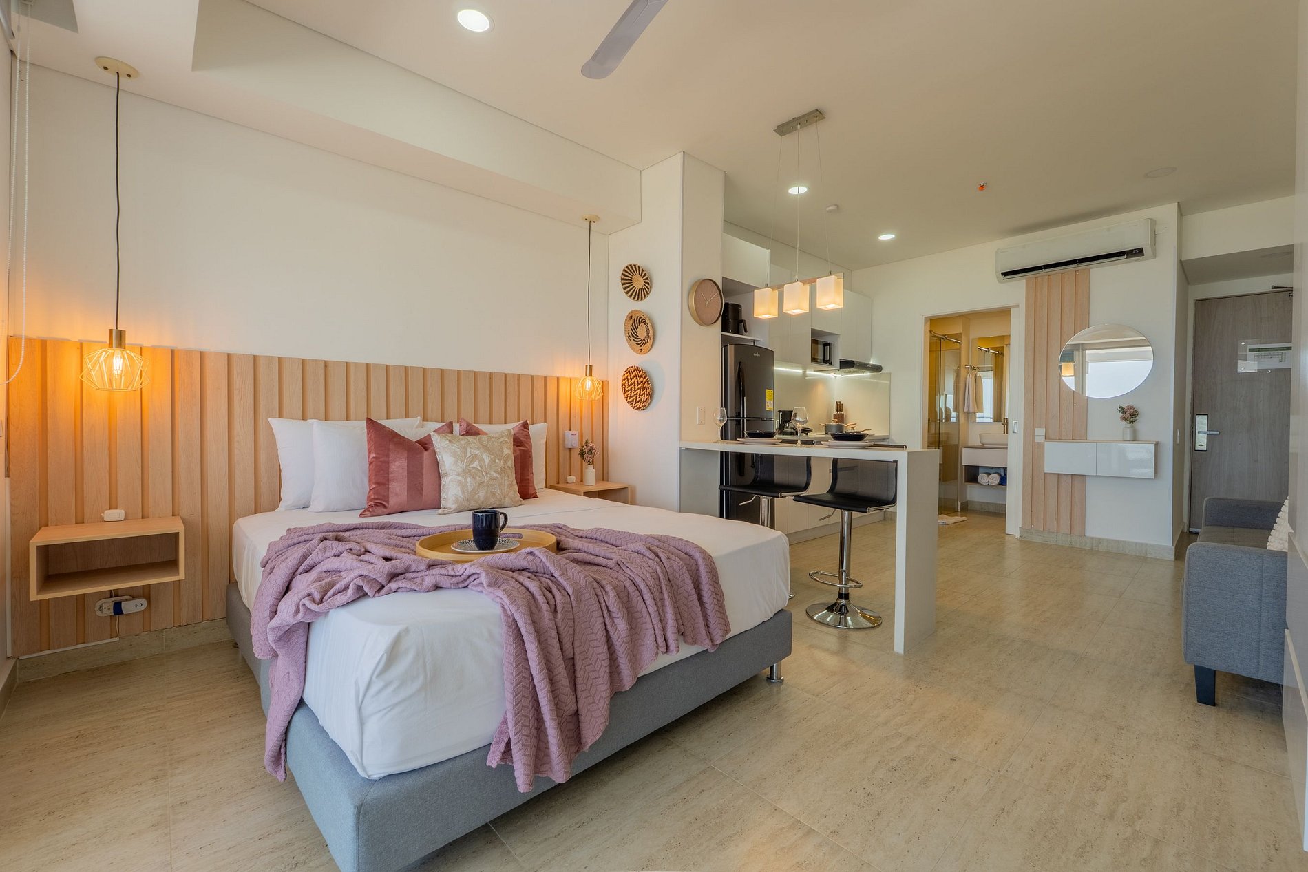 En el piso 9, esta suite boho moderna ofrece un espacio lleno de luz natural, con acabados cálidos en madera y un estilo acogedor. Disfruta de cama Queen con ropa de alta calidad, Smart TV, aire acondicionado y blackout. Cocina equipada con nevera, microondas, cafetera, licuadora y menaje completo. Balcón amoblado con mesa y sillas para contemplar el mar. Baño moderno con ducha amplia y amenities. El edificio cuenta con piscina, jacuzzi, sauna, turco, spa y recepción 24/7, frente a la playa.