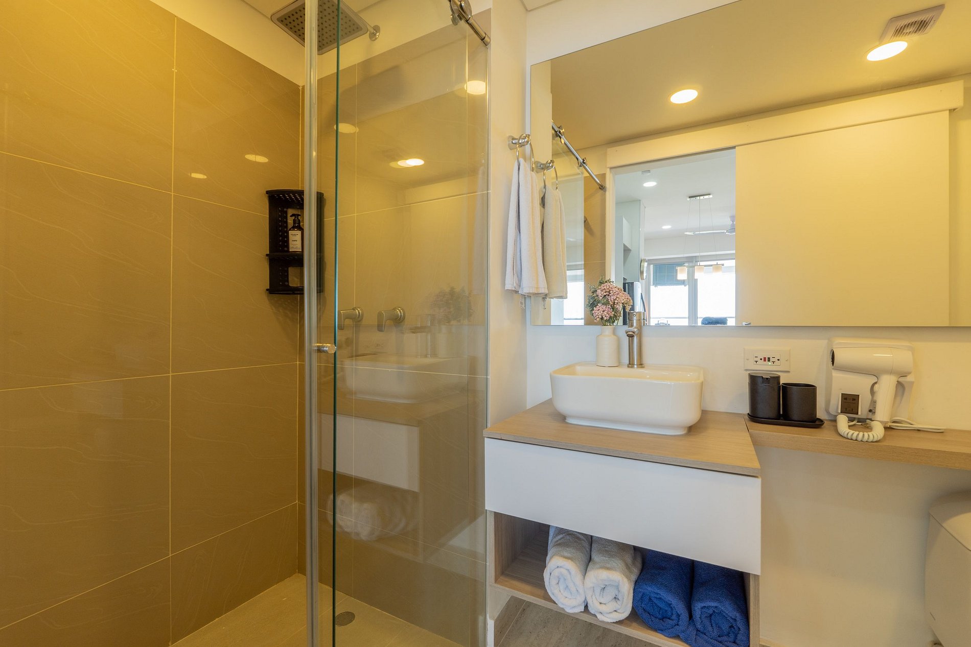 • Baño moderno con ducha amplia y amenities