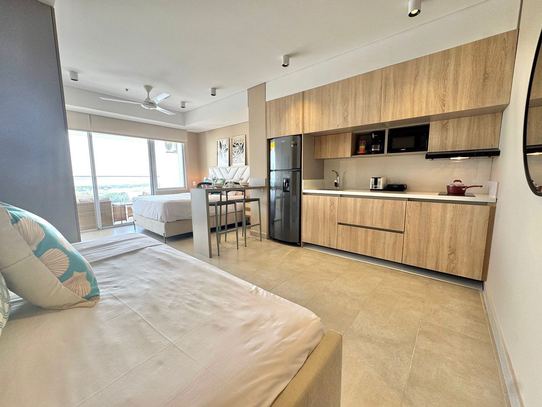 Lujosa suite en piso 14 con cama Queen, sofá cama, cocina equipada, baño moderno y balcón privado con vista a la ciénaga, la ciudad y el aeropuerto. Ideal para descansar o trabajar con wifi de alta velocidad.