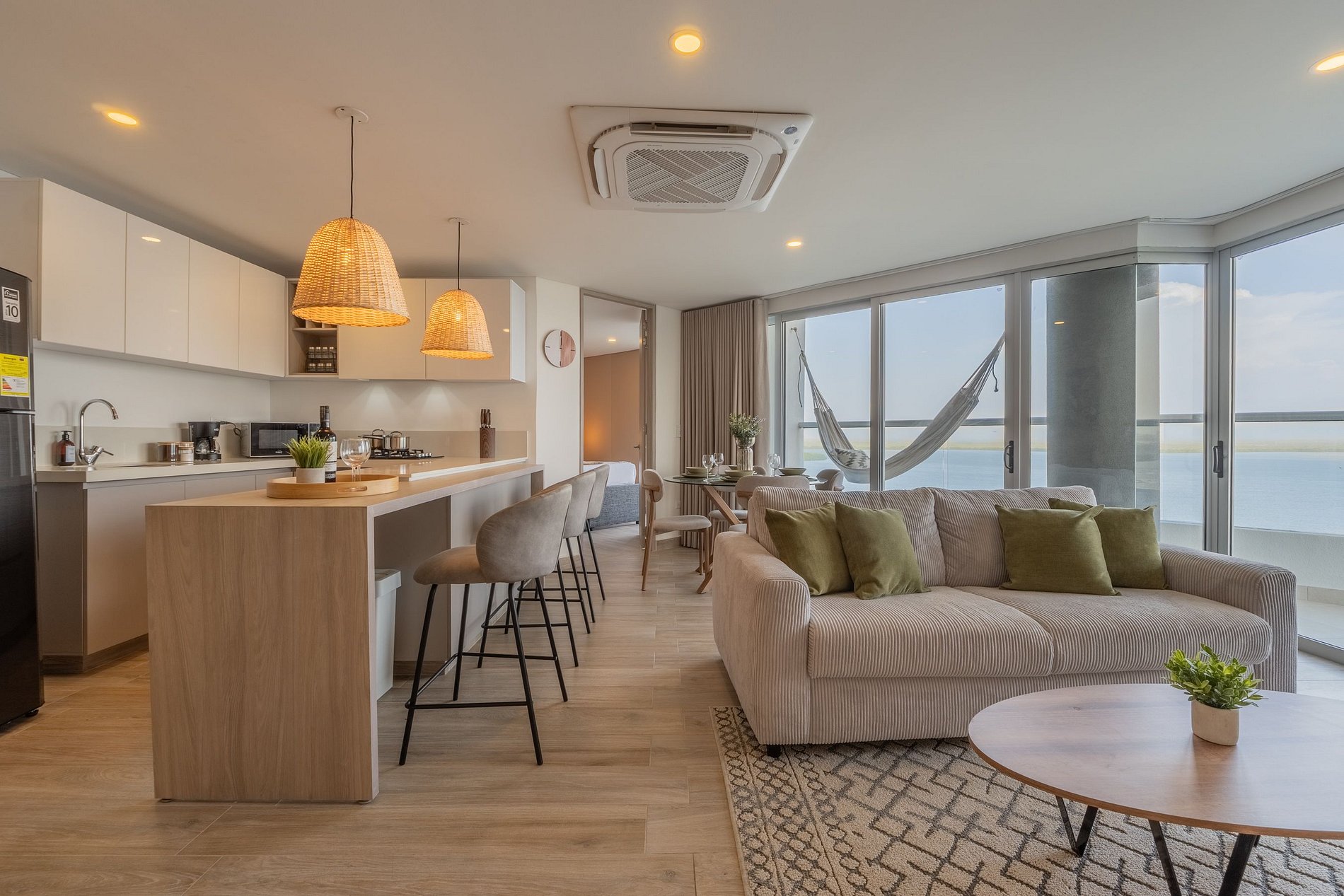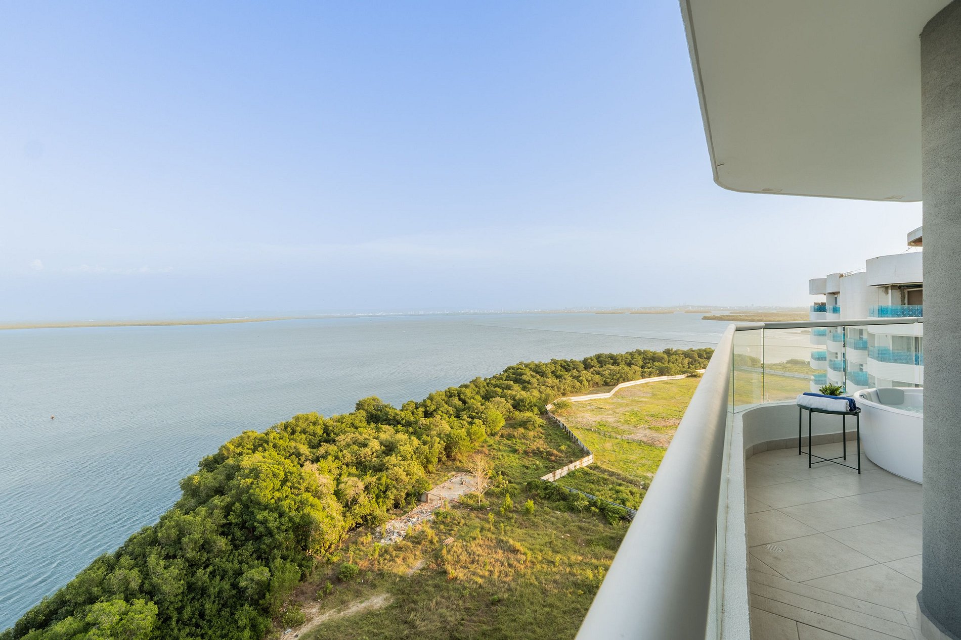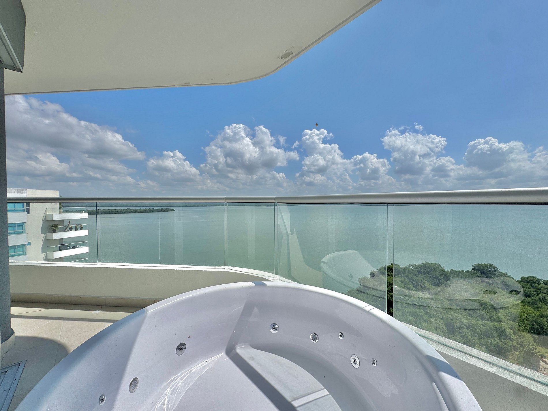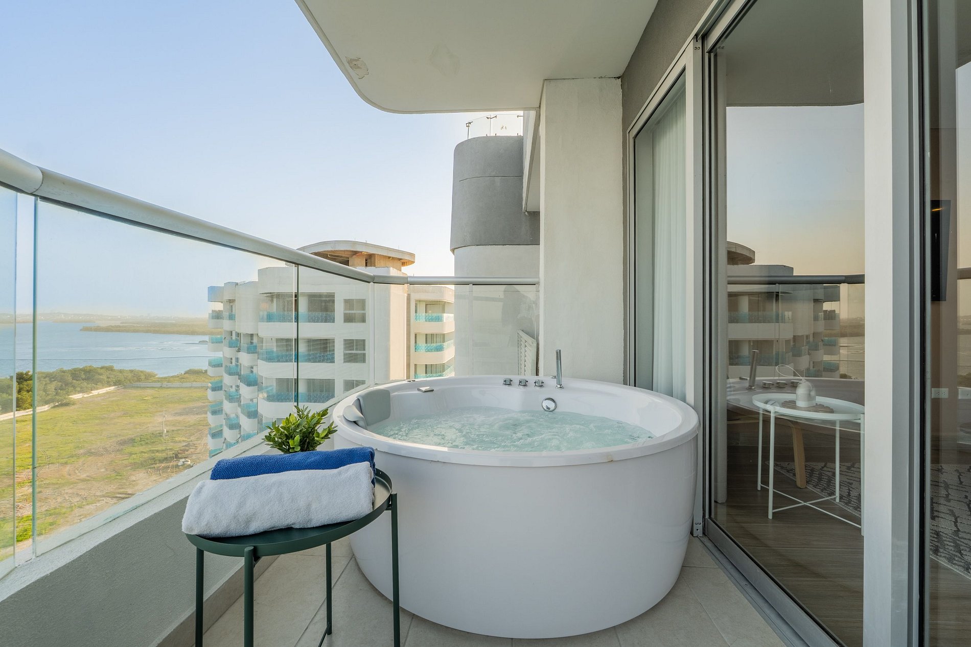 Apartamento premium de 2 habitaciones con vista espectacular a la Ciénaga de la Virgen. Disfruta balcón amplio con jacuzzi privado para dos, naturaleza y amaneceres, con el plus de ver despegar y aterrizar aviones a lo lejos sin ruido molesto. Cuenta con cocina totalmente equipada, zona de lavandería (lavadora y secadora), agua caliente e internet de alta velocidad. Ideal para familias o parejas que buscan comodidad y privacidad.