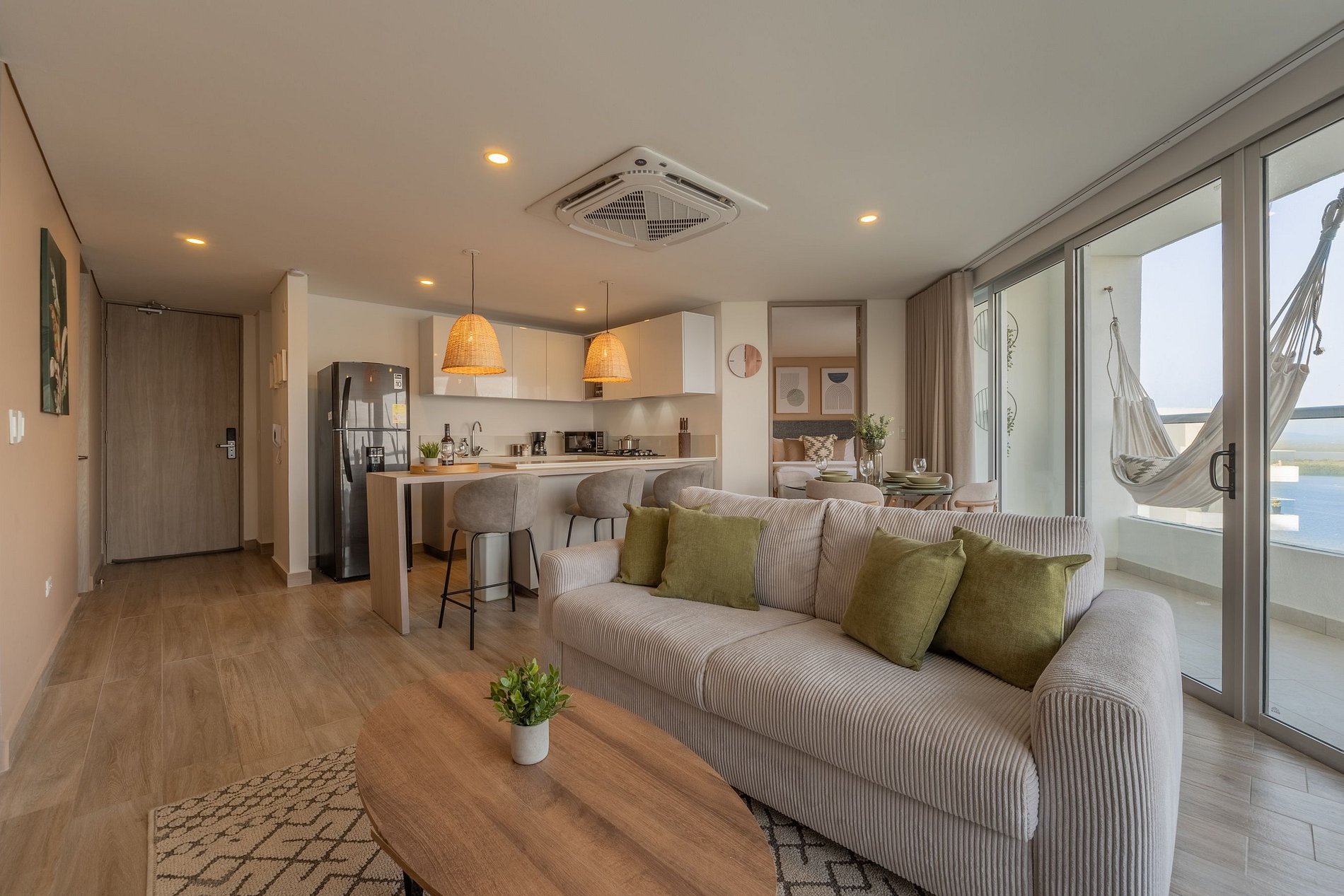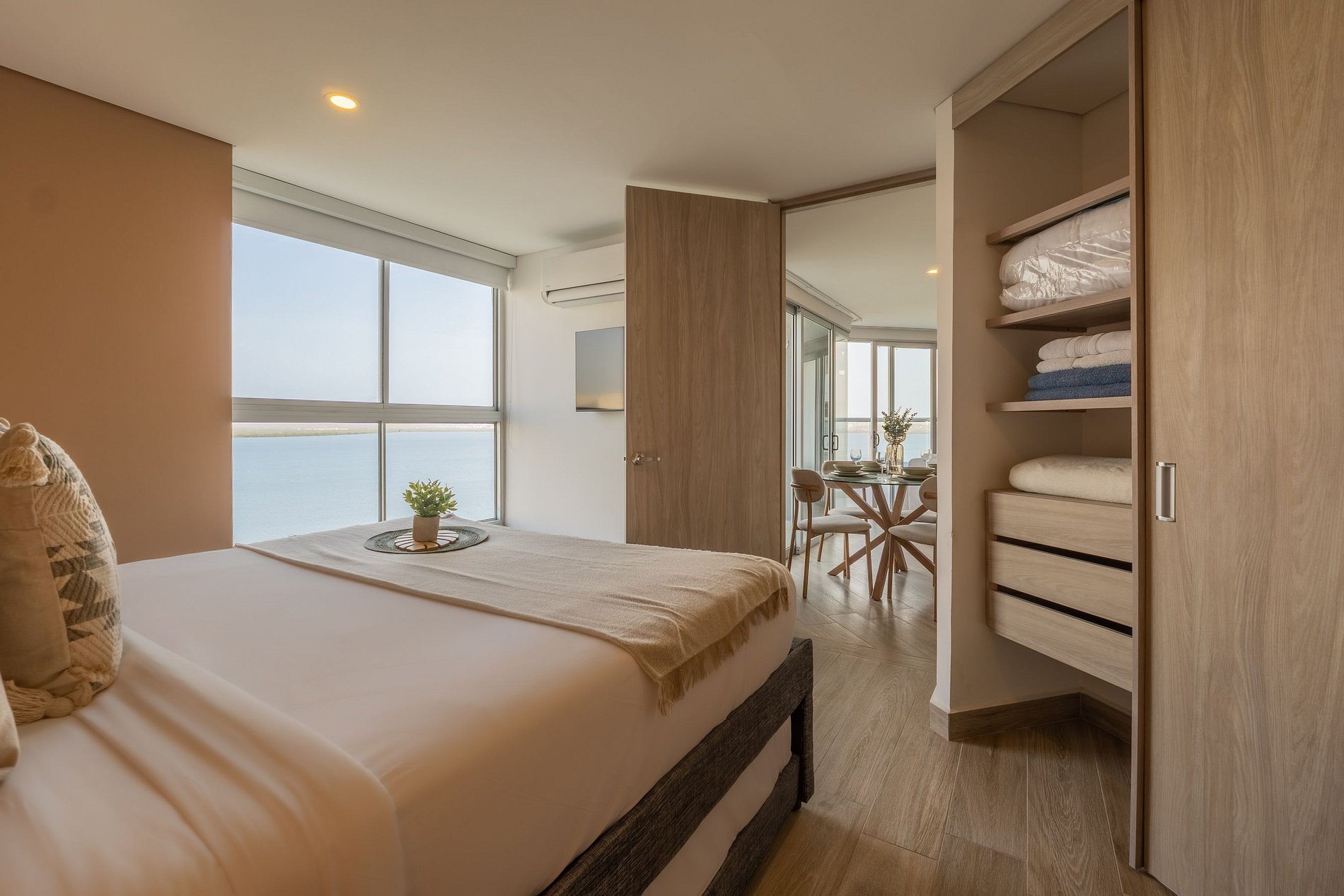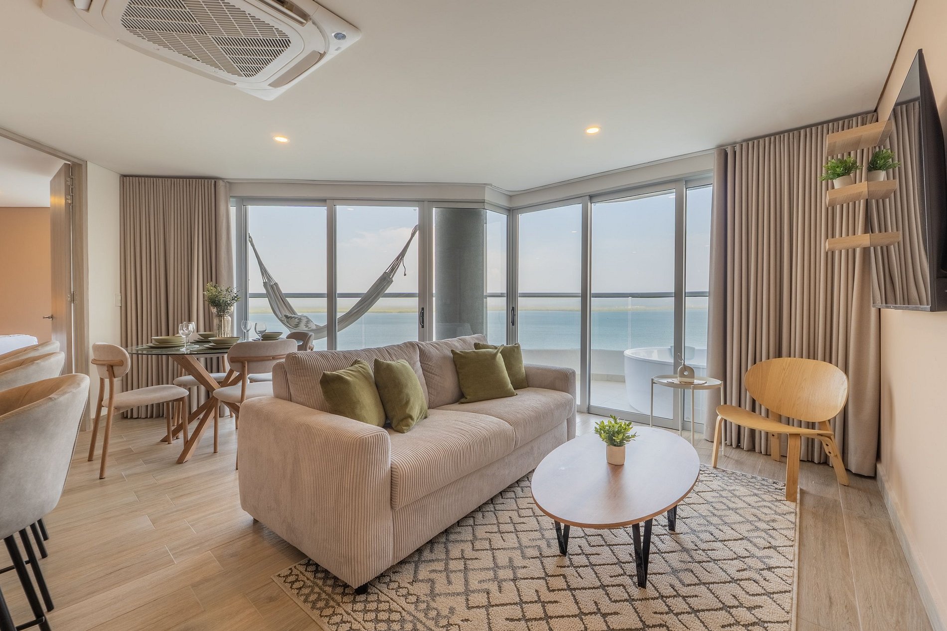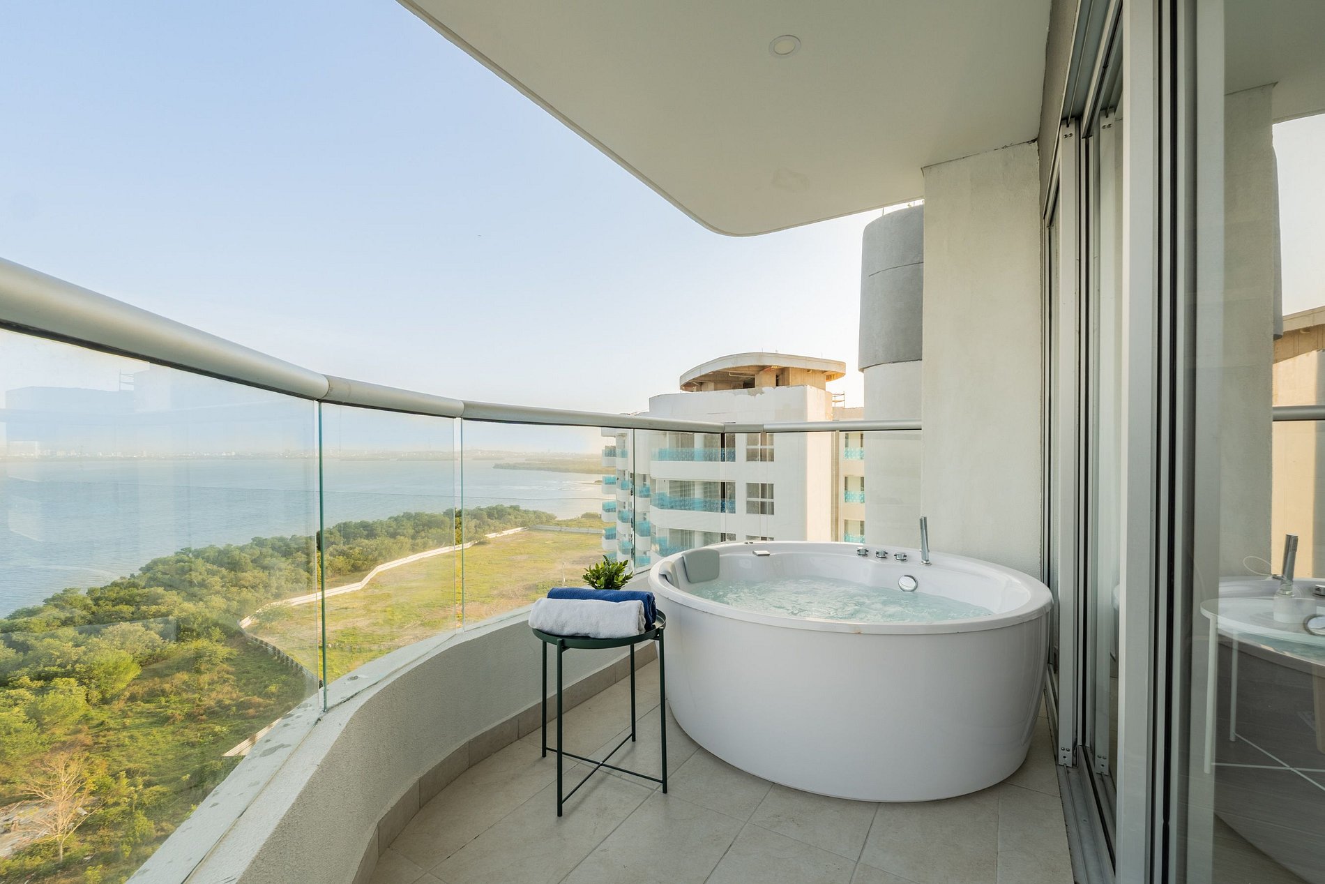 Apartamento premium de 2 habitaciones con vista espectacular a la Ciénaga de la Virgen. Disfruta balcón amplio con jacuzzi privado para dos, naturaleza y amaneceres, con el plus de ver despegar y aterrizar aviones a lo lejos sin ruido molesto. Cuenta con cocina totalmente equipada, zona de lavandería (lavadora y secadora), agua caliente e internet de alta velocidad. Ideal para familias o parejas que buscan comodidad y privacidad.