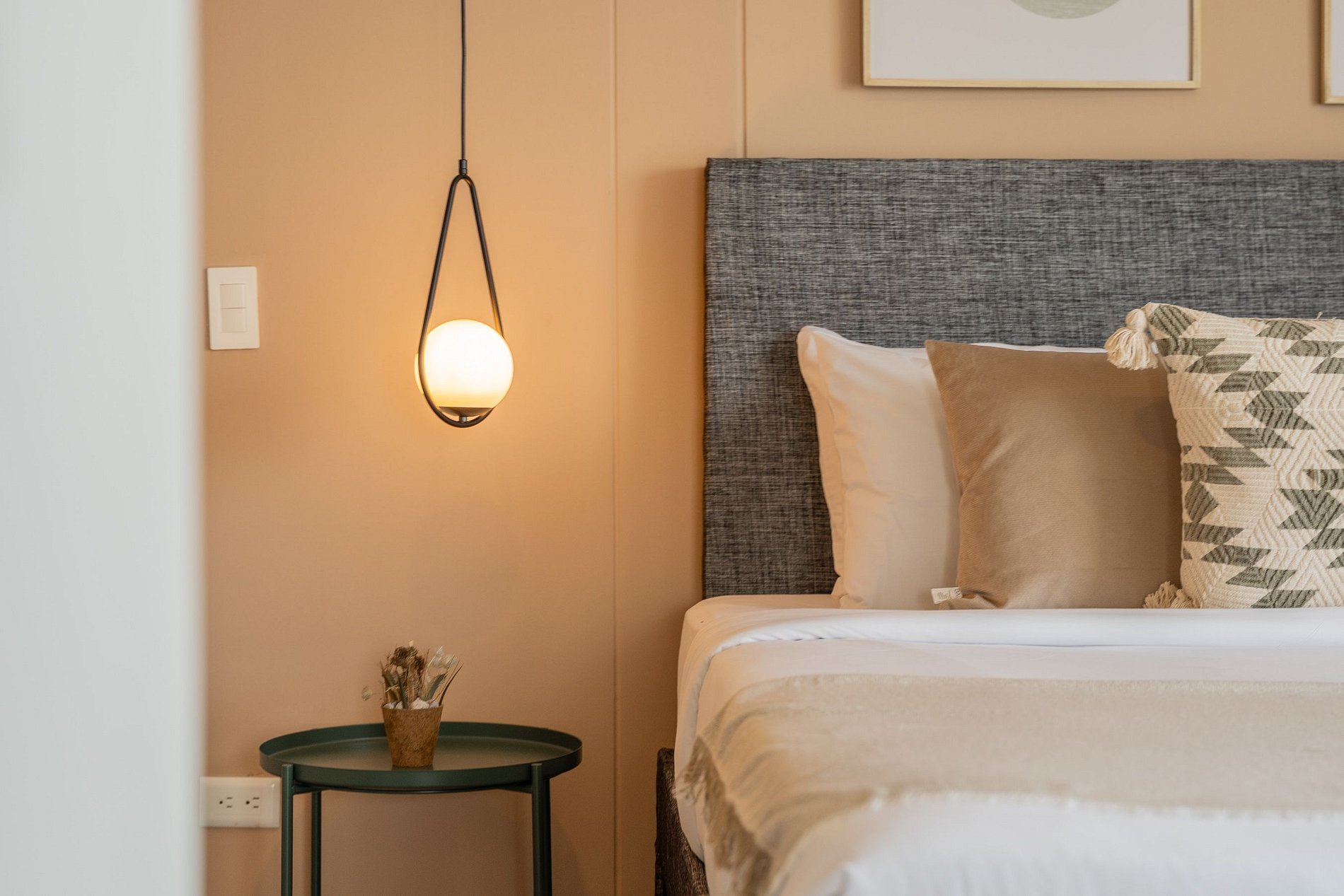 Toma de corriente eléctrica cerca de la cama
