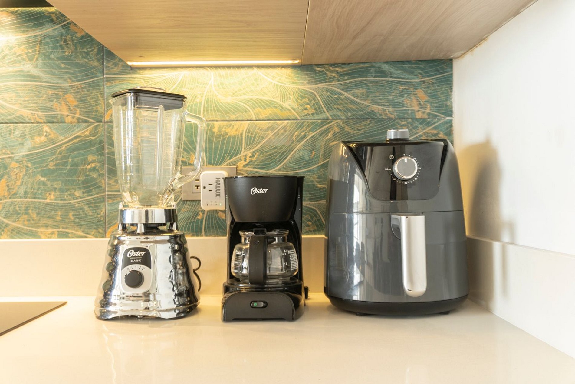 • Cocina equipada con nevera grande, estufa, microondas, horno, cafetera, licuadora, air fryer y menaje completo