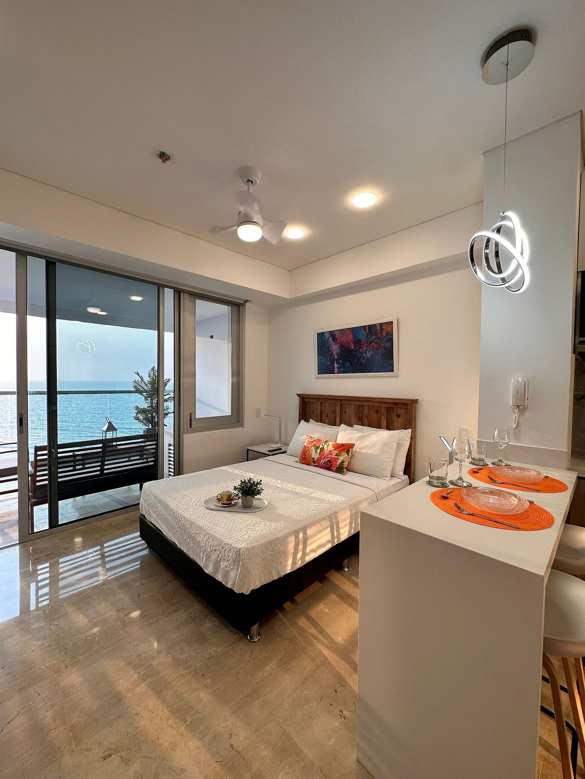 En el piso 15, disfruta de una vista panorámica al mar Caribe y atardeceres inolvidables. Este moderno apartamento ofrece cama doble, baño amplio estilo hotel, cocina equipada y sala luminosa con acceso a un balcón perfecto para relajarte. Ubicado en el exclusivo Cartagena Beach, con piscina, jacuzzi, sauna y turco. A solo 2 min del aeropuerto y a pasos del parque lineal que conecta con la playa, es ideal para quienes buscan comodidad, ubicación y una experiencia única frente al mar.
