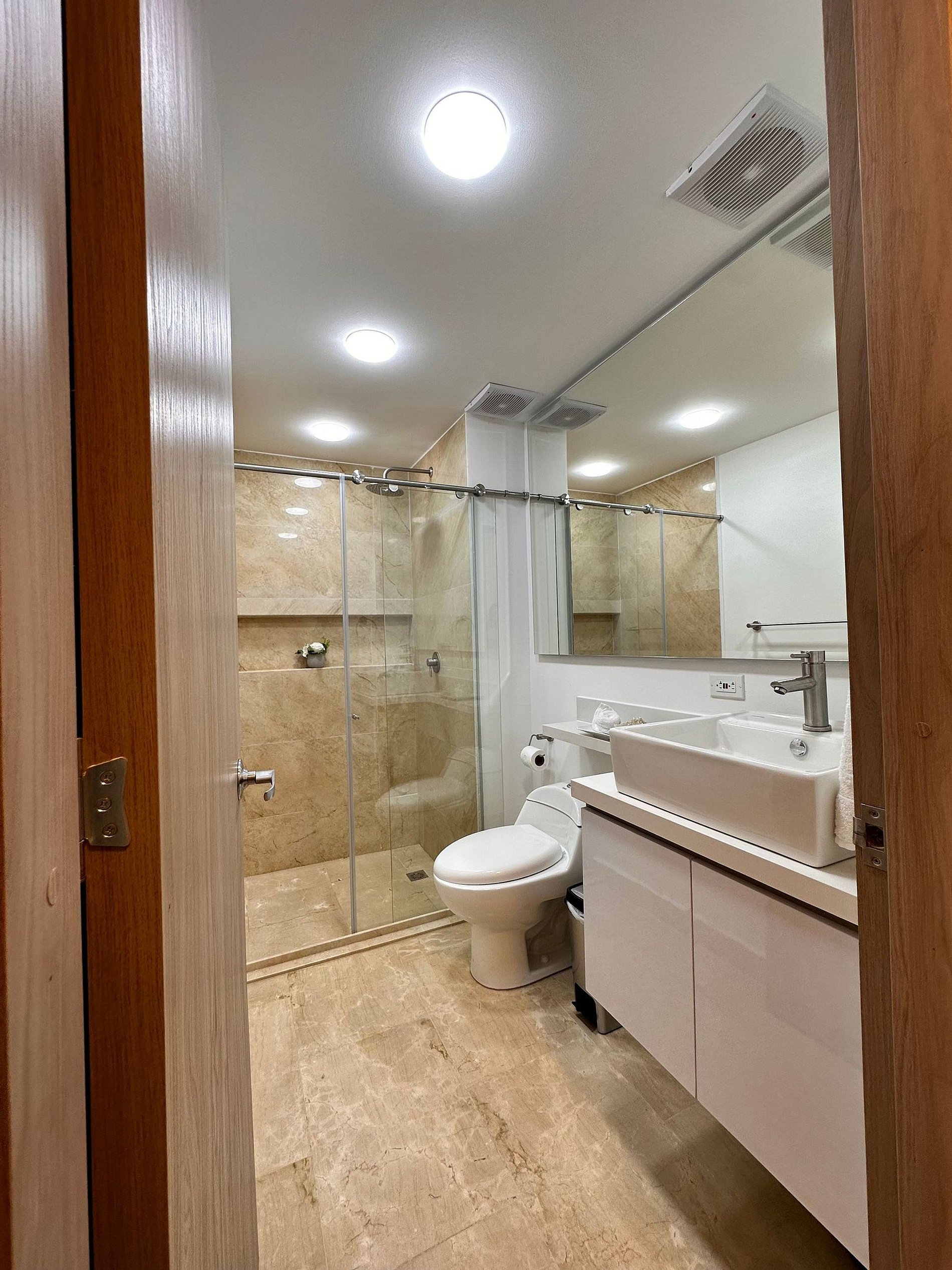 • Baño amplio estilo hotelero con acabados en mármol, ducha en vidrio templado y grifería moderna.