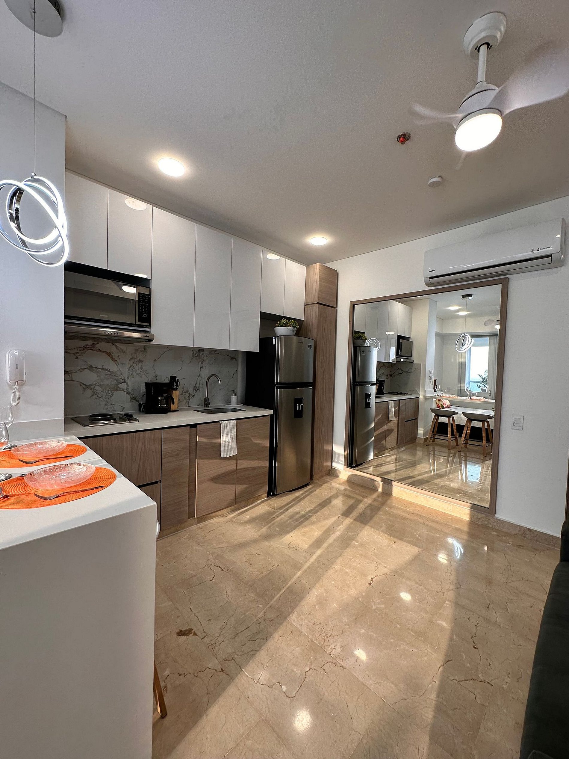 • Cocina equipada con nevera grande, microondas, cafetera, licuadora y utensilios completos, perfecta para estancias cortas o largas.