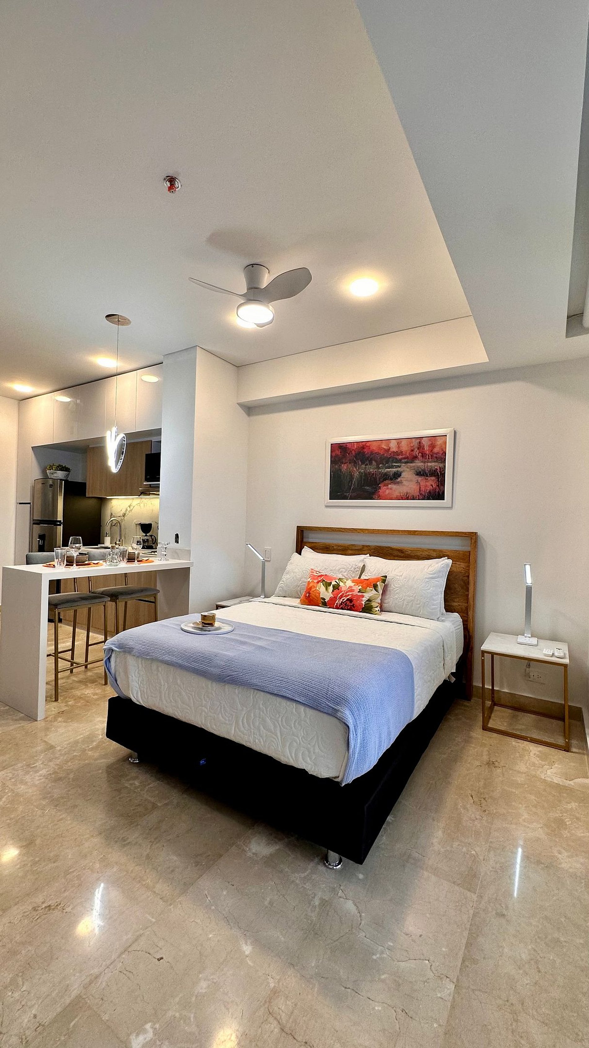 En el piso 15, este apartamento combina comodidad y estilo moderno. Cuenta con cama doble, sofá cama sencillo, aire acondicionado, cocina totalmente equipada, comedor y sala con Smart TV, además de un balcón privado con vista panorámica de la ciudad y el mar a lo lejos. Ideal para descansar o trabajar con total confort.