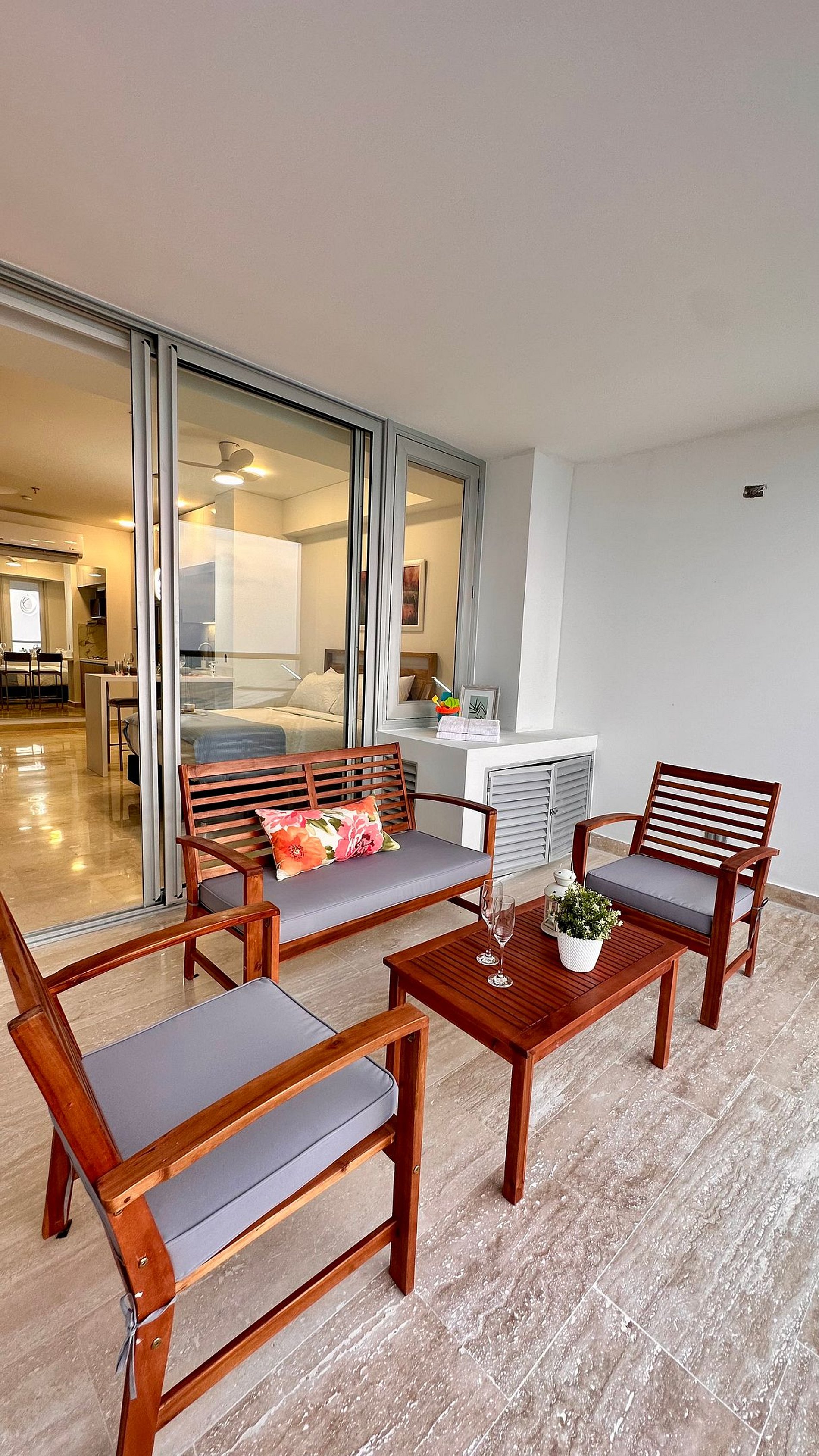 • Balcón privado amoblado con sillas y mesa en madera, perfecto para disfrutar de un café o una copa de vino frente al mar.
