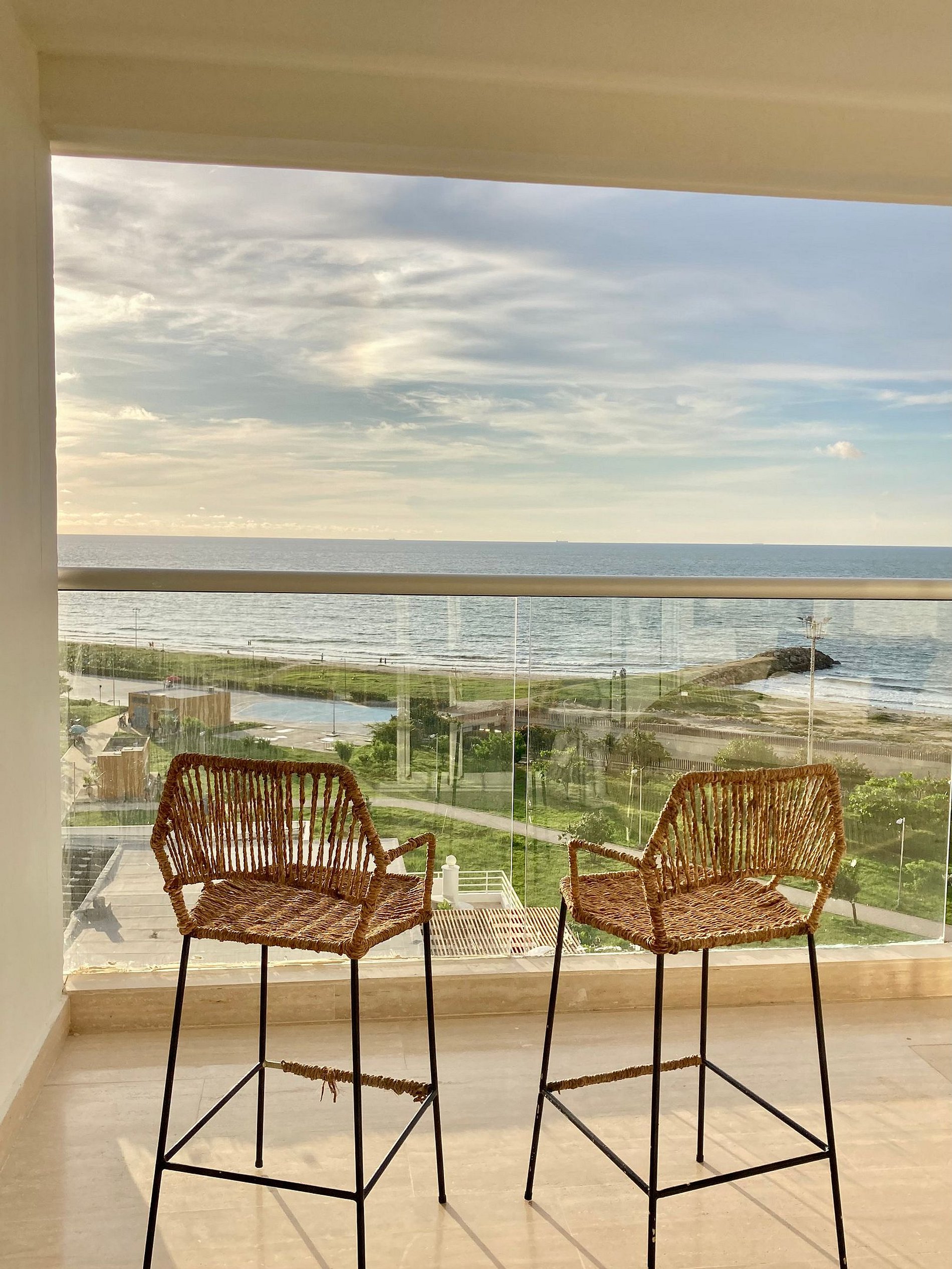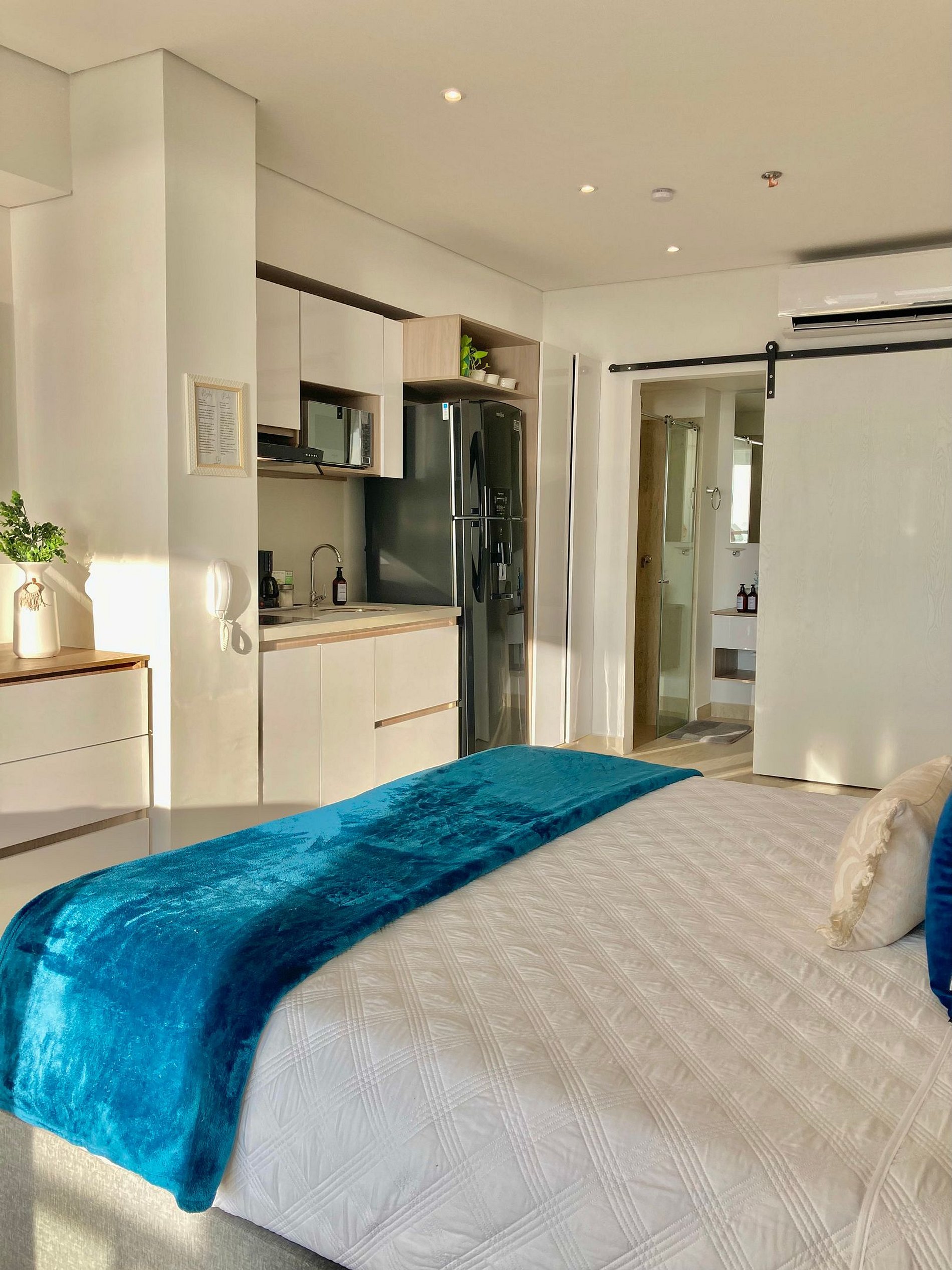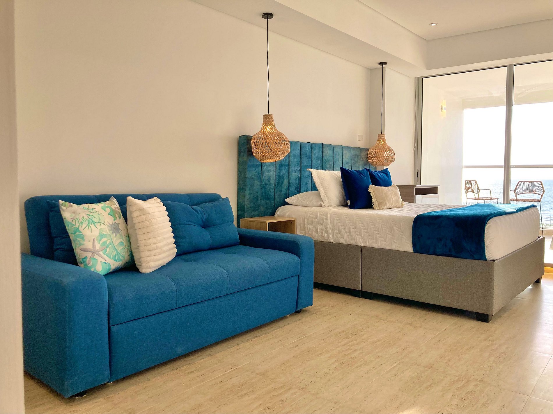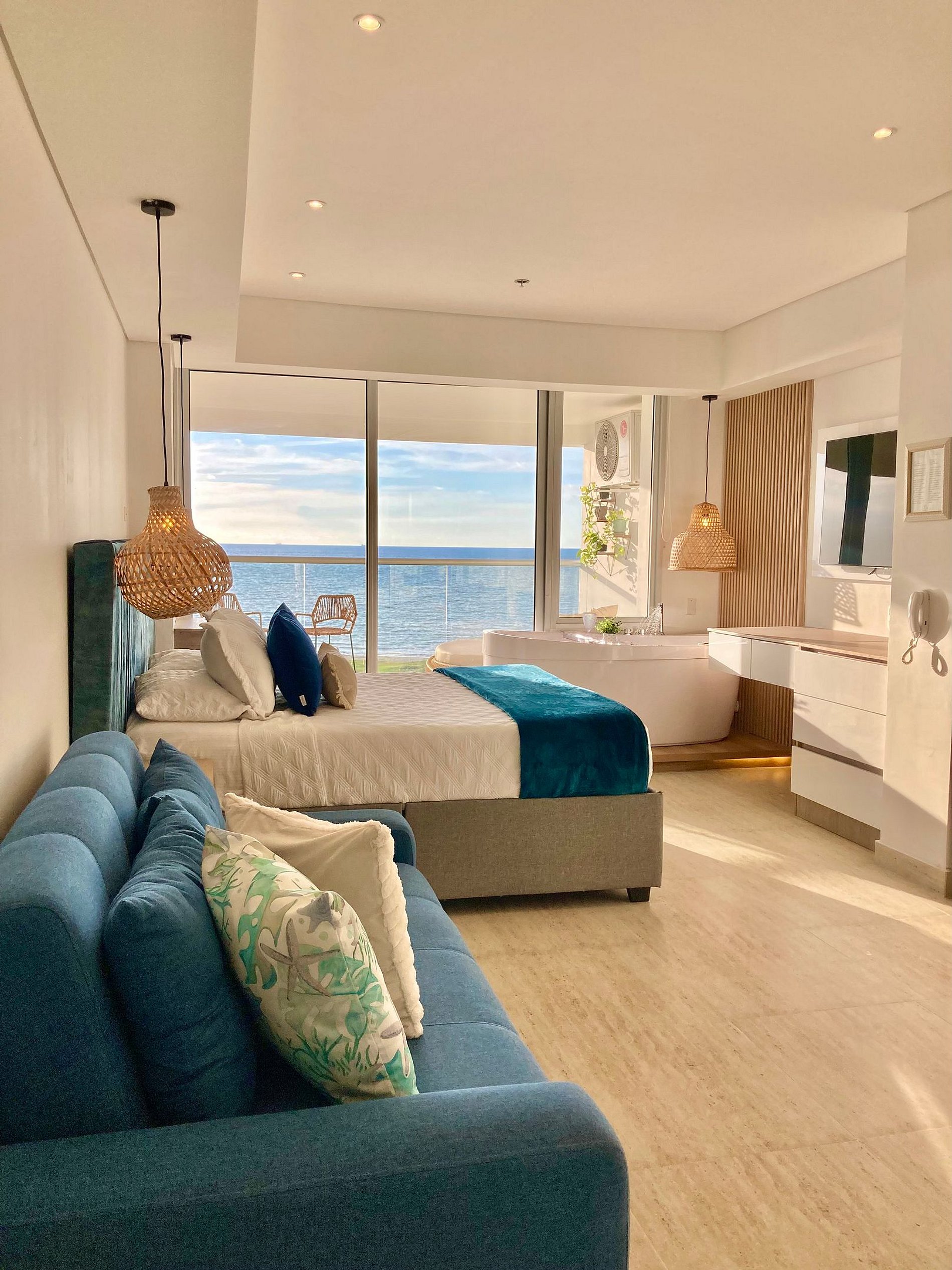 Déjate cautivar por esta suite de ensueño frente al mar. Disfruta una bañera-jacuzzi junto al ventanal con vista infinita al Caribe, cama Queen con lencería premium y un balcón amoblado perfecto para ver el atardecer. Cocina equipada, Smart TV, Wi-Fi y lavadora. Un espacio moderno, luminoso y elegante, ideal para relajarte y vivir la experiencia de Cartagena con todo el confort.