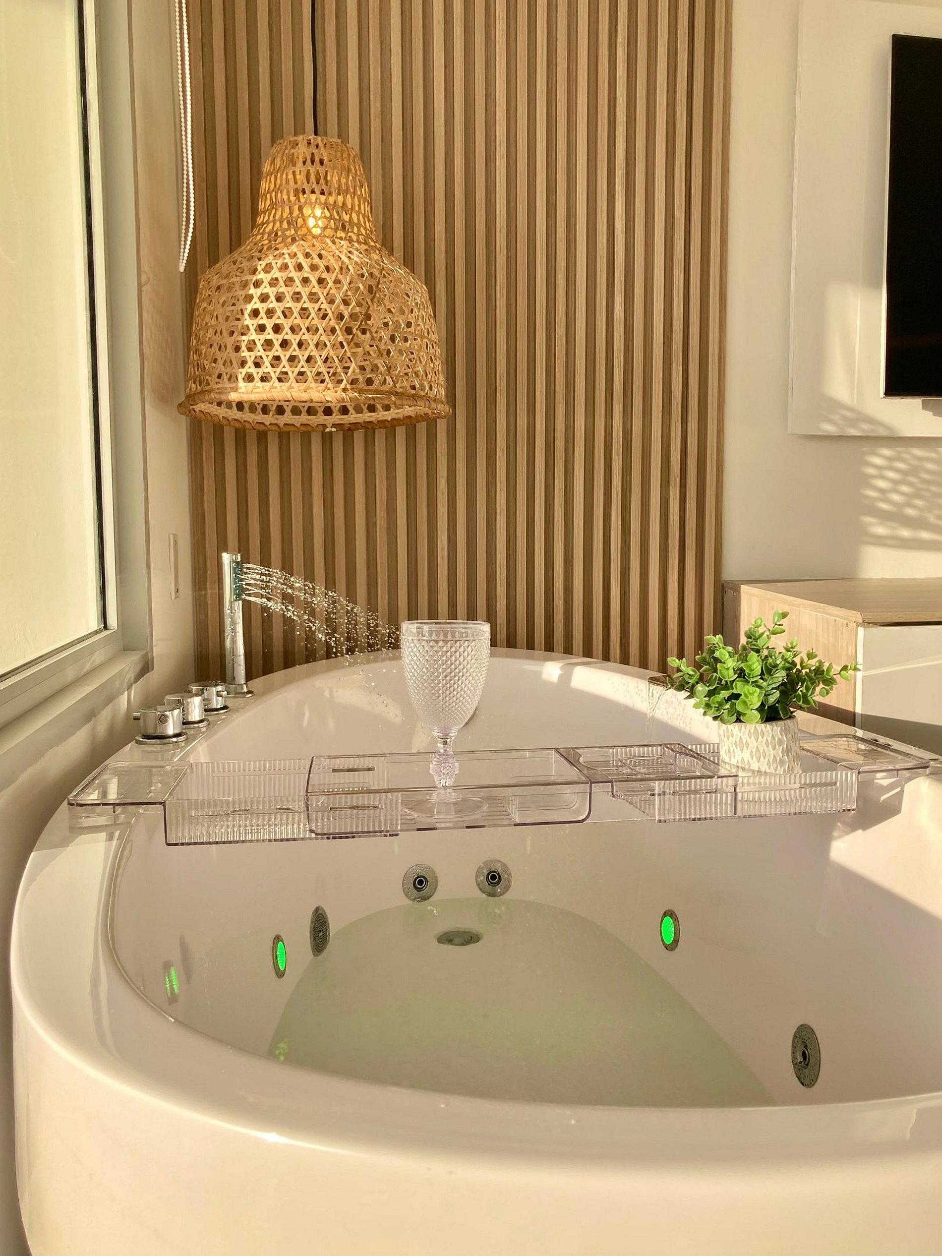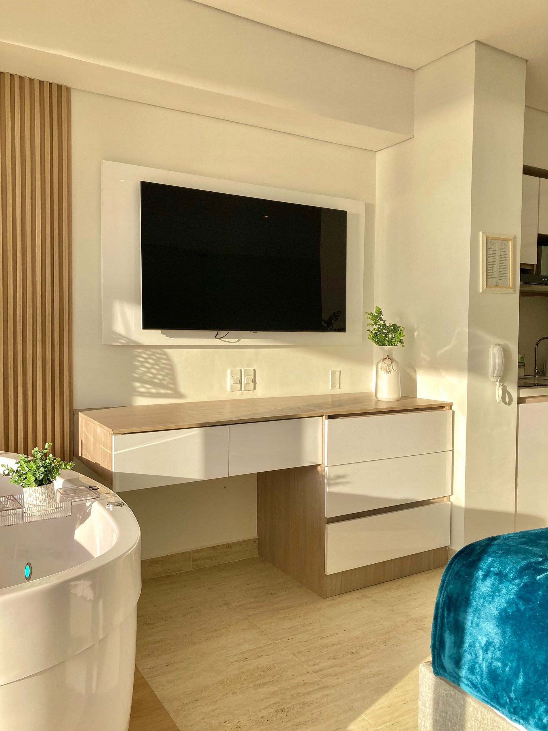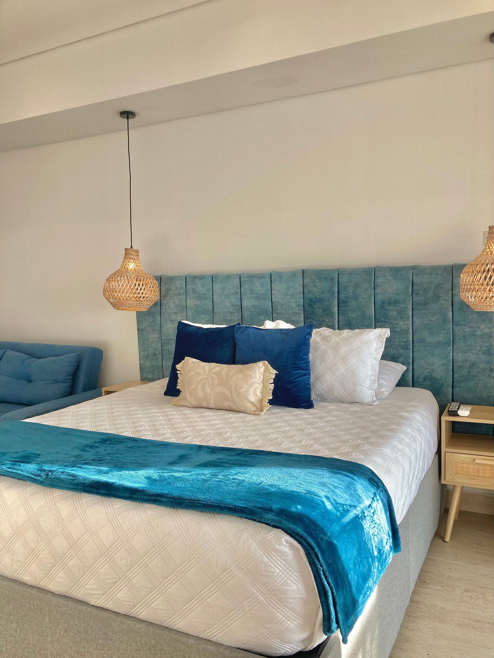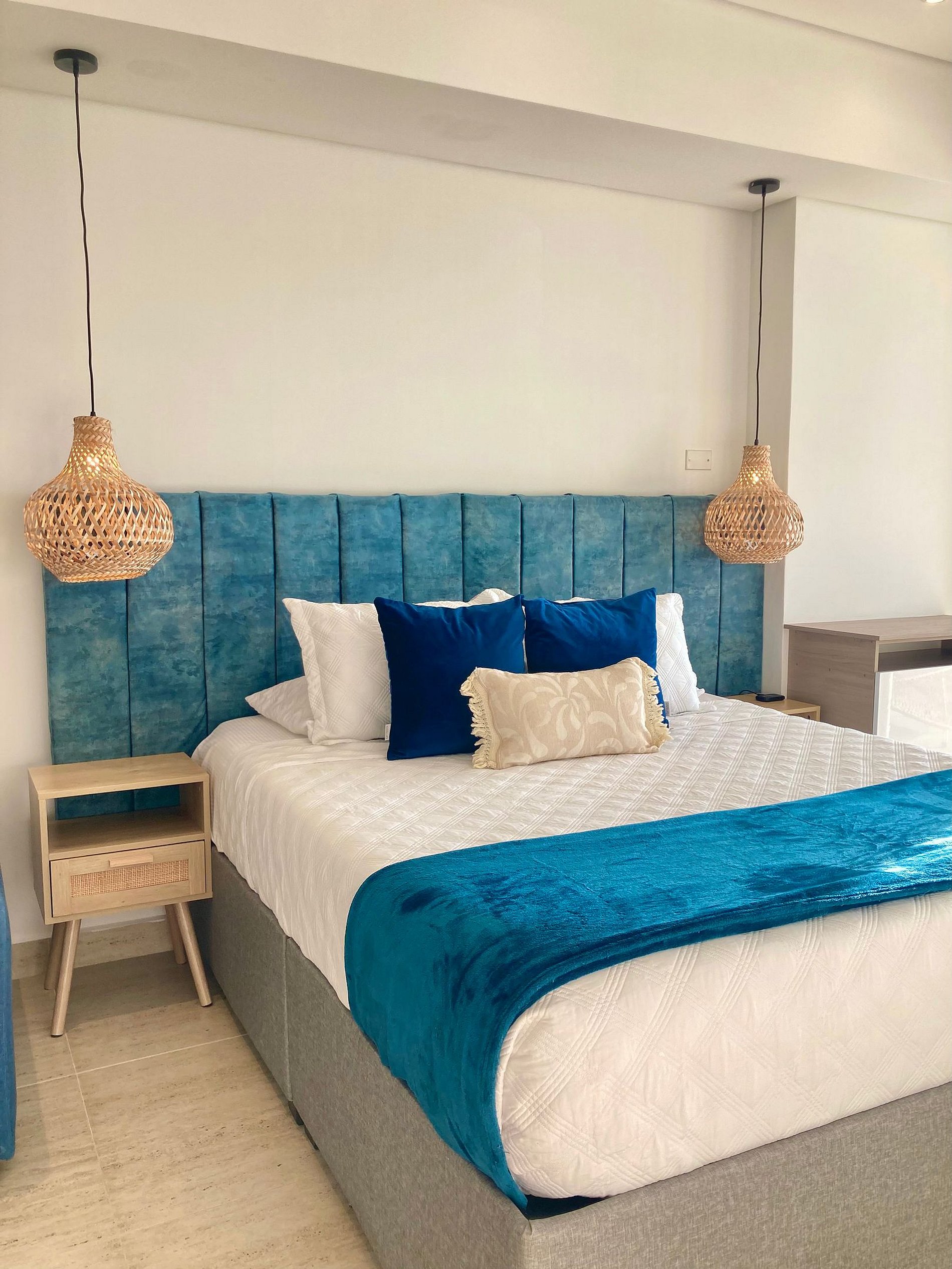 Déjate cautivar por esta suite de ensueño frente al mar. Disfruta una bañera-jacuzzi junto al ventanal con vista infinita al Caribe, cama Queen con lencería premium y un balcón amoblado perfecto para ver el atardecer. Cocina equipada, Smart TV, Wi-Fi y lavadora. Un espacio moderno, luminoso y elegante, ideal para relajarte y vivir la experiencia de Cartagena con todo el confort.
