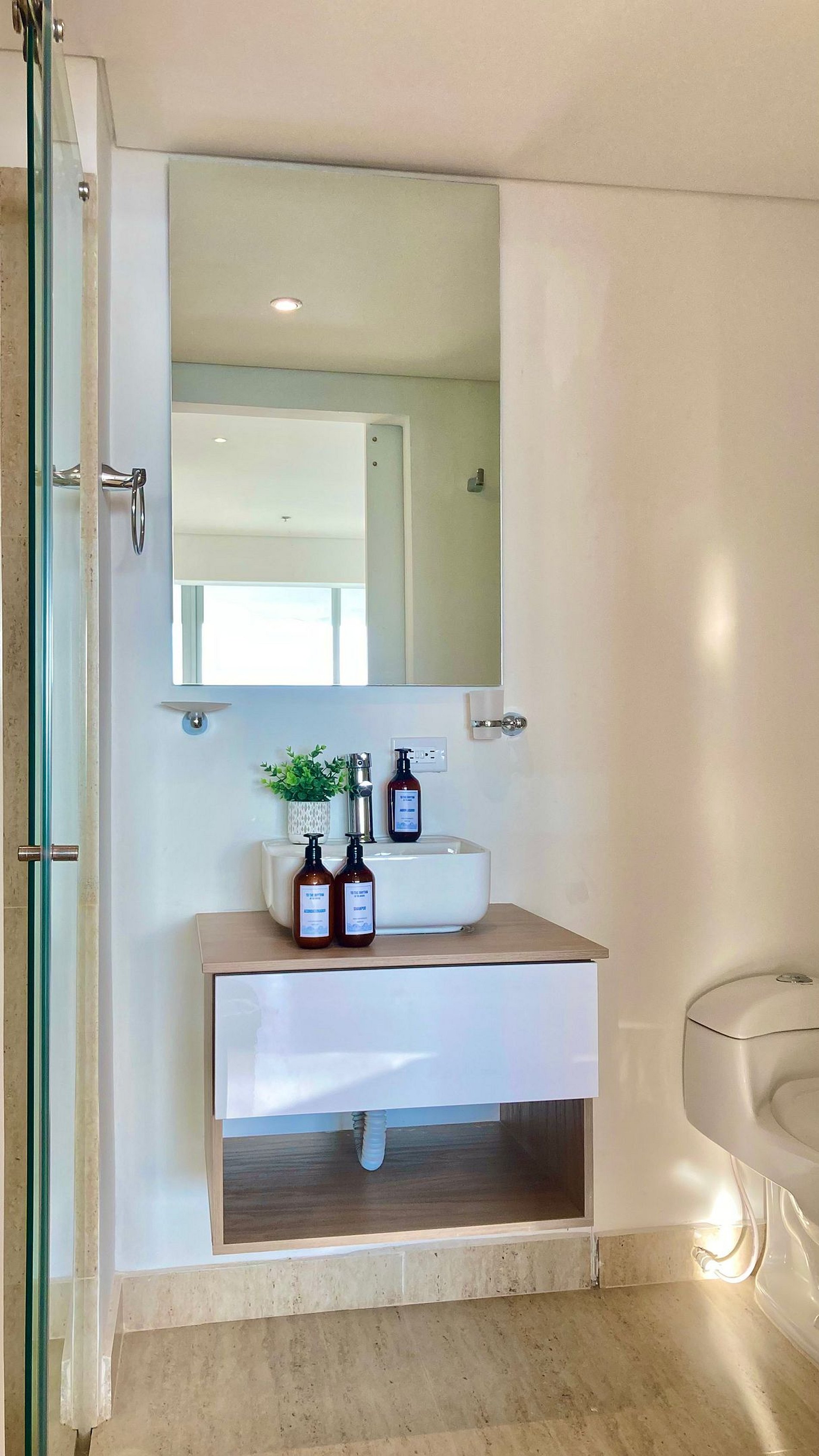 Vive el encanto del Caribe en esta suite del piso 8 con vista directa al mar y espectacular bañera-jacuzzi junto al ventanal. Cama Queen con lencería premium, sofá cama doble, balcón amoblado, cocina totalmente equipada, Smart TV, Wi-Fi y lavadora. El edificio cuenta con piscina, jacuzzi, piscina para niños, sauna, turco y zona de lavandería. A solo 2 min del aeropuerto y 10 min del Centro Histórico. Un espacio moderno, luminoso y elegante para disfrutar Cartagena con estilo y confort.