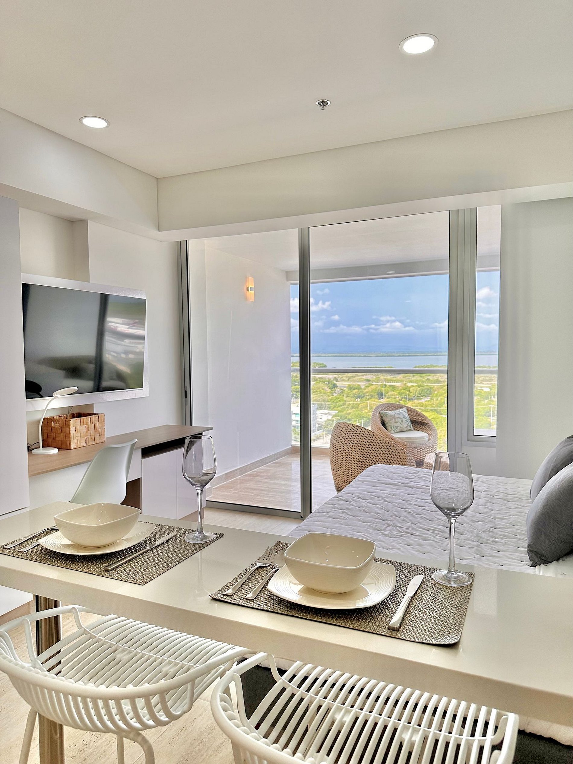 Lleno de color y estilo caribeño, este apartamento ofrece una experiencia única con vista a la Ciénaga. Disfruta el balcón con mobiliario lounge, cocina equipada, escritorio cómodo y cama King ideal para descansar. Perfecto para parejas o viajes de trabajo. A solo 2 min del aeropuerto y a pasos del parque lineal que te conecta caminando con la playa. Un espacio alegre, acogedor y con alma propia para disfrutar Cartagena. Ver los aviones aterrizar y despegar es maravilloso