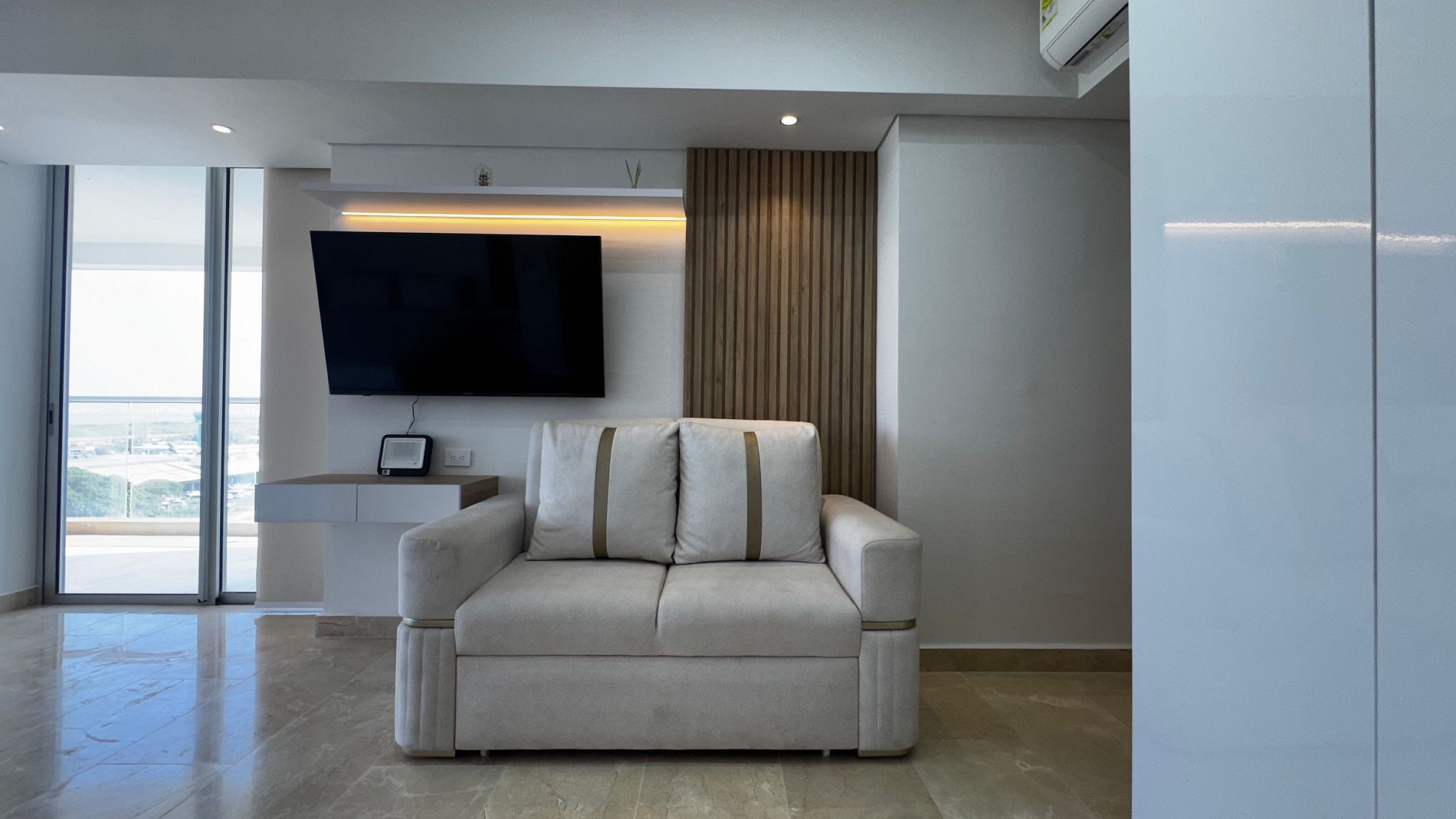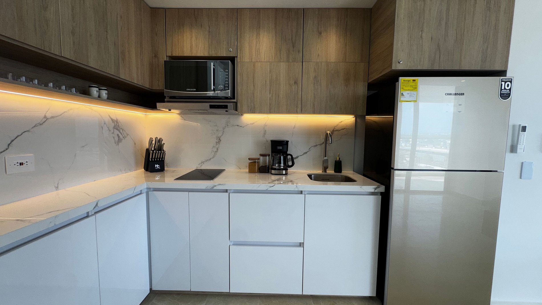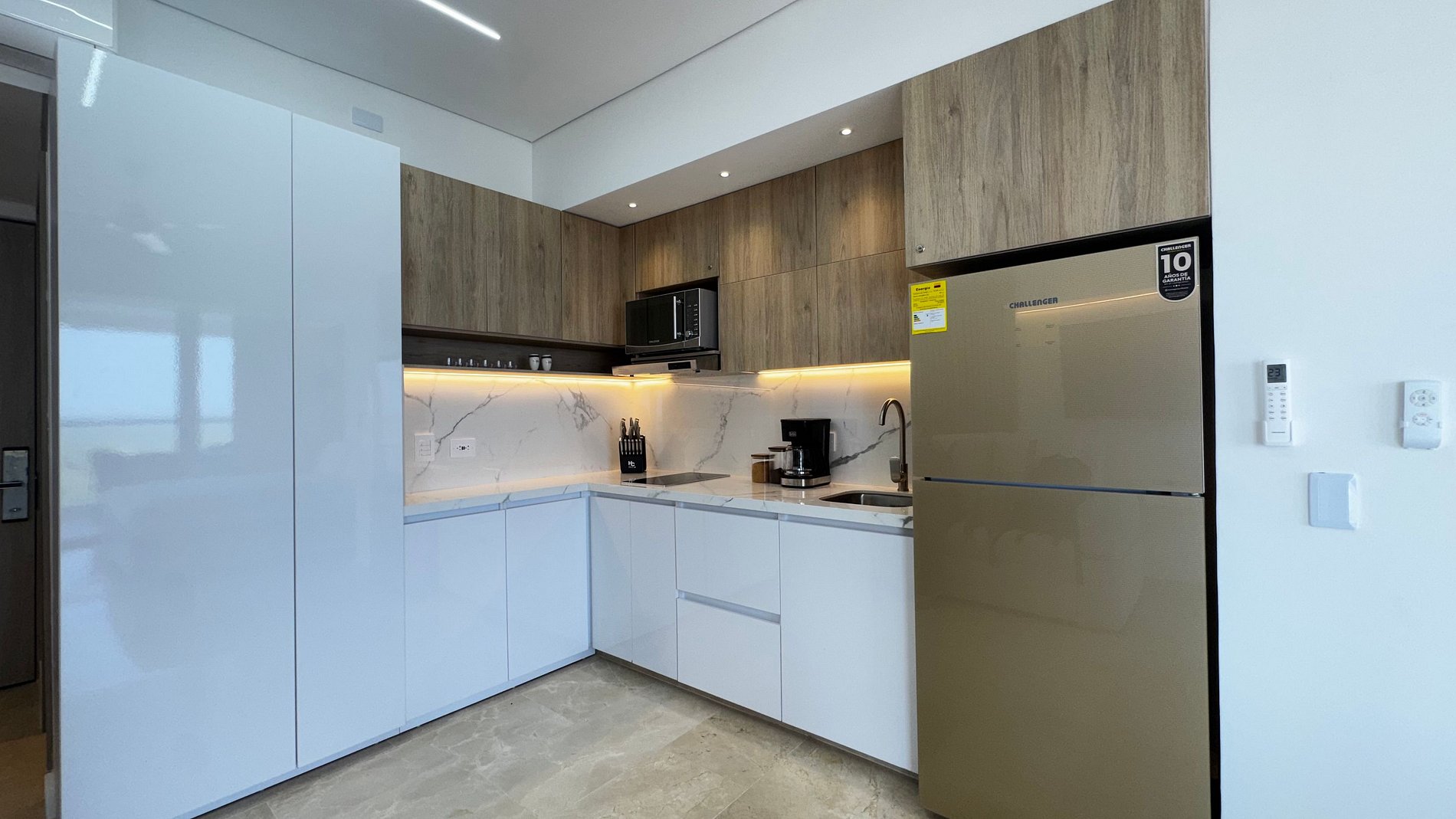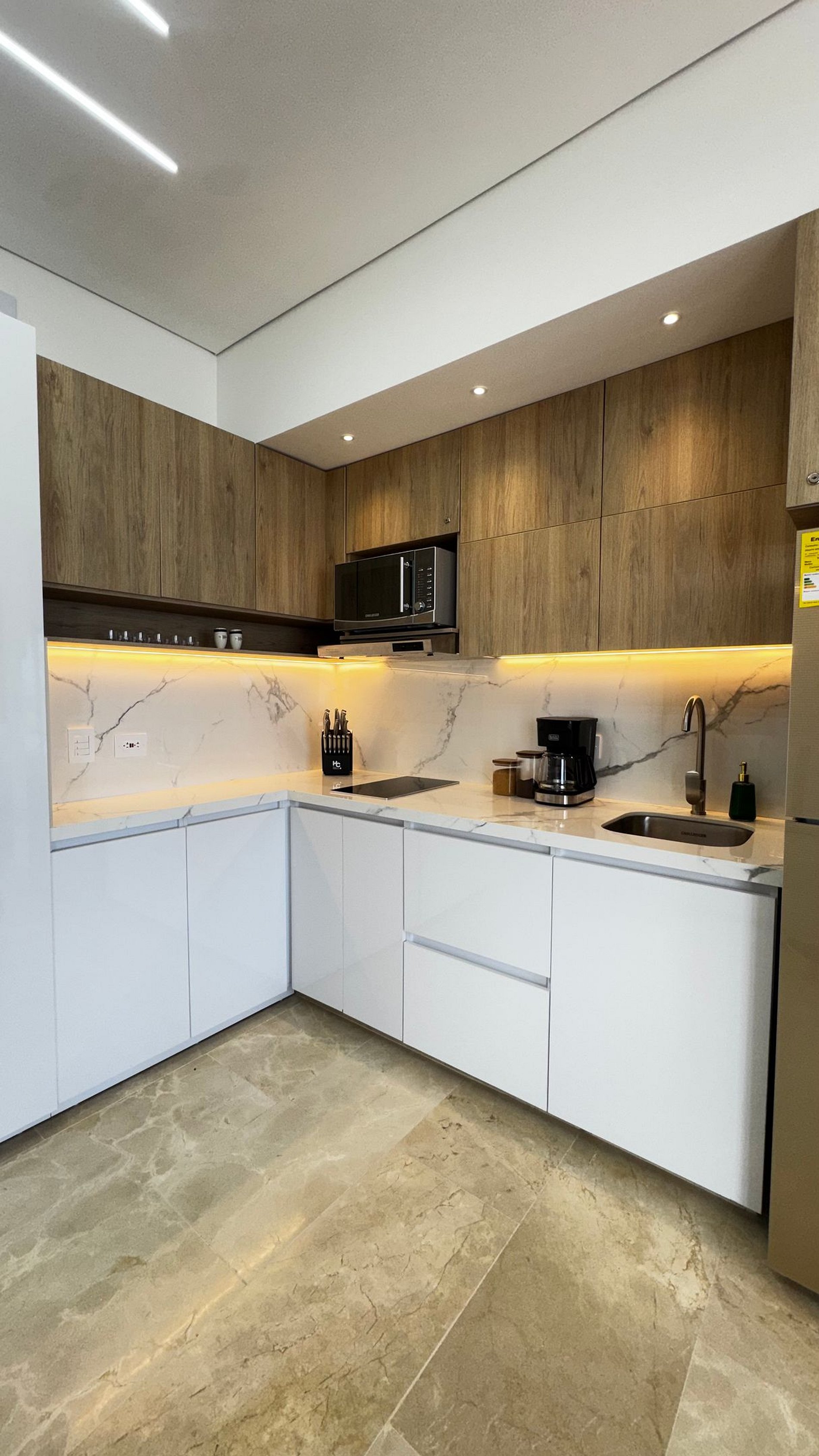 • Decoración minimalista con iluminación LED y detalles en madera