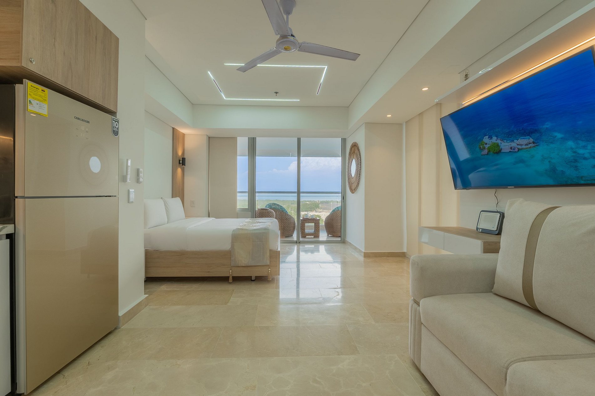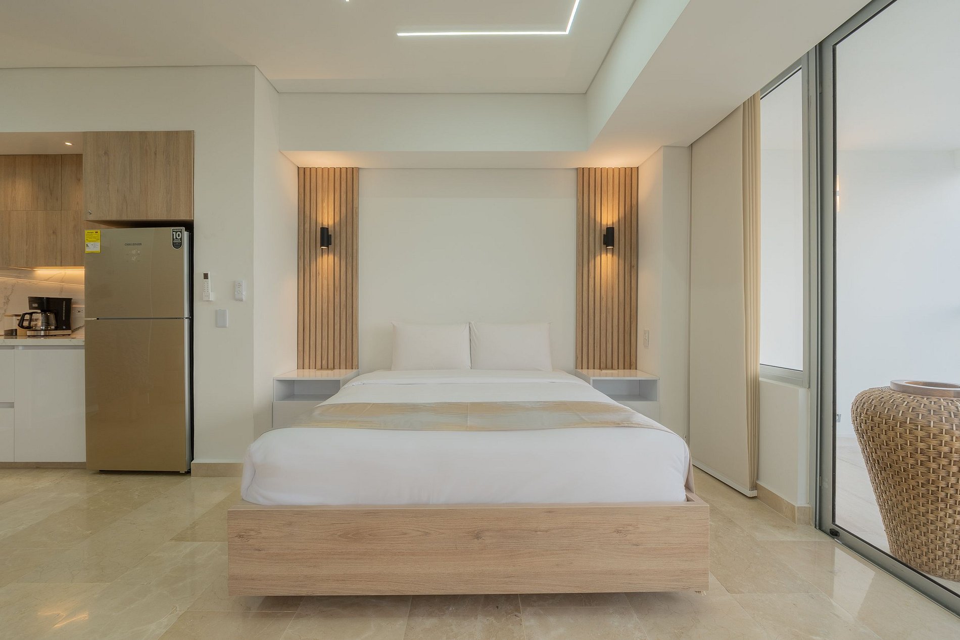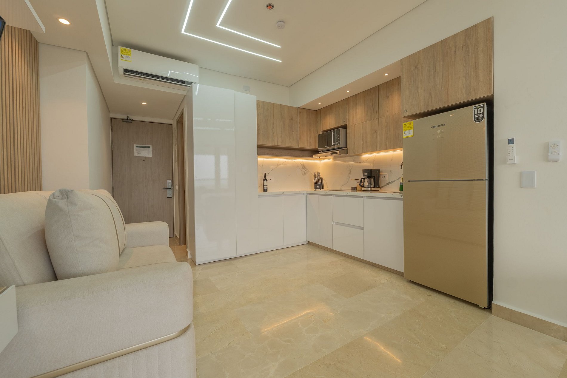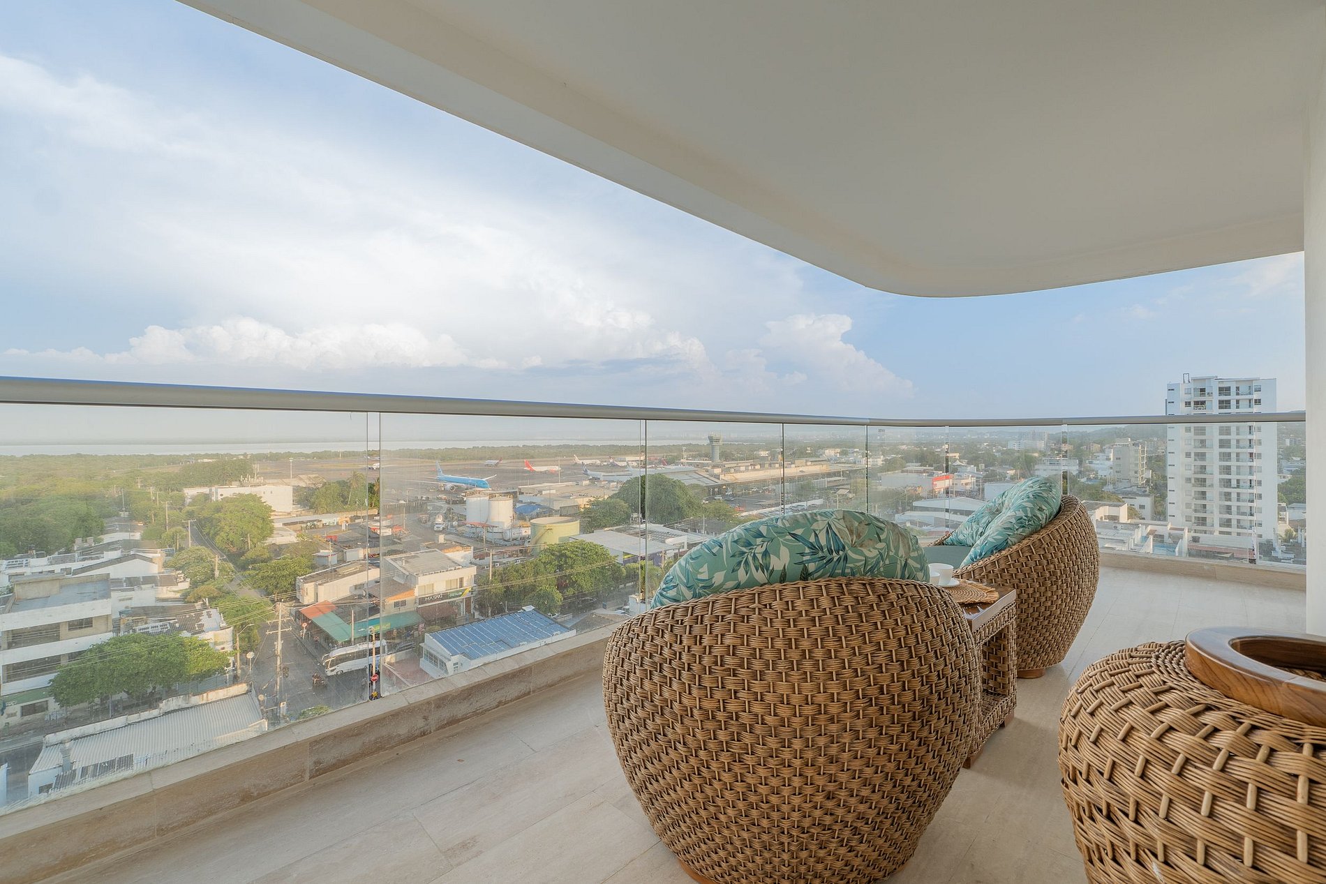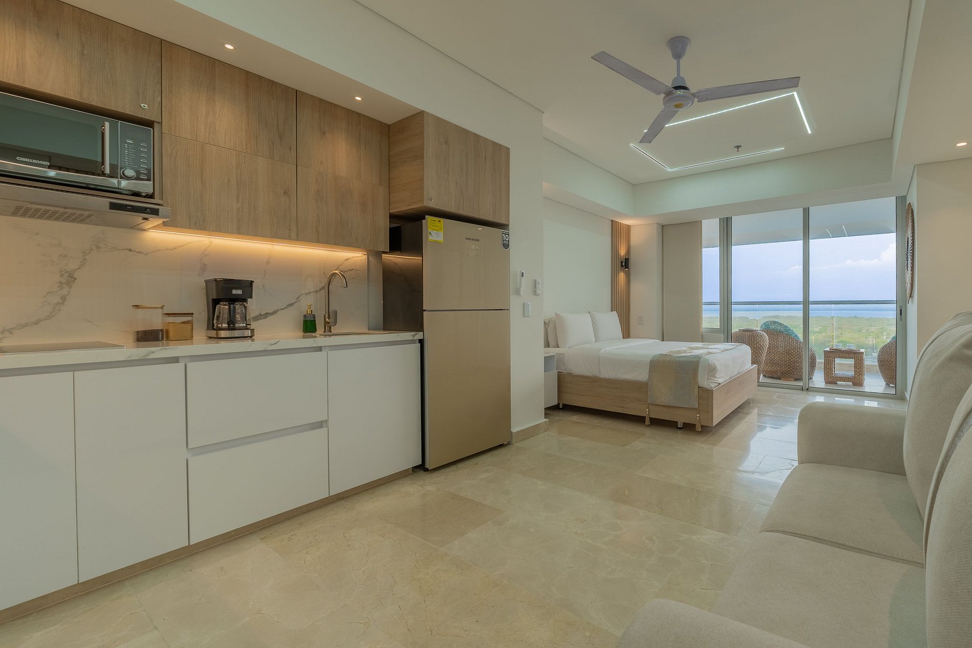 Hermosa suite en piso alto con vista 180° al mar, la Ciénaga y la ciudad. Cuenta con cama Queen, Smart TV, aire acondicionado y ventilador de techo. Balcón amoblado con comedor exterior y sillas lounge. Cocina totalmente equipada con nevera, microondas, cafetera y barra-comedor. Baño moderno con ducha en vidrio esmerilado y cerradura digital para mayor seguridad.