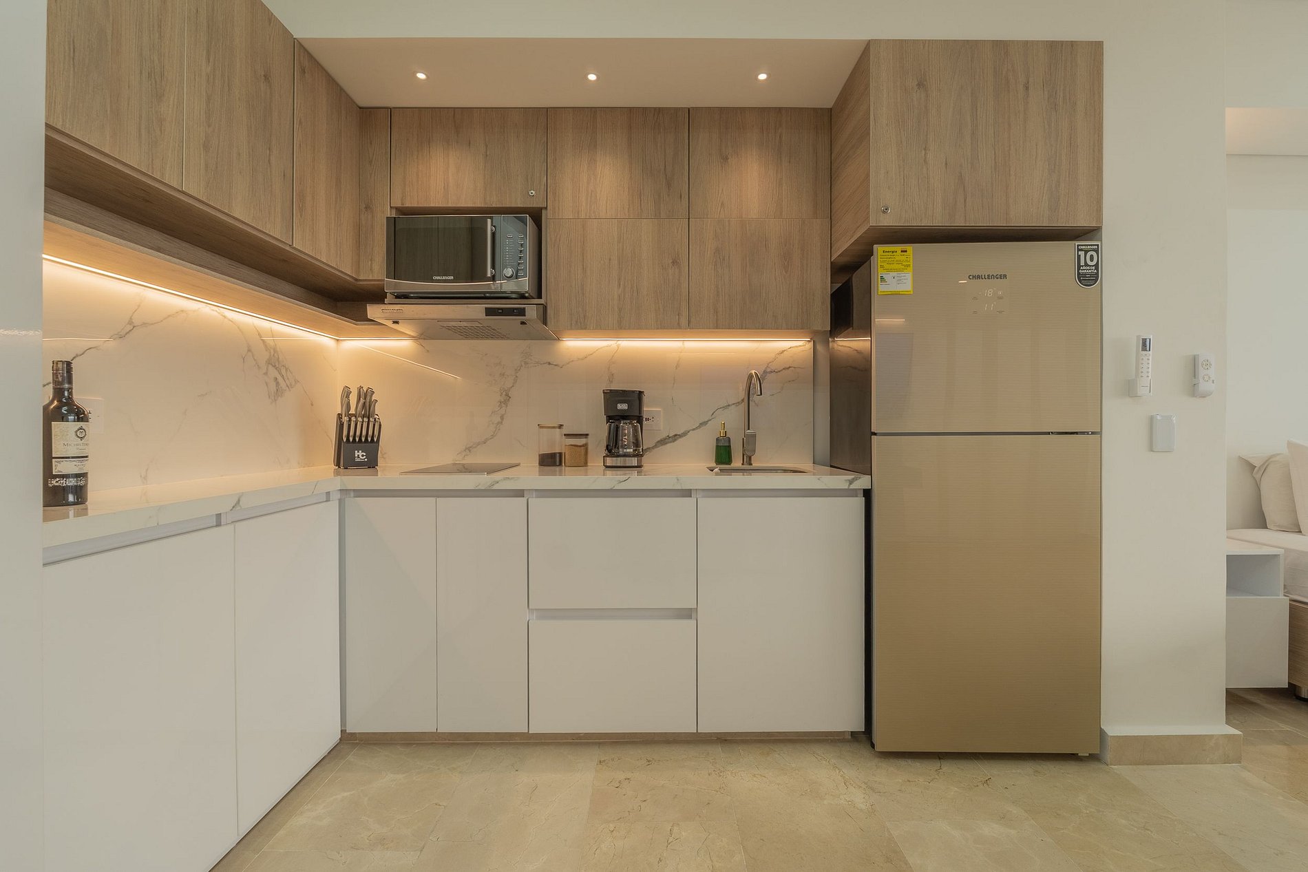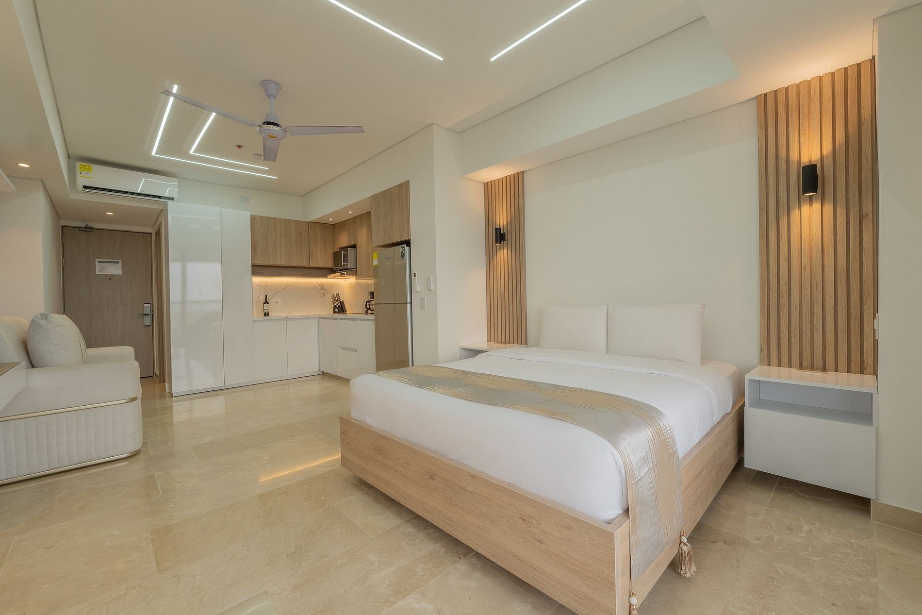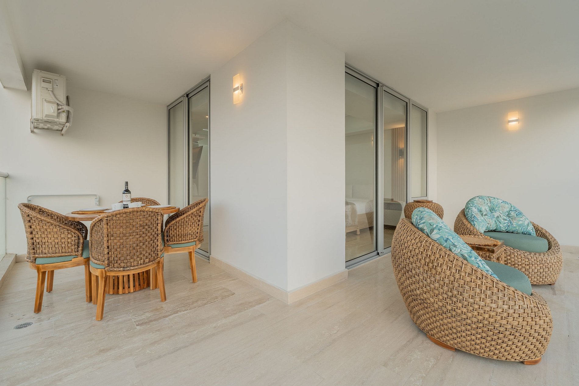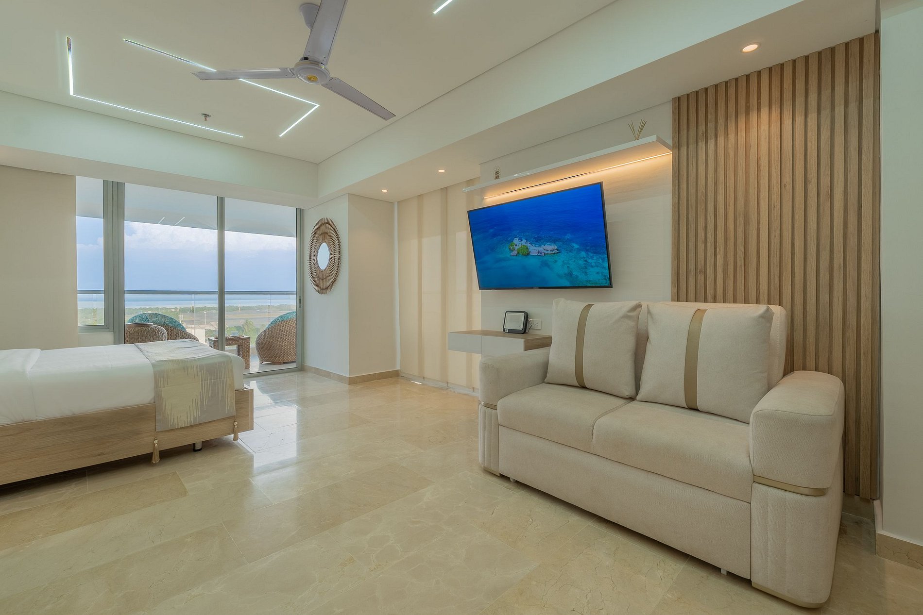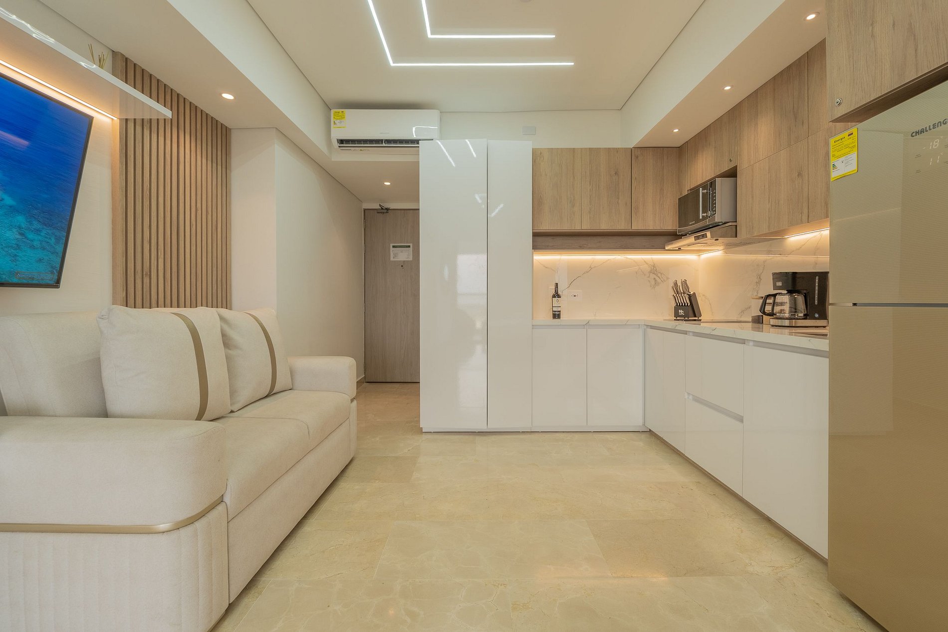 Hermosa suite en piso alto con vista 180° al mar, la Ciénaga y la ciudad. Cuenta con cama Queen, Smart TV, aire acondicionado y ventilador de techo. Balcón amoblado con comedor exterior y sillas lounge. Cocina totalmente equipada con nevera, microondas, cafetera y barra-comedor. Baño moderno con ducha en vidrio esmerilado y cerradura digital para mayor seguridad.