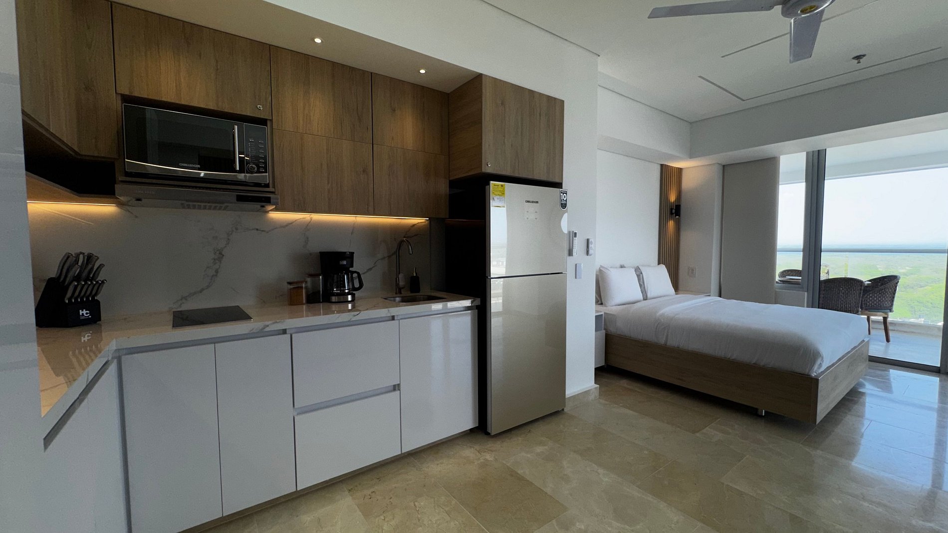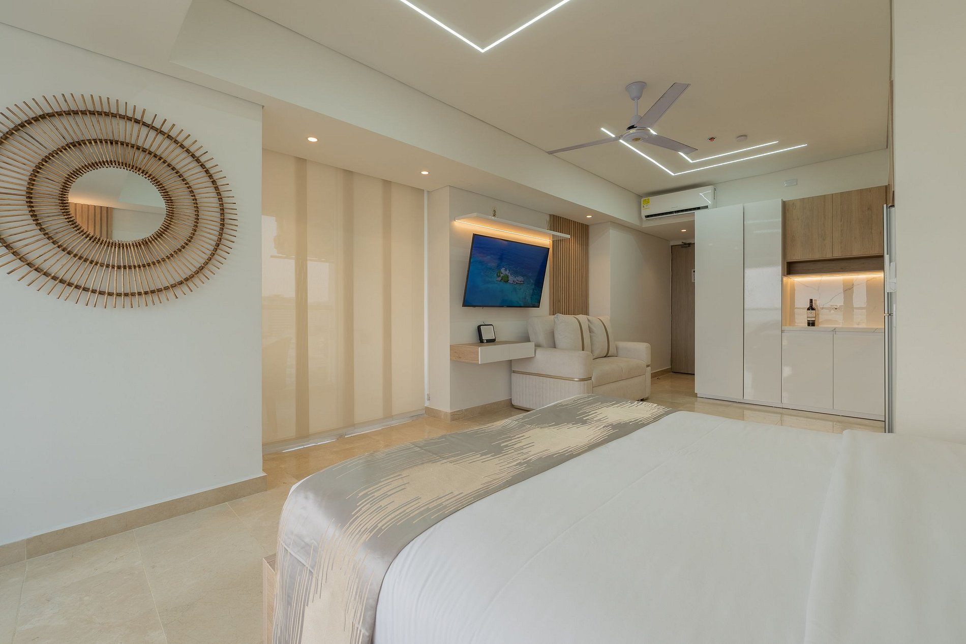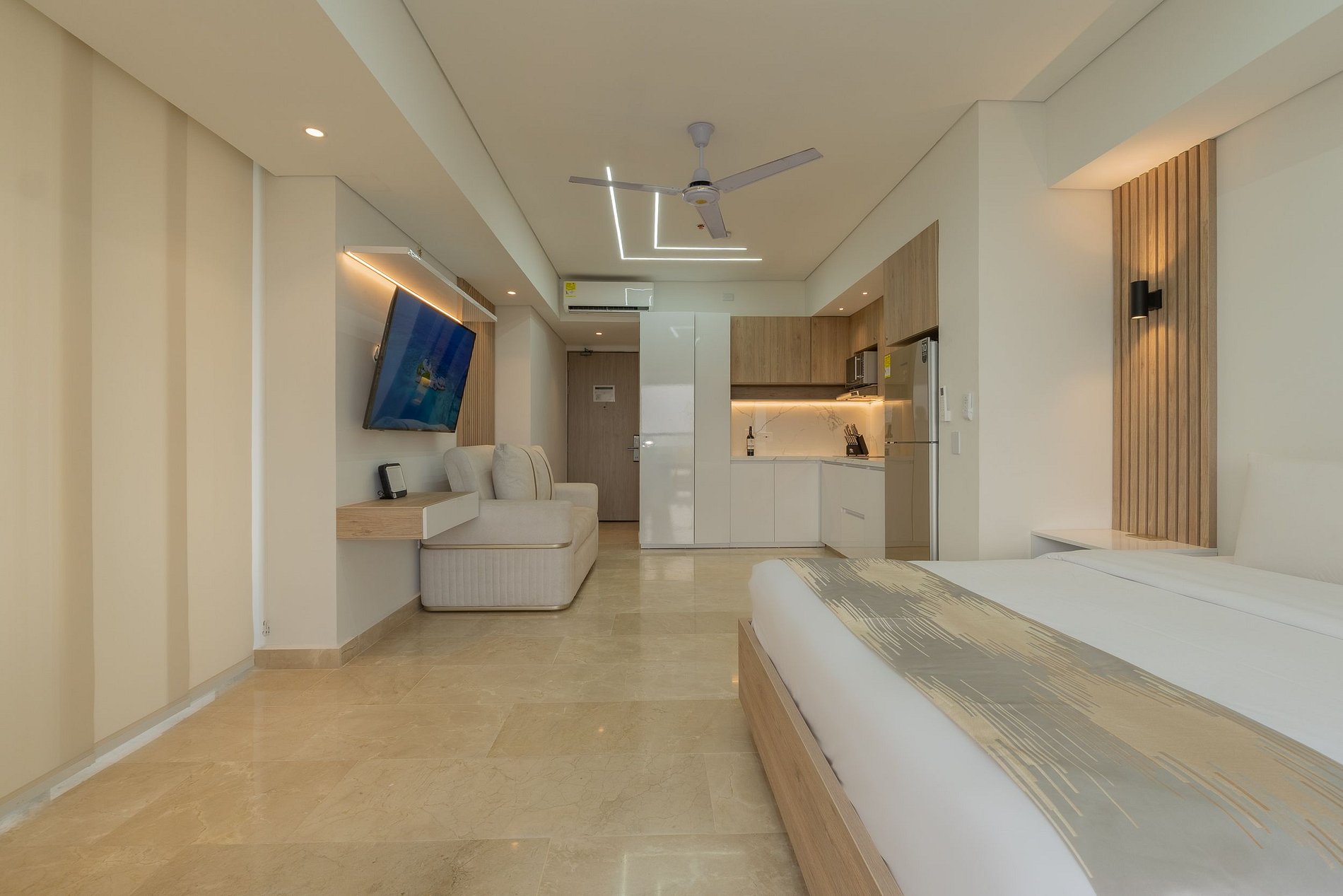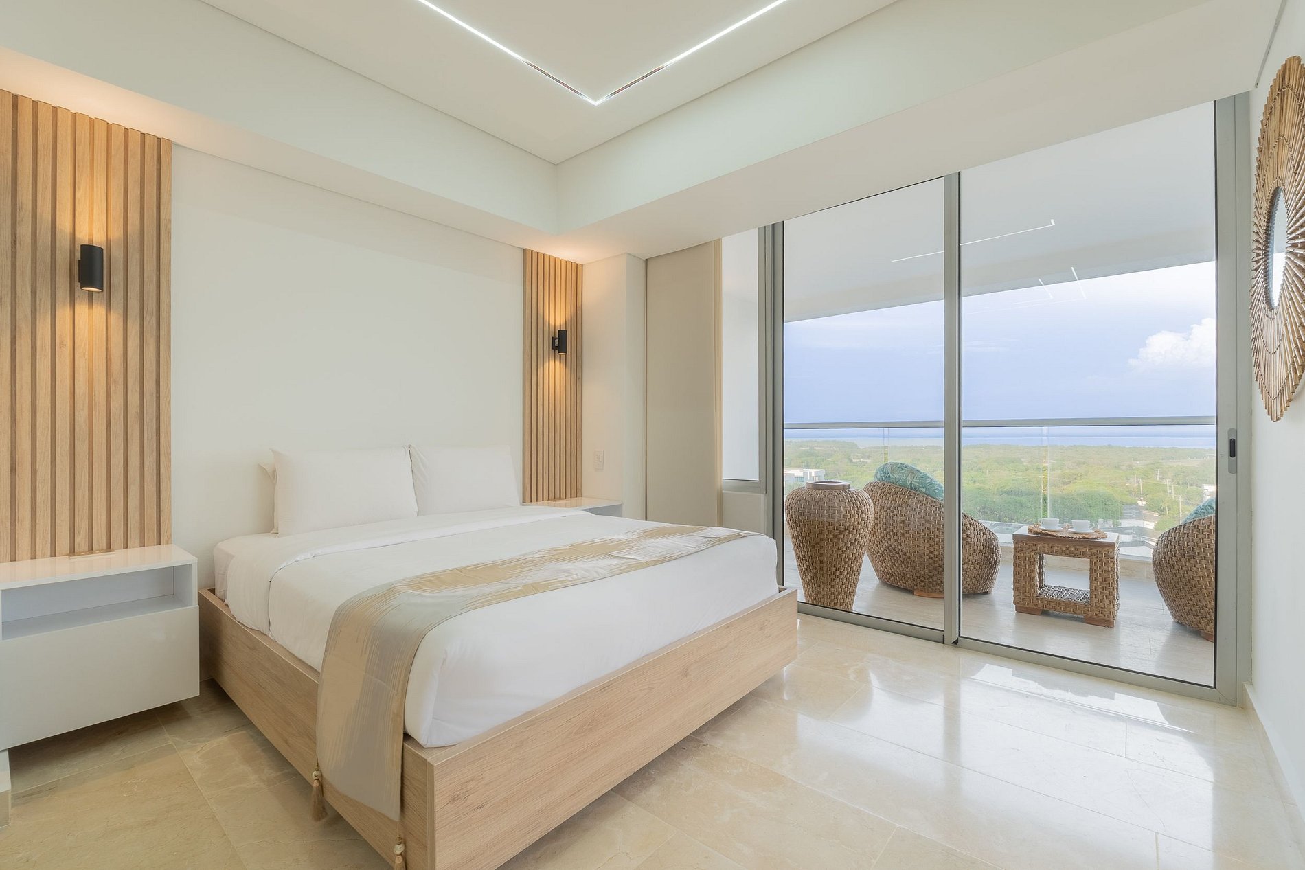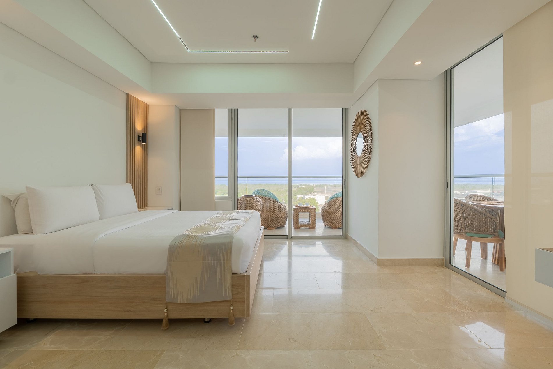 Hermosa suite en piso alto con vista 180° al mar, la Ciénaga y la ciudad. Cuenta con cama Queen, Smart TV, aire acondicionado y ventilador de techo. Balcón amoblado con comedor exterior y sillas lounge. Cocina totalmente equipada con nevera, microondas, cafetera y barra-comedor. Baño moderno con ducha en vidrio esmerilado y cerradura digital para mayor seguridad.