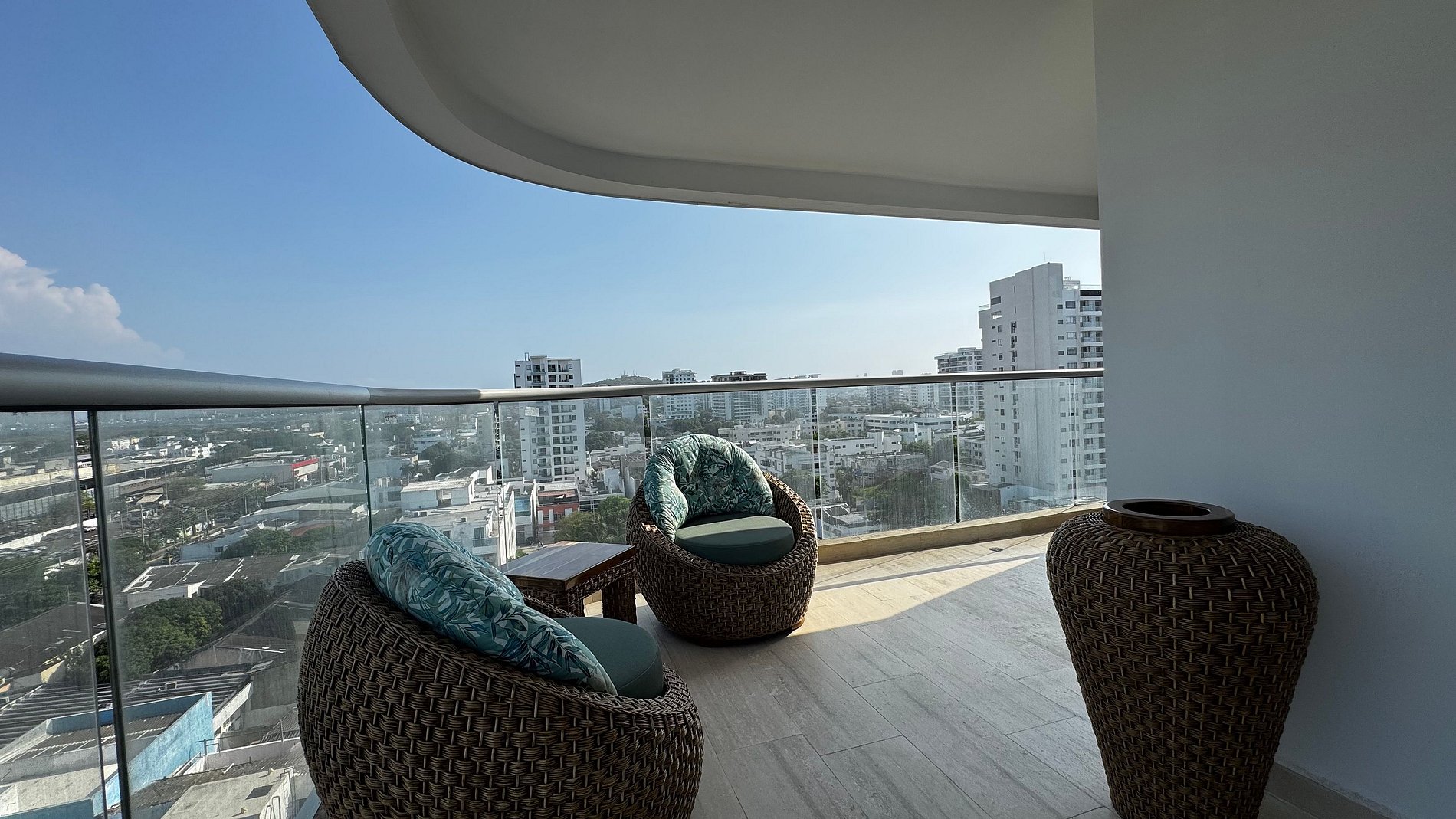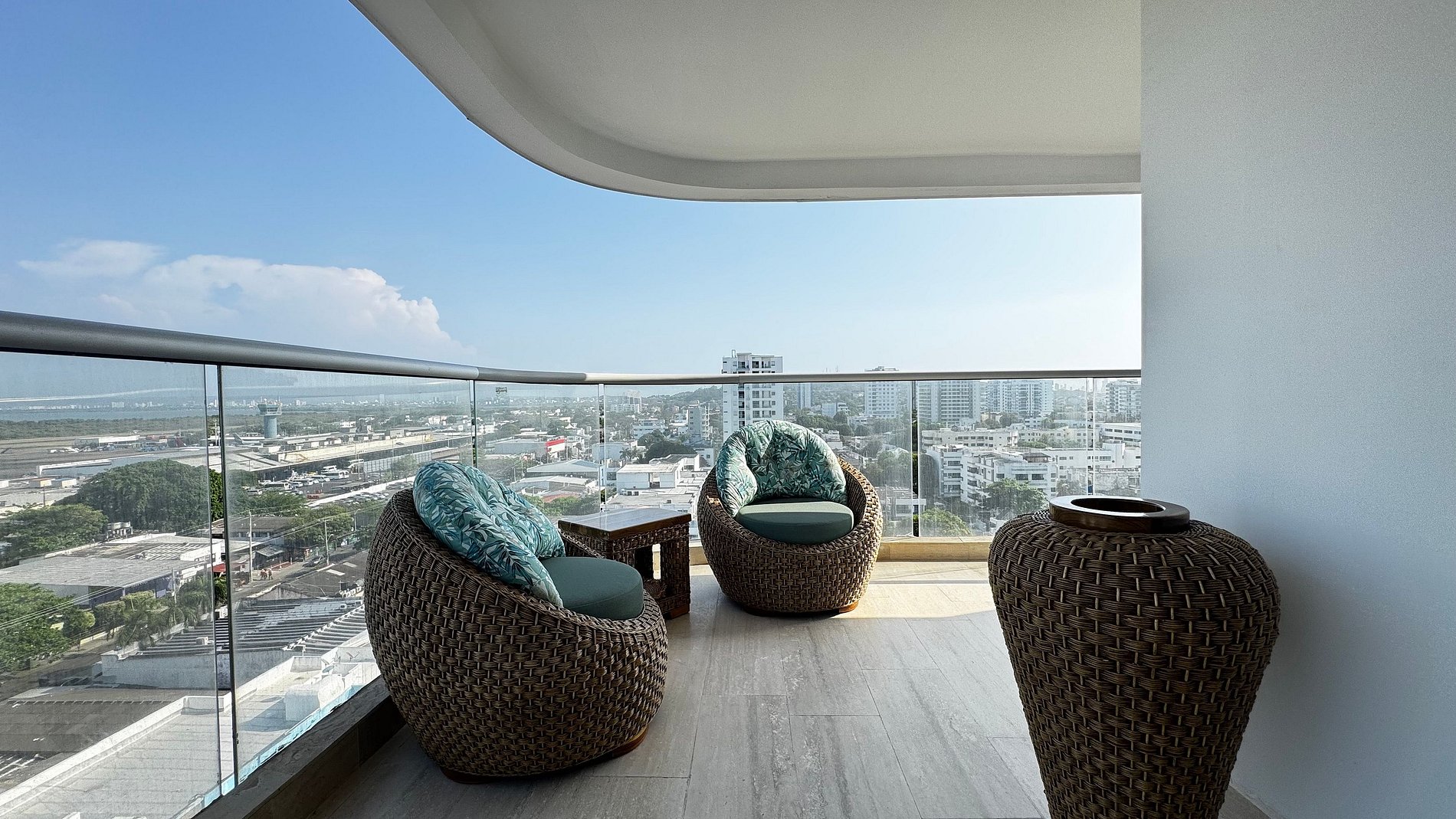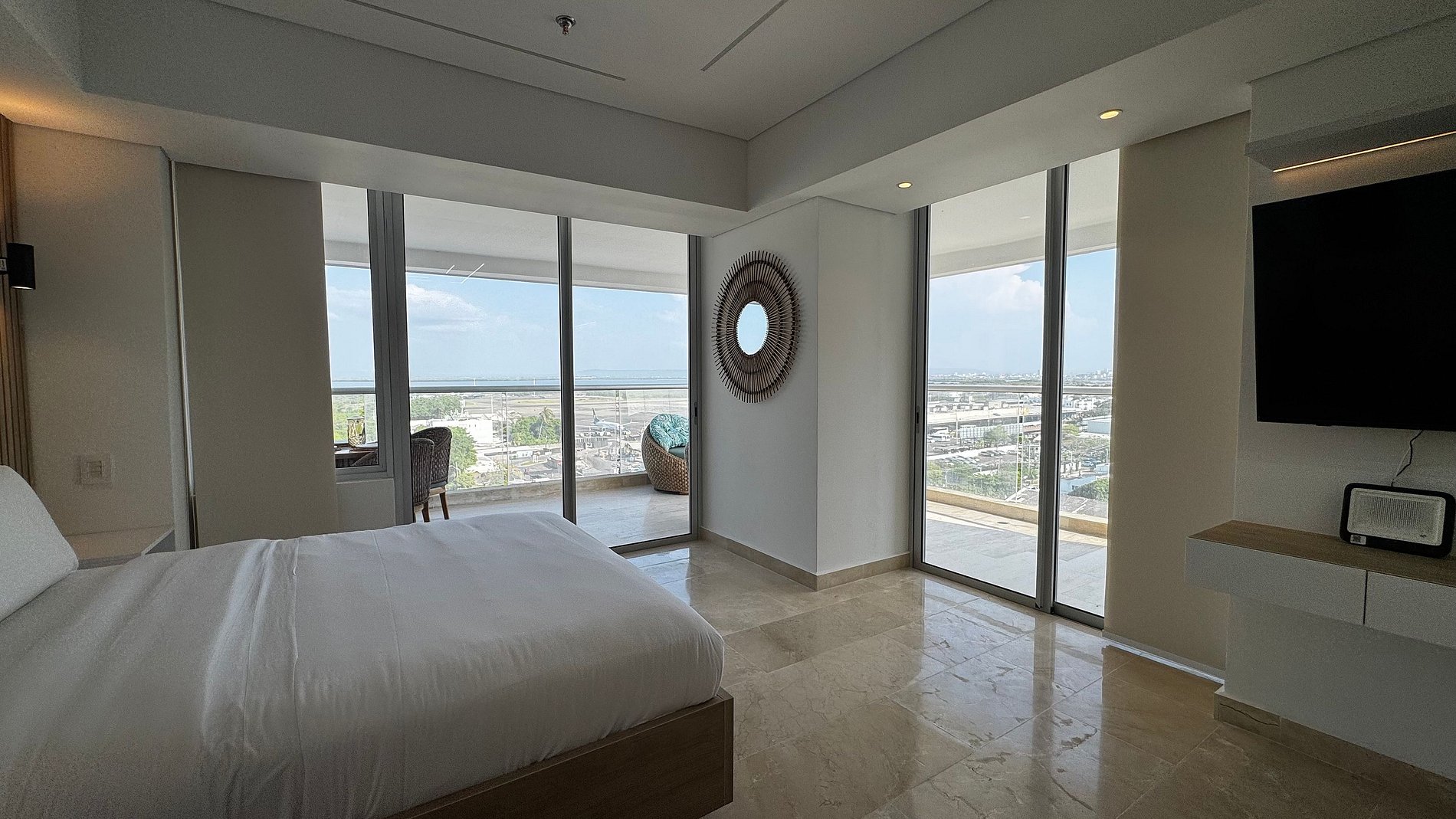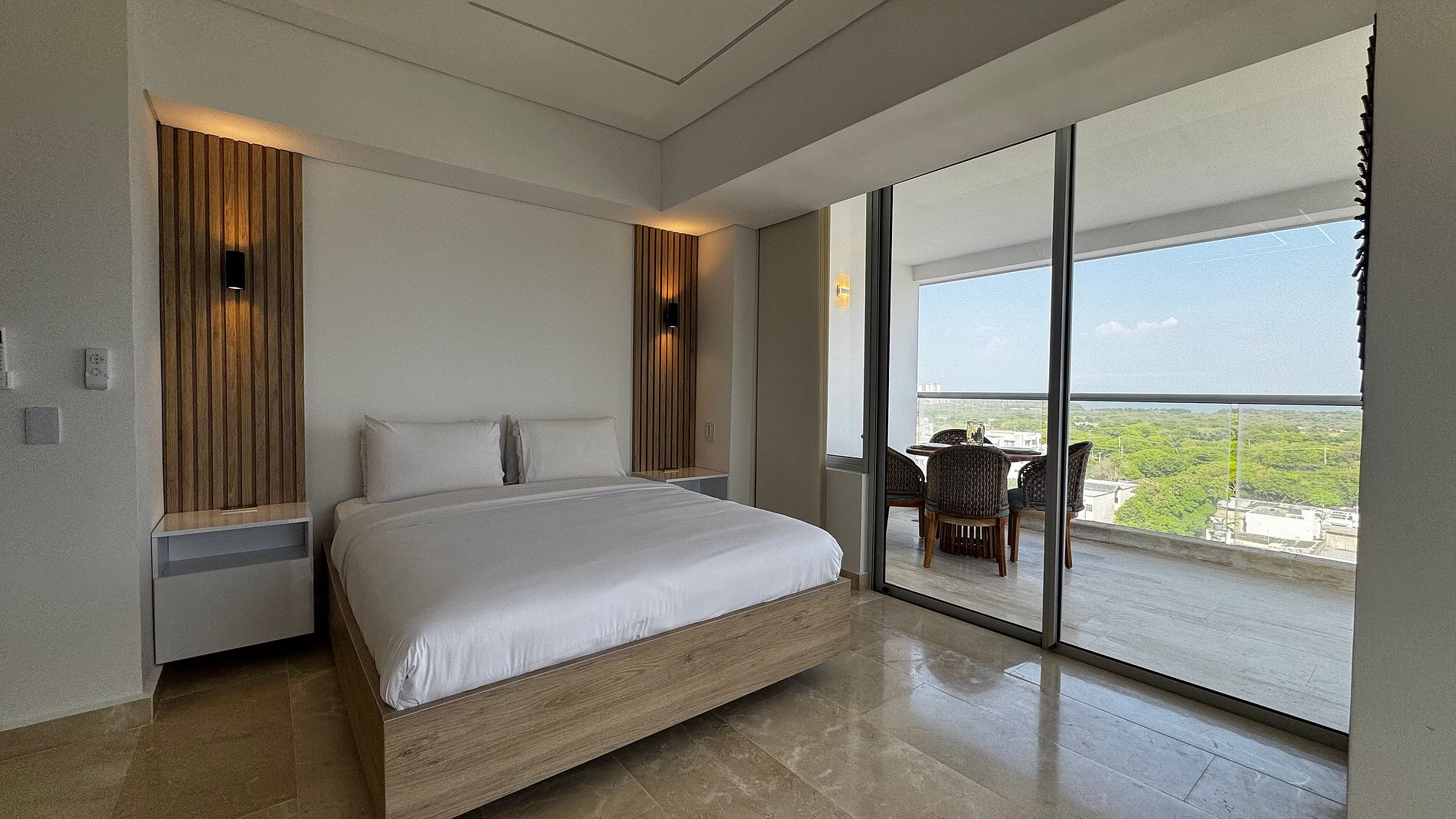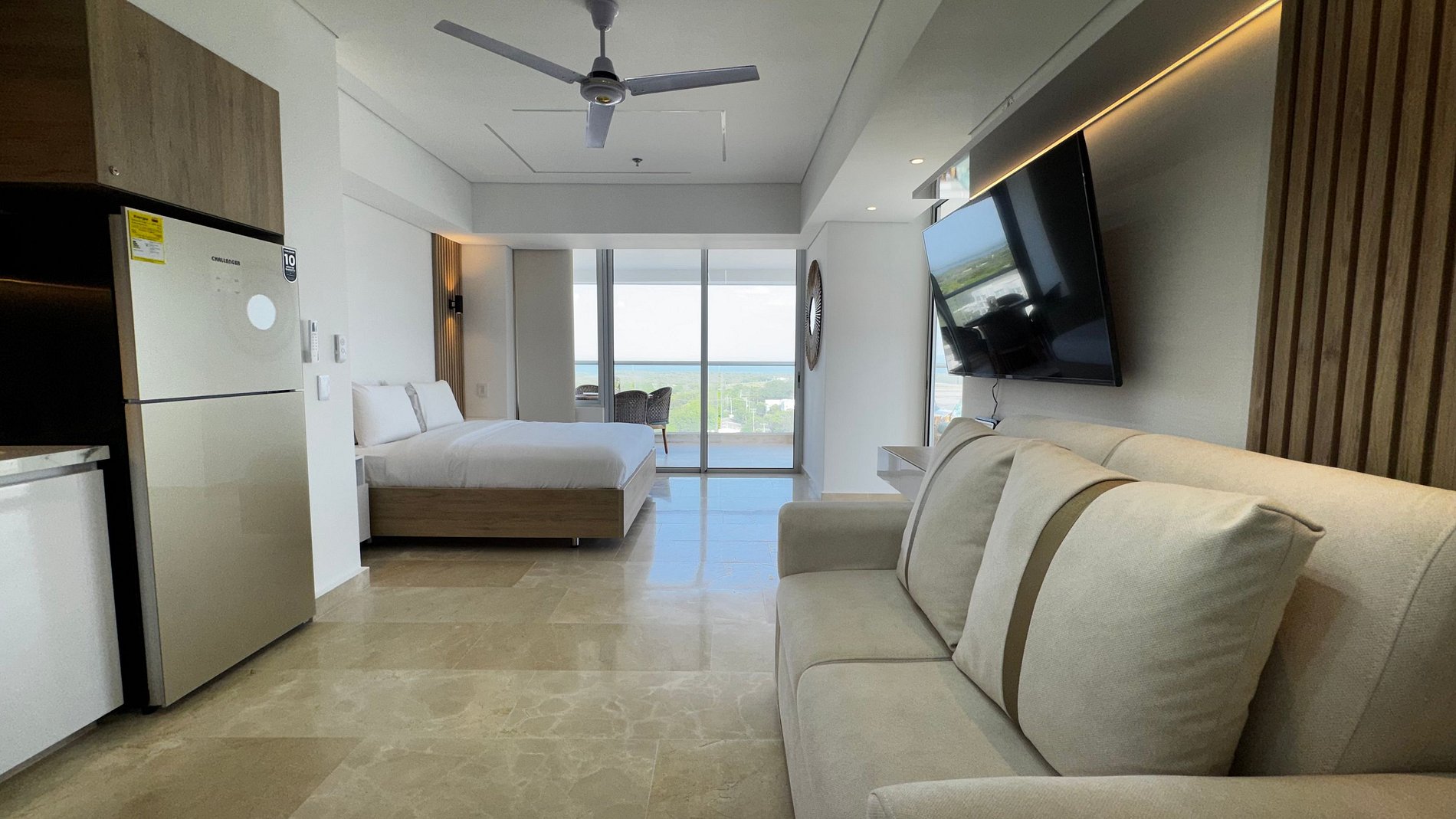 Hermosa suite en piso alto con vista 180° al mar, la Ciénaga y la ciudad. Cuenta con cama Queen, Smart TV, aire acondicionado y ventilador de techo. Balcón amoblado con comedor exterior y sillas lounge. Cocina totalmente equipada con nevera, microondas, cafetera y barra-comedor. Baño moderno con ducha en vidrio esmerilado y cerradura digital para mayor seguridad.