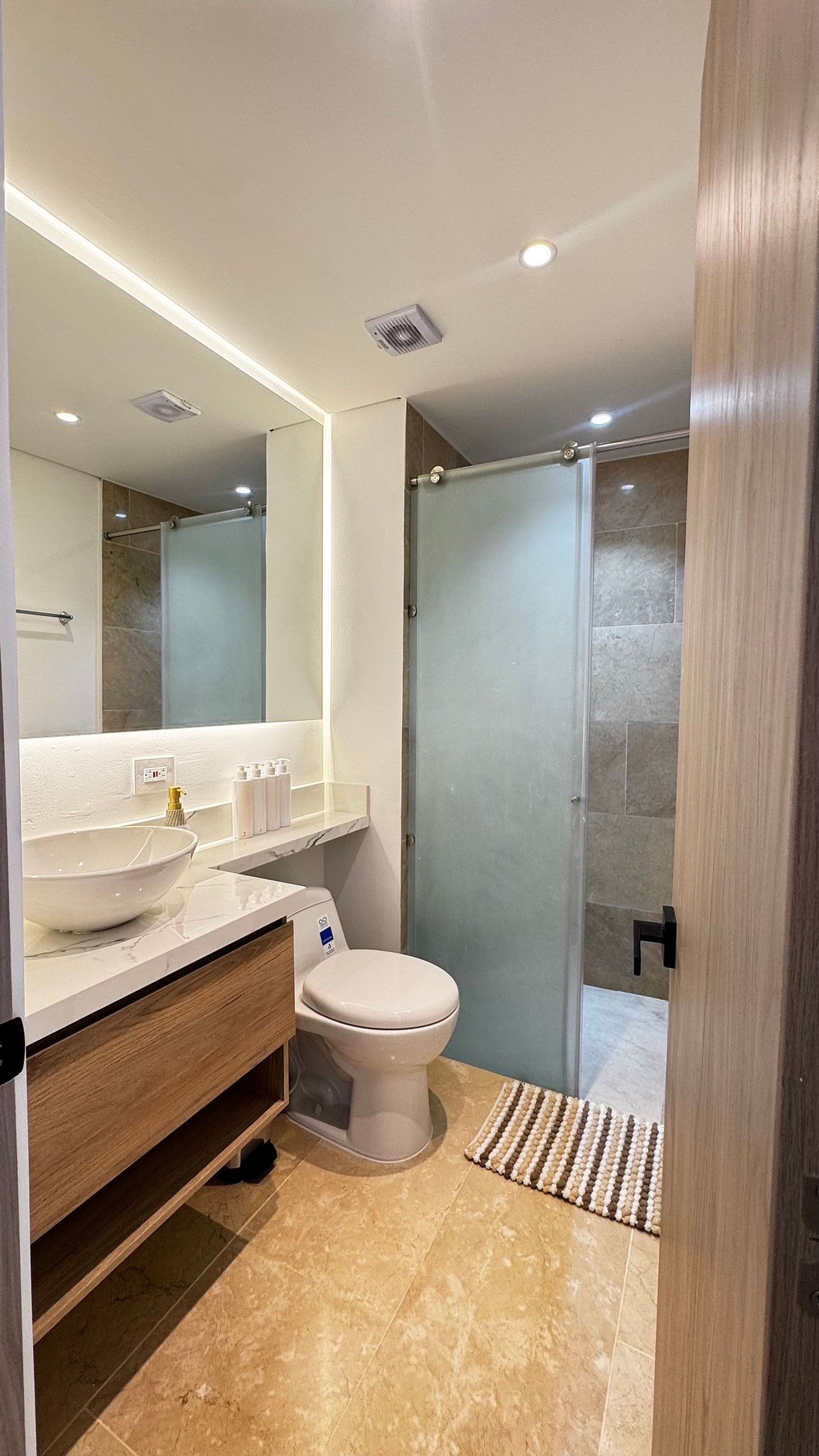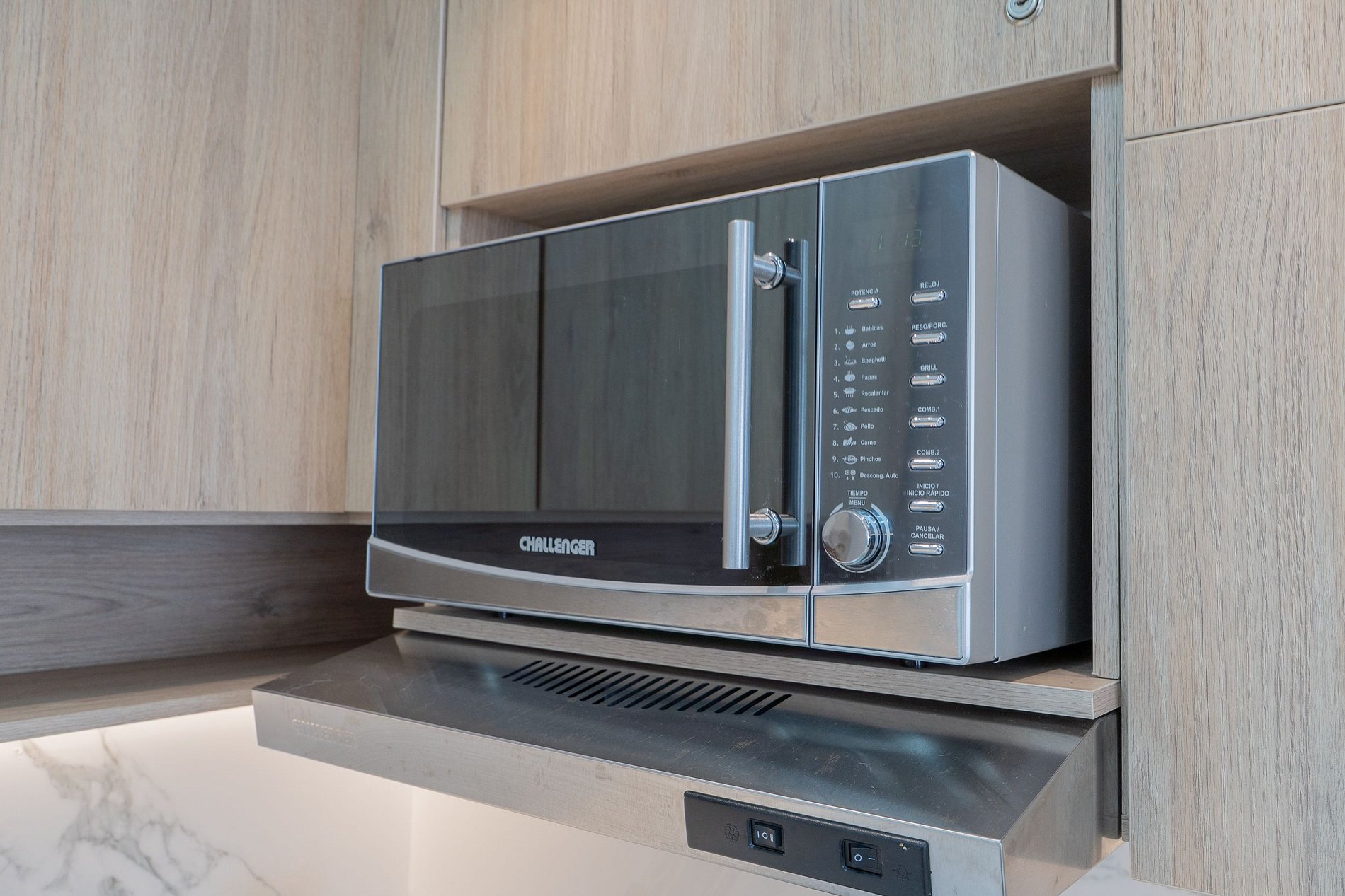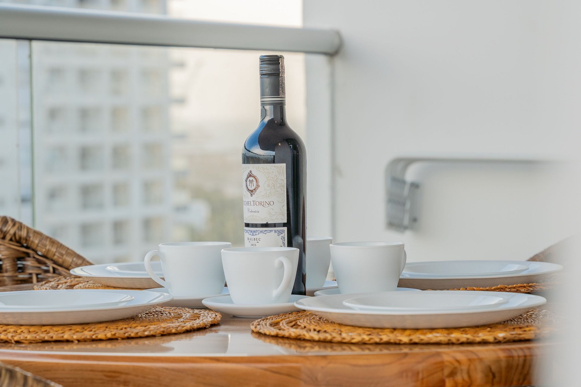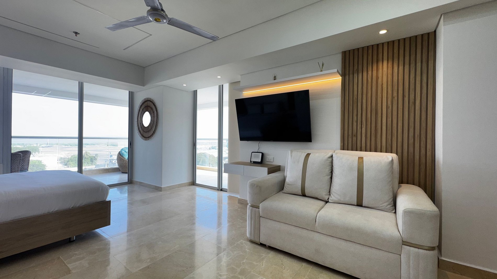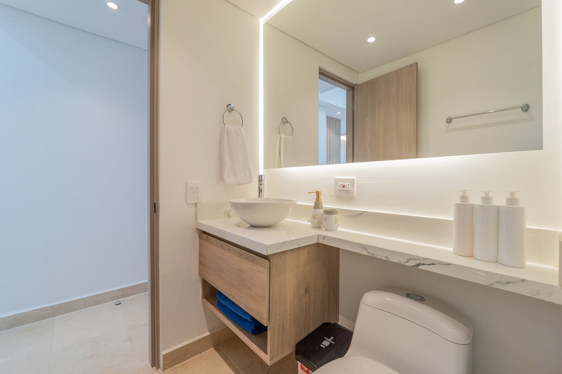 Hermosa suite en piso alto con vista 180° al mar, la Ciénaga y la ciudad. Cuenta con cama Queen, Smart TV, aire acondicionado y ventilador de techo. Balcón amoblado con comedor exterior y sillas lounge. Cocina totalmente equipada con nevera, microondas, cafetera y barra-comedor. Baño moderno con ducha en vidrio esmerilado y cerradura digital para mayor seguridad.