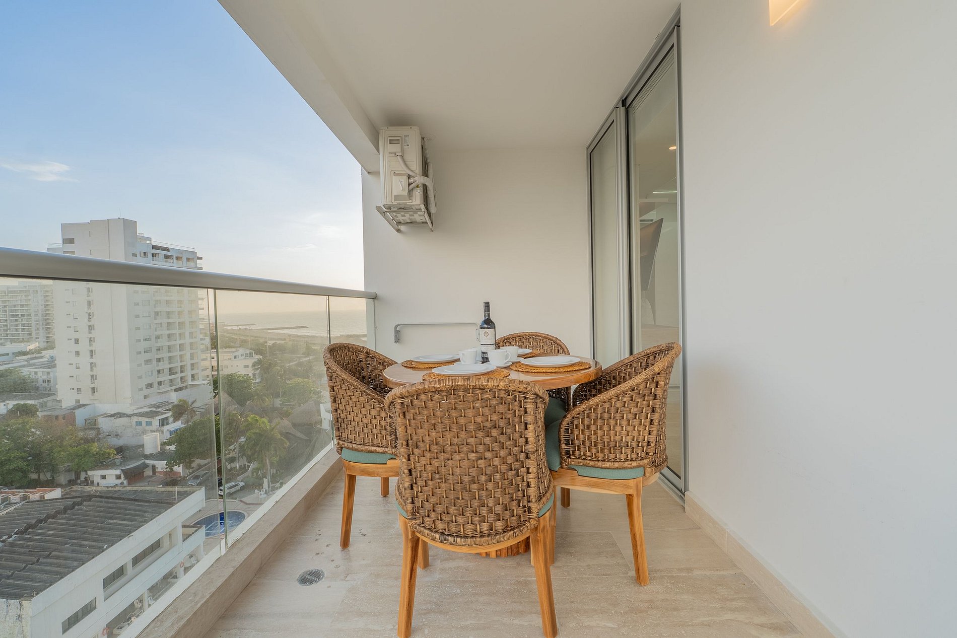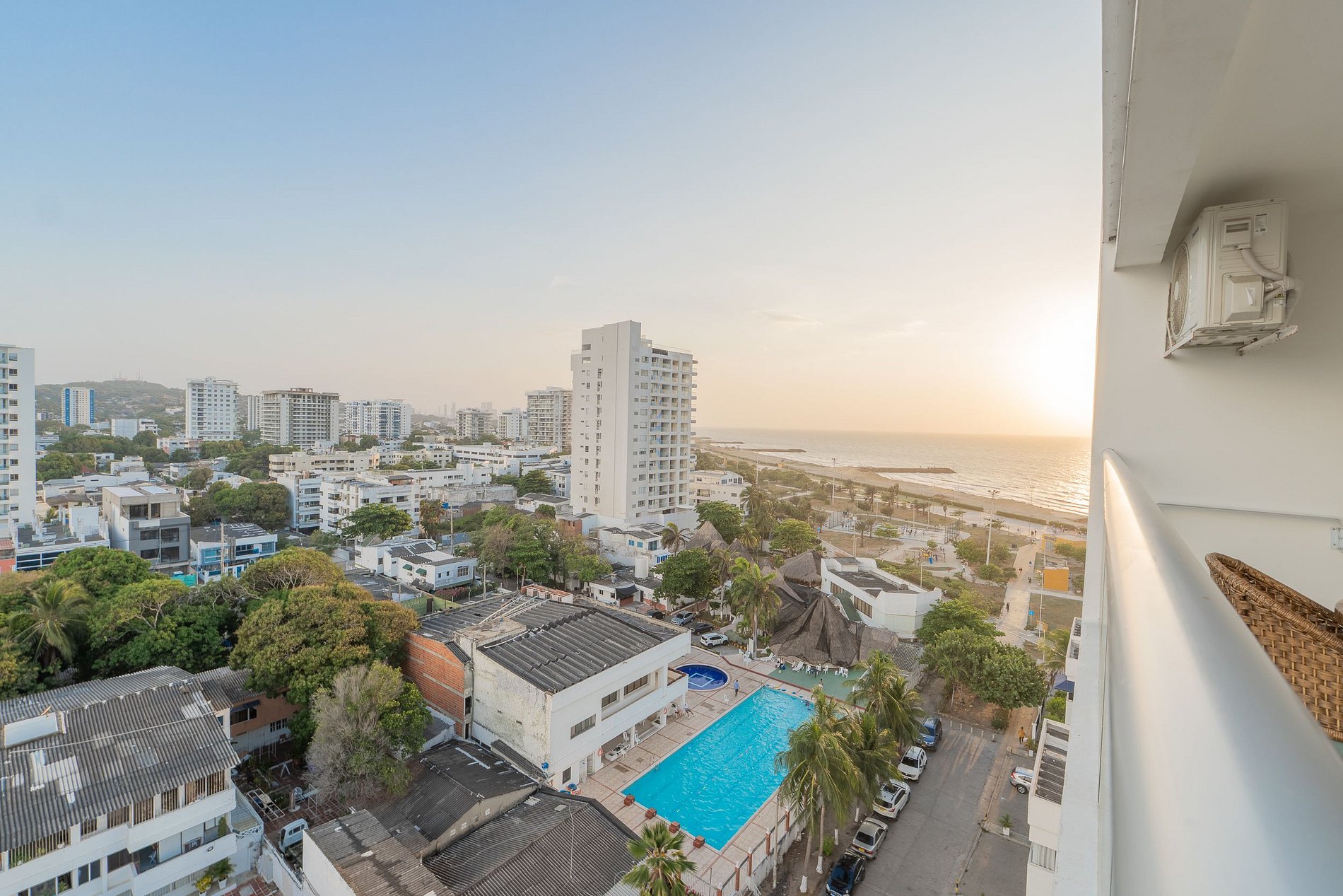 Hermosa suite en piso 1o con vista 180° a la Ciénaga, mar y la ciudad, a solo 7 minutos del centro histórico. Disfruta su balcón amoblado con comedor exterior y sillas lounge. Cuenta con cama queen, Smart TV, aire acondicionado, ventilador de techo y cerradura digital. La cocina está totalmente equipada con nevera, microondas, cafetera y barra-comedor. El baño moderno ofrece ducha en vidrio esmerilado. El edificio incluye piscina semiolímpica, solárium, lobby y seguridad 24/7.