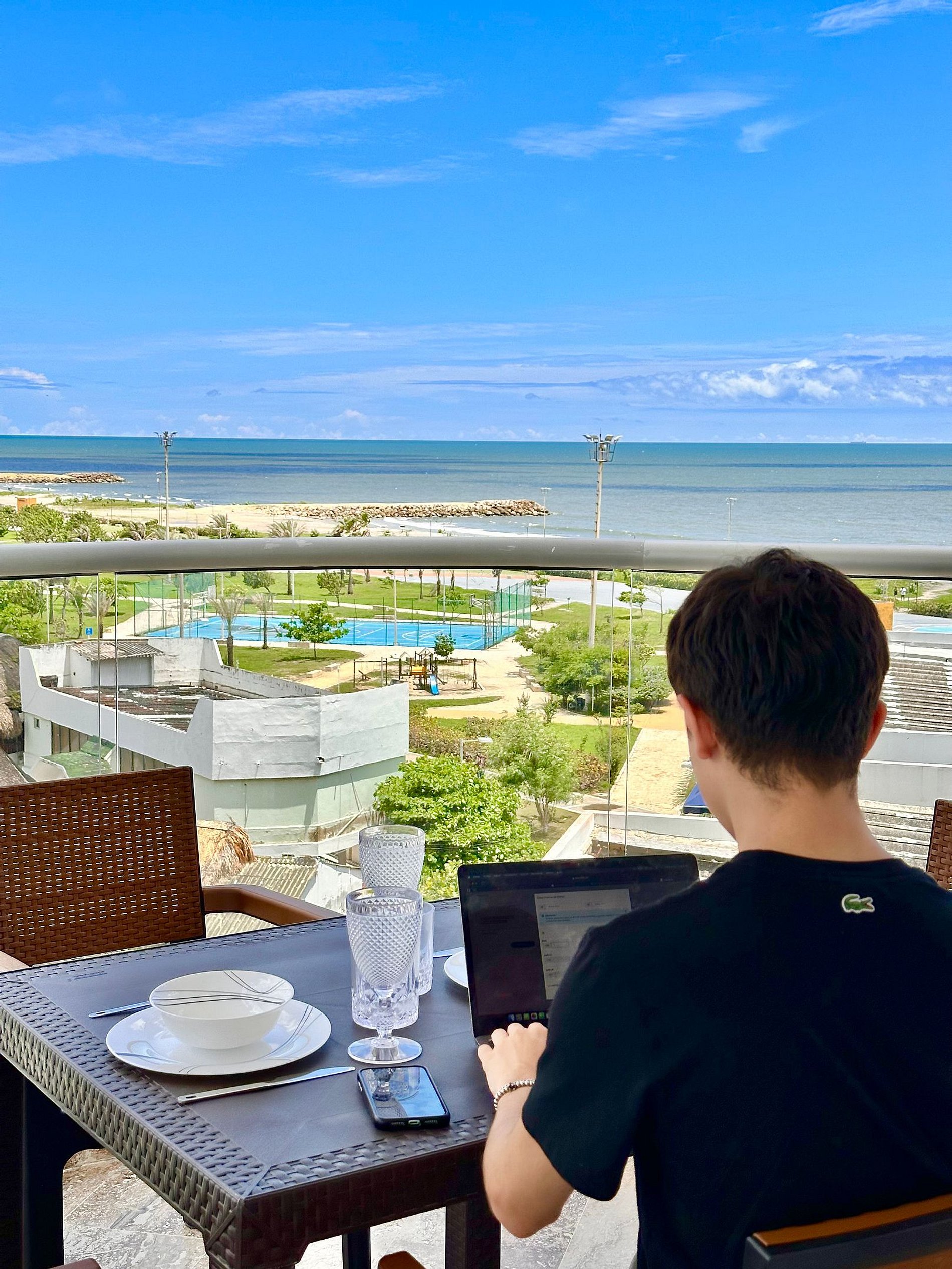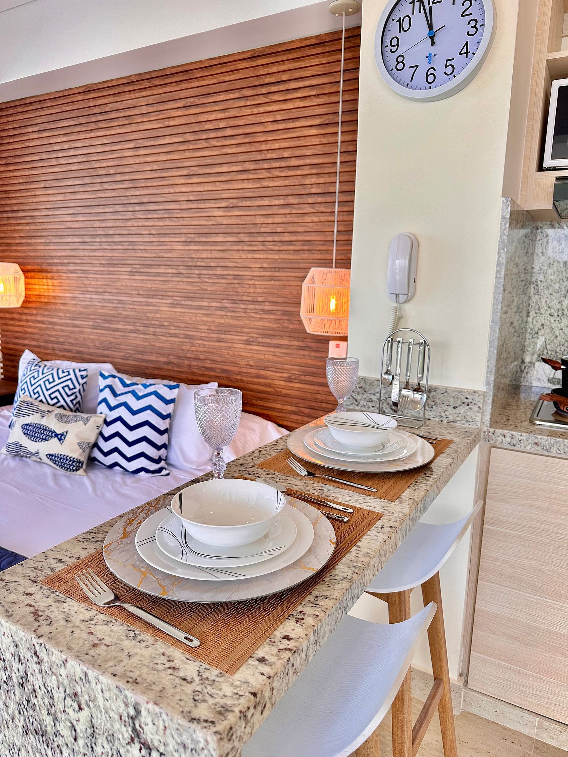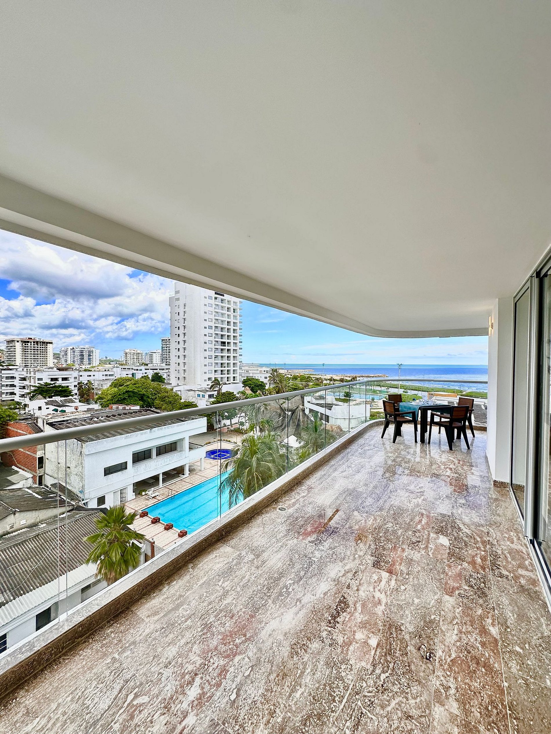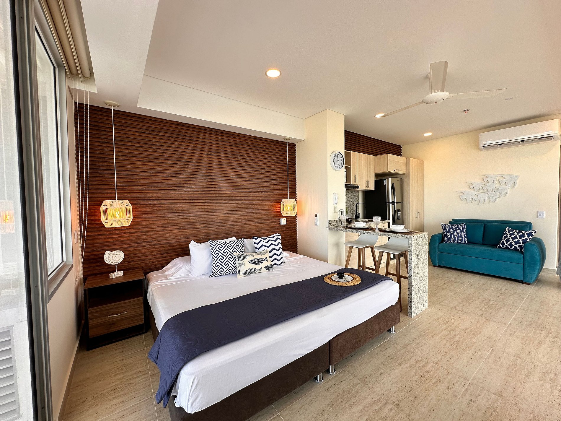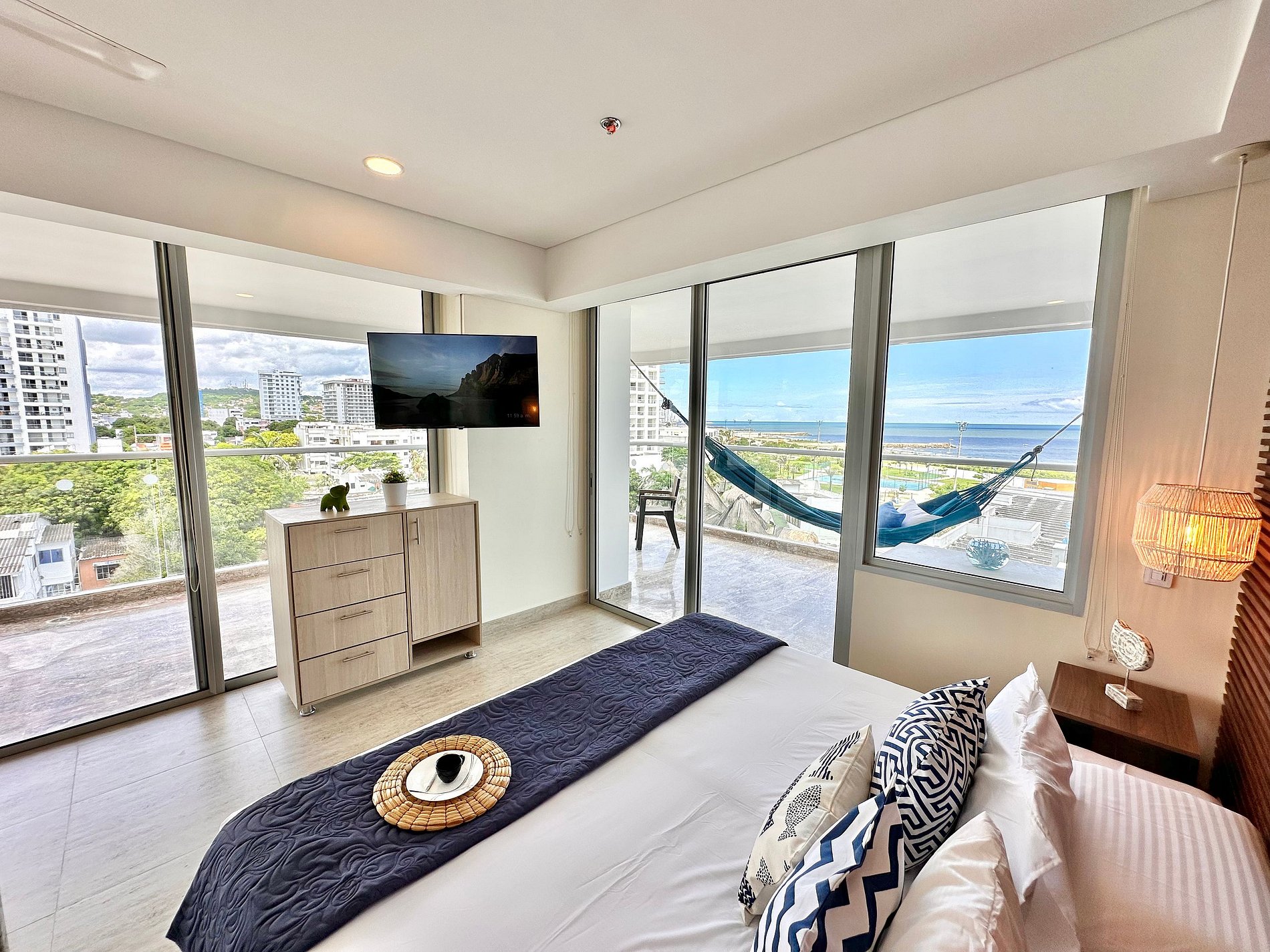 Moderno apartamento con cama king, sofá cama y cocina equipada. Destaca su amplio balcón panorámico con hamaca y comedor exterior con vista al mar. Ideal para relajarse y disfrutar Cartagena con total confort.