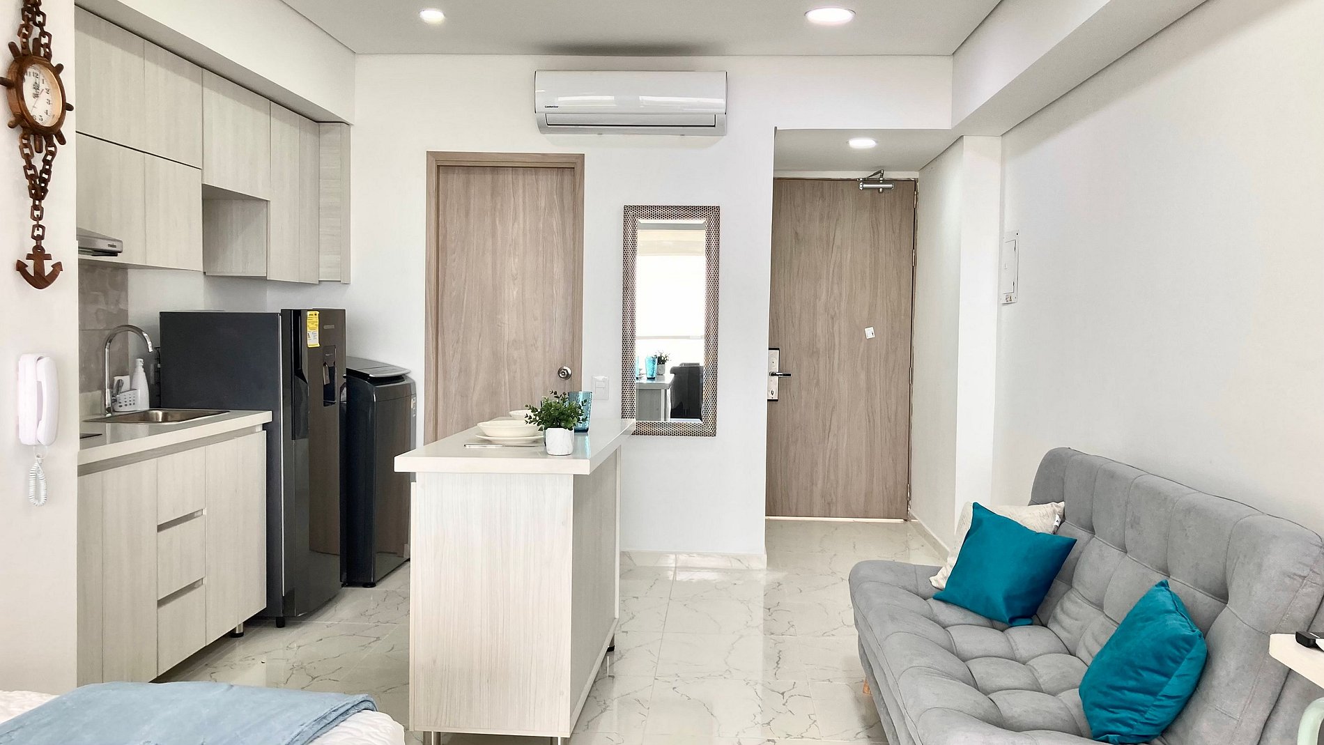 Disfruta de una suite moderna y luminosa en el exclusivo edificio Cartagena Beach, con lobby elegante y excelente ubicación frente al mar. El apartamento cuenta con cama Queen, sofá cama, Smart TV, WiFi y balcón privado con comedor y vista panorámica al Caribe. Su cocina full equipada incluye nevera, microondas, cafetera, menaje completo, lavadora y una práctica isla central móvil. Baño completo con ducha en vidrio, aire acondicionado y acceso seguro con chapa electrónica. A 2 min del aeropuerto