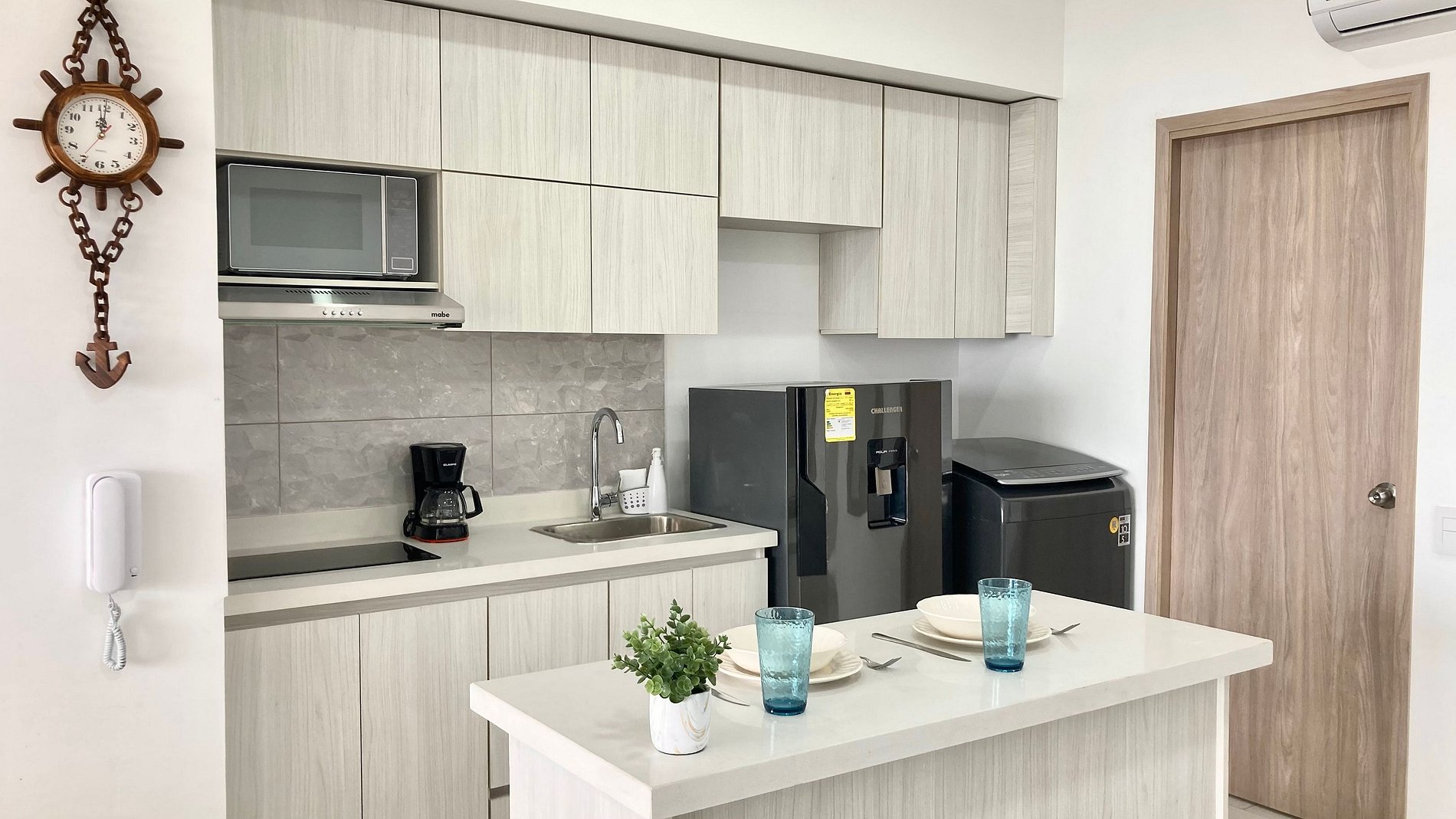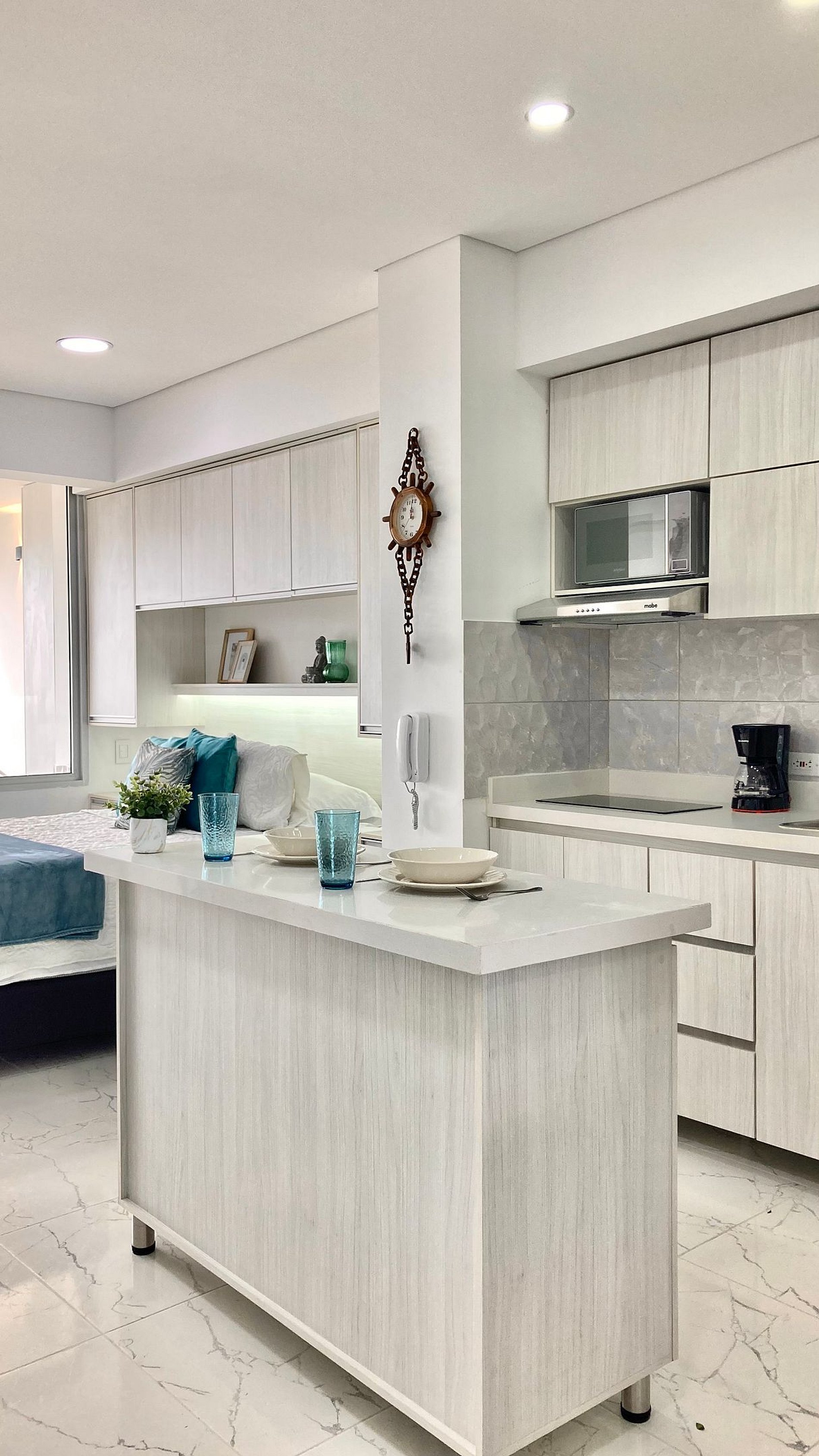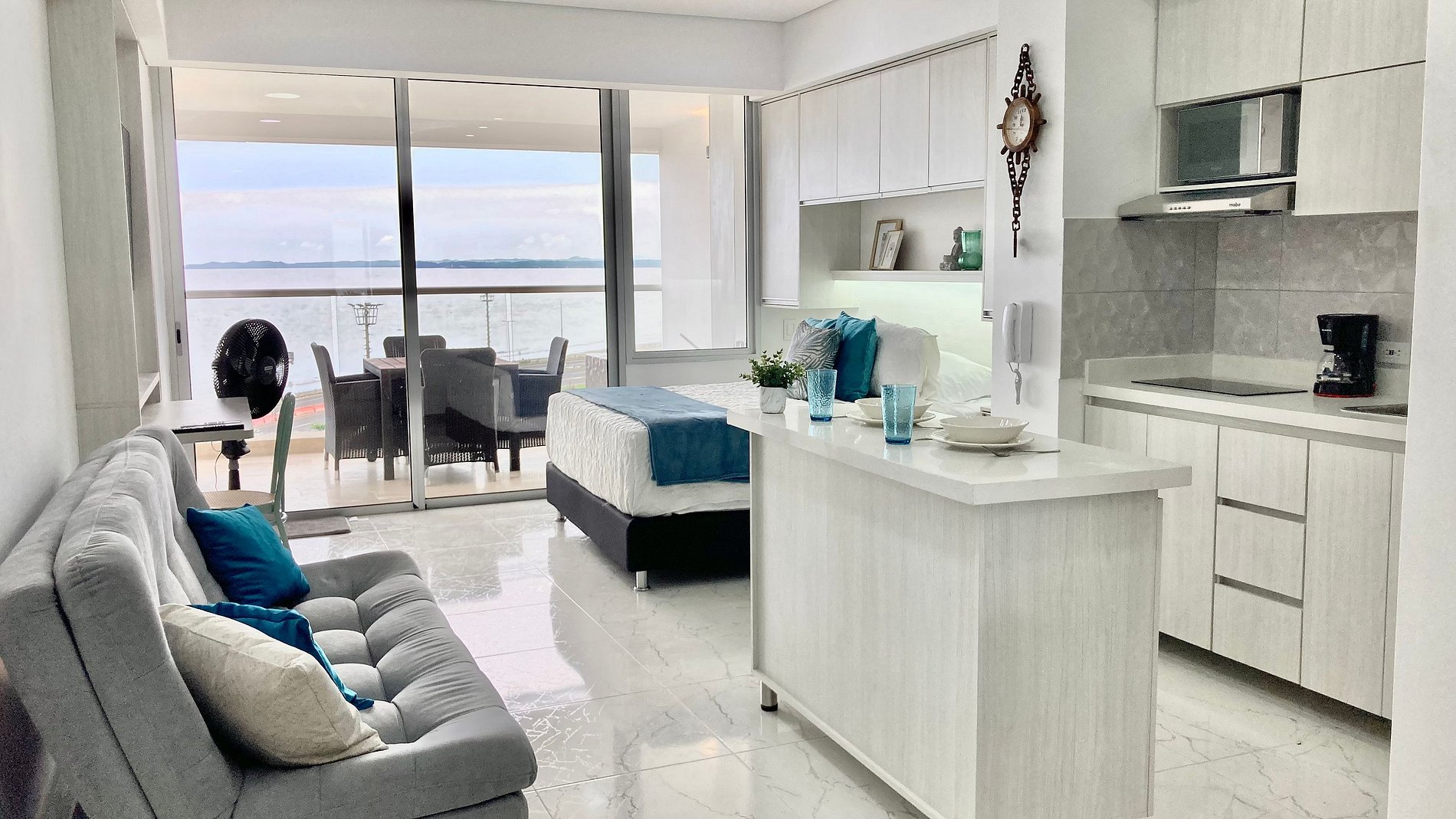 Disfruta la brisa del Caribe en una suite luminosa dentro de Cartagena Beach. Espacio tipo estudio con cama Queen, sala con sofá cama y escritorio bajo Smart TV; cocina full equipada con nevera, microondas, cafetera, menaje completo y isla central móvil que funciona como barra/comedor. Lavadora para estancias largas. Baño con ducha de vidrio. Abre los ventanales y vive el balcón privado con mesa para 4 y vista al mar.