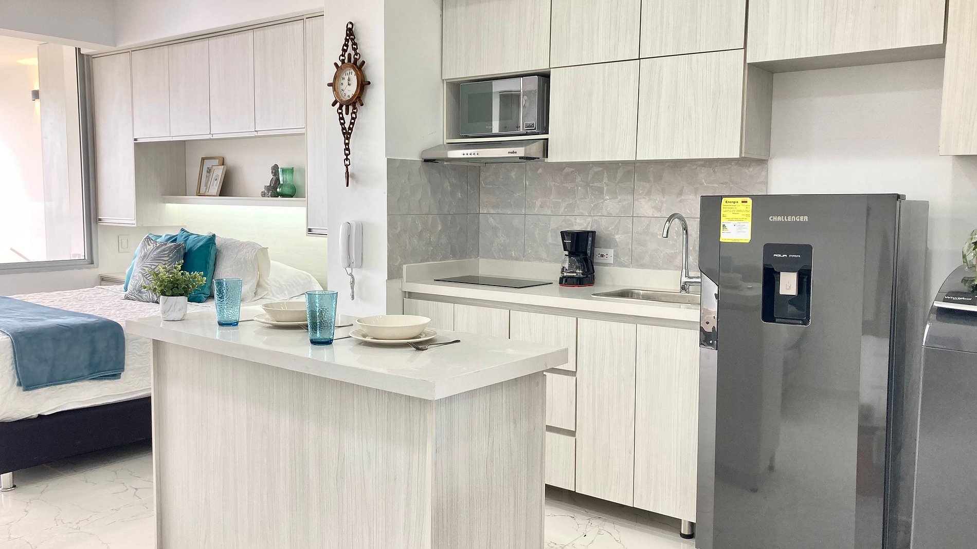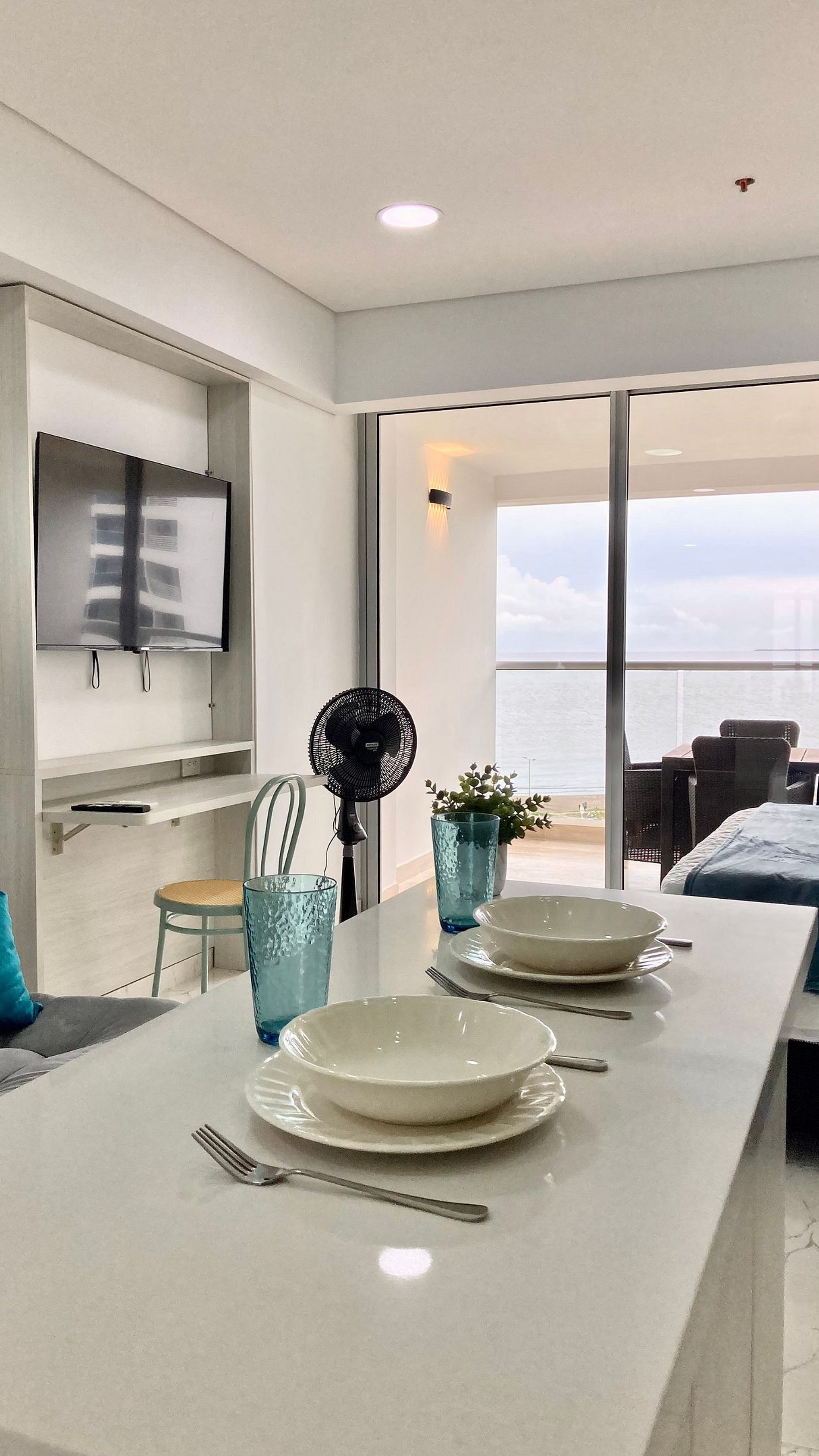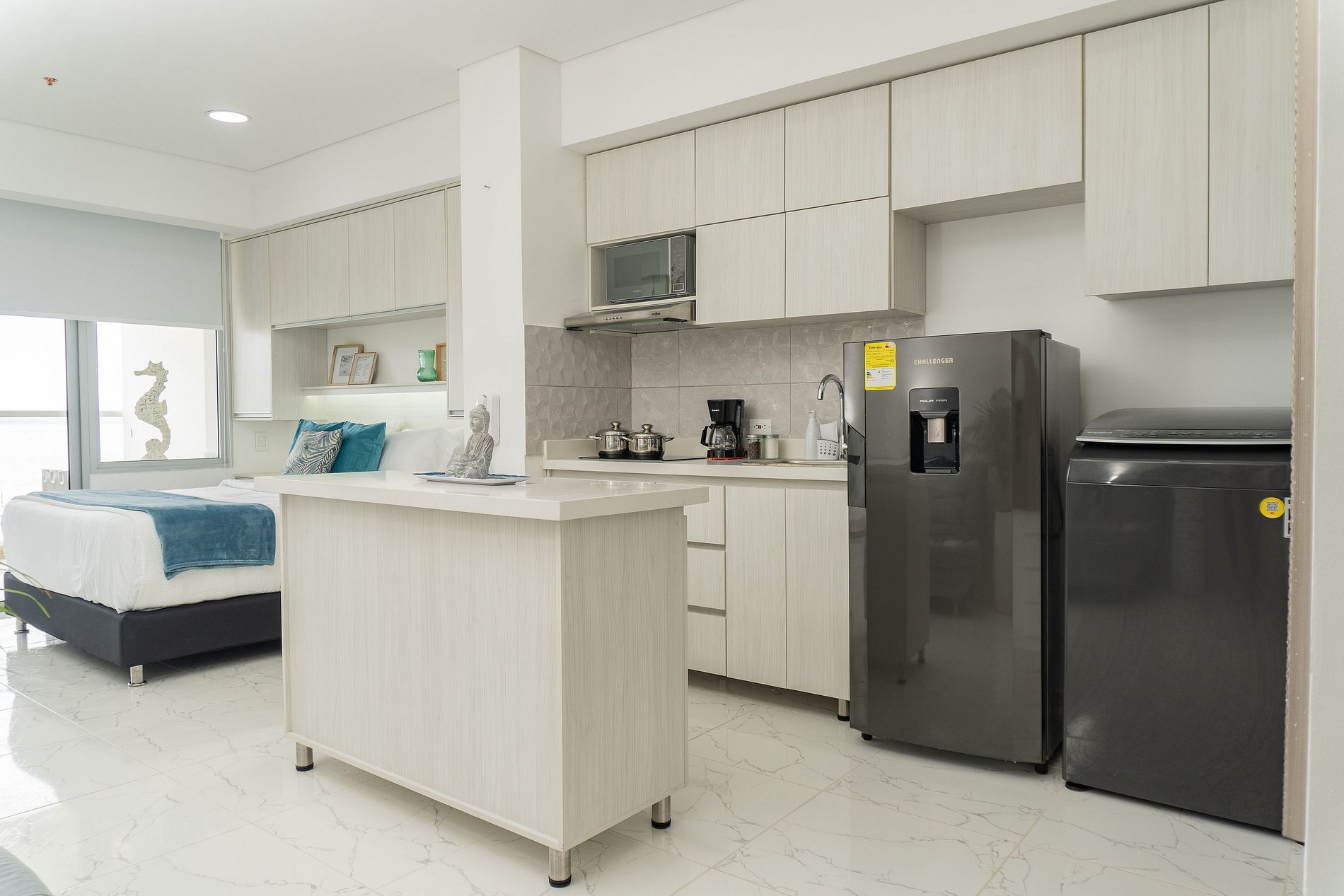 Disfruta la brisa del Caribe en una suite luminosa dentro de Cartagena Beach. Espacio tipo estudio con cama Queen, sala con sofá cama y escritorio bajo Smart TV; cocina full equipada con nevera, microondas, cafetera, menaje completo y isla central móvil que funciona como barra/comedor. Lavadora para estancias largas. Baño con ducha de vidrio. Abre los ventanales y vive el balcón privado con mesa para 4 y vista al mar.