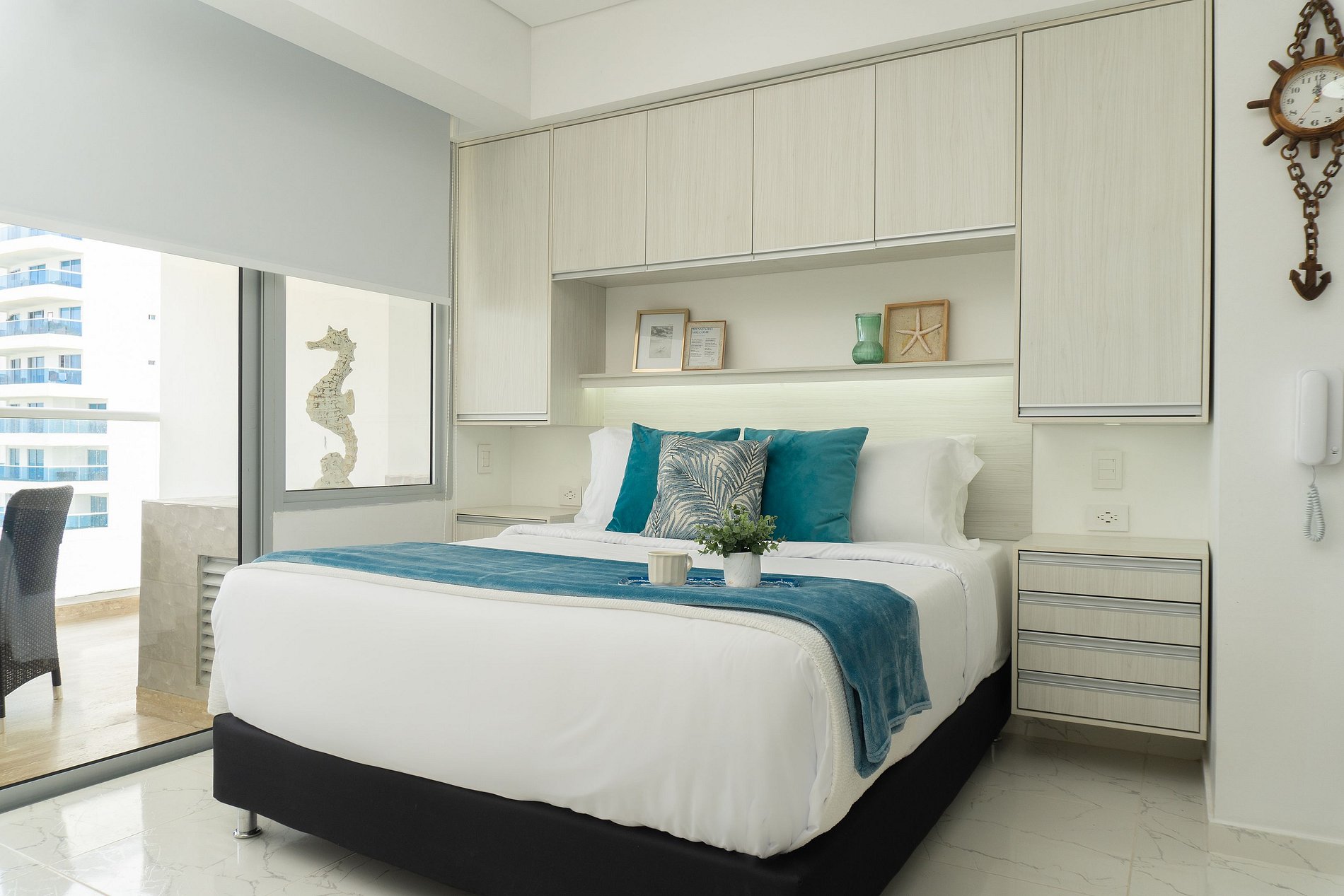 Disfruta de una suite moderna y luminosa en el exclusivo edificio Cartagena Beach, con lobby elegante y excelente ubicación frente al mar. El apartamento cuenta con cama Queen, sofá cama, Smart TV, WiFi y balcón privado con comedor y vista panorámica al Caribe. Su cocina full equipada incluye nevera, microondas, cafetera, menaje completo, lavadora y una práctica isla central móvil. Baño completo con ducha en vidrio, aire acondicionado y acceso seguro con chapa electrónica. A 2 min del aeropuerto