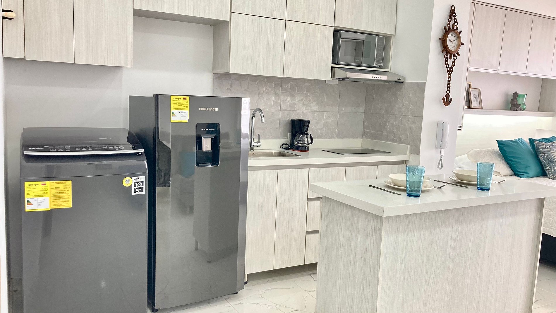 • Cocina moderna equipada con nevera grande, microondas, cafetera, licuadora, menaje y barra tipo isla.