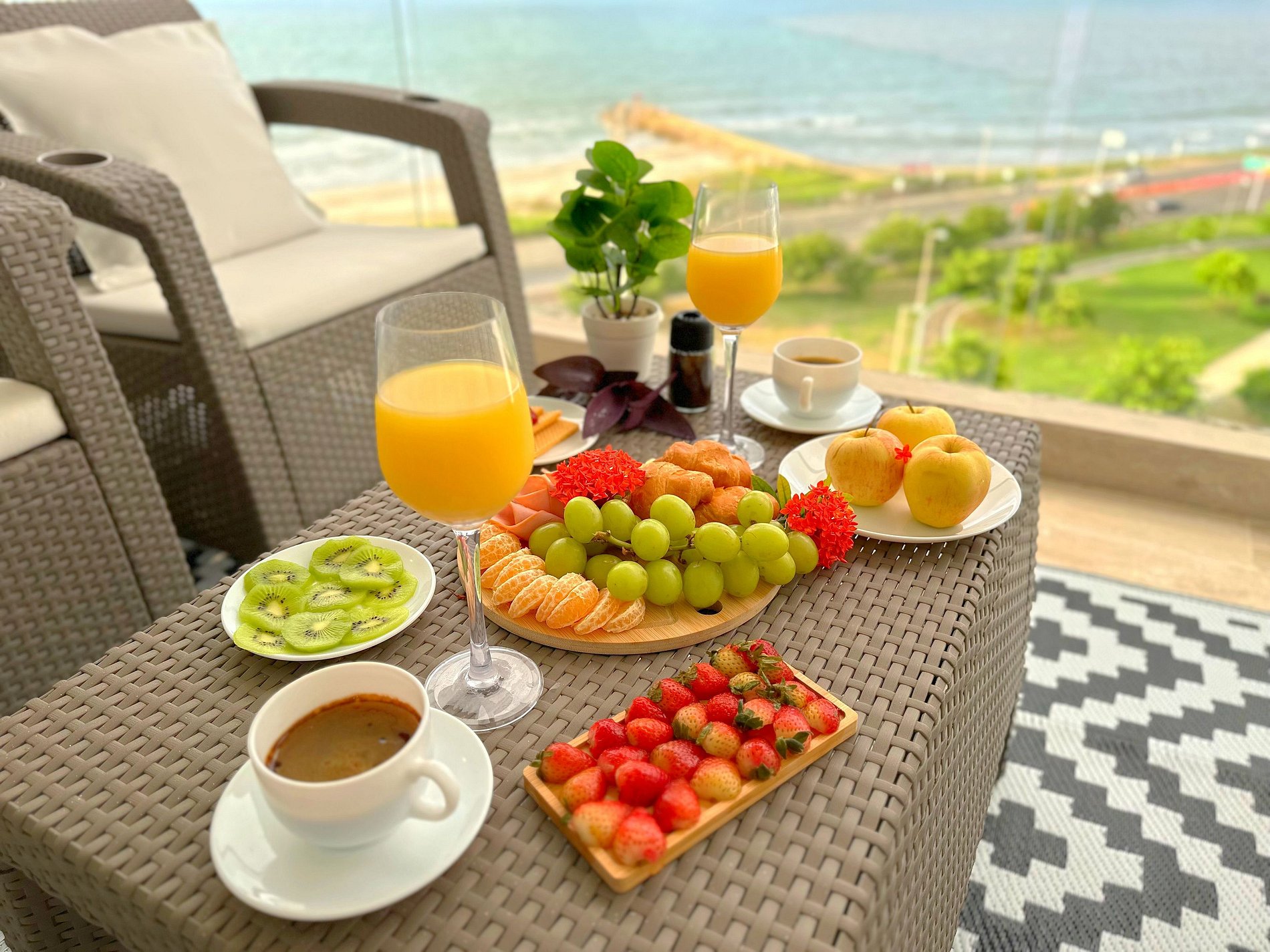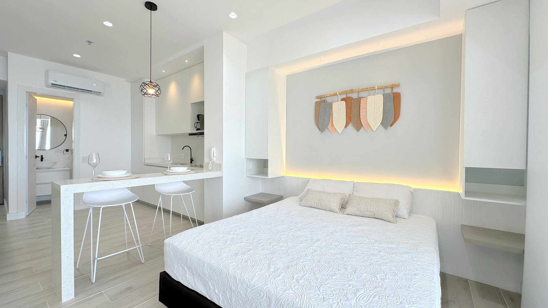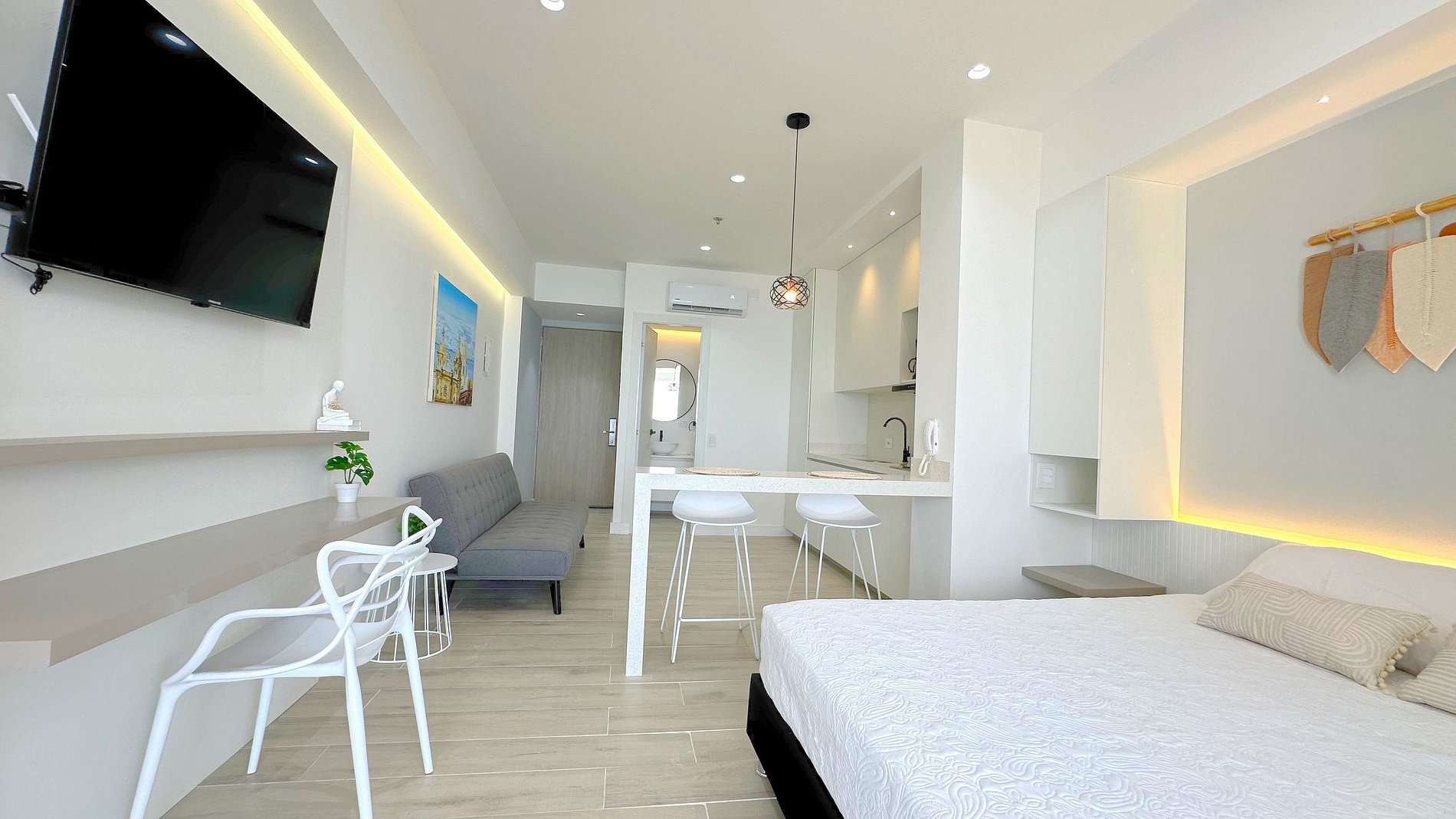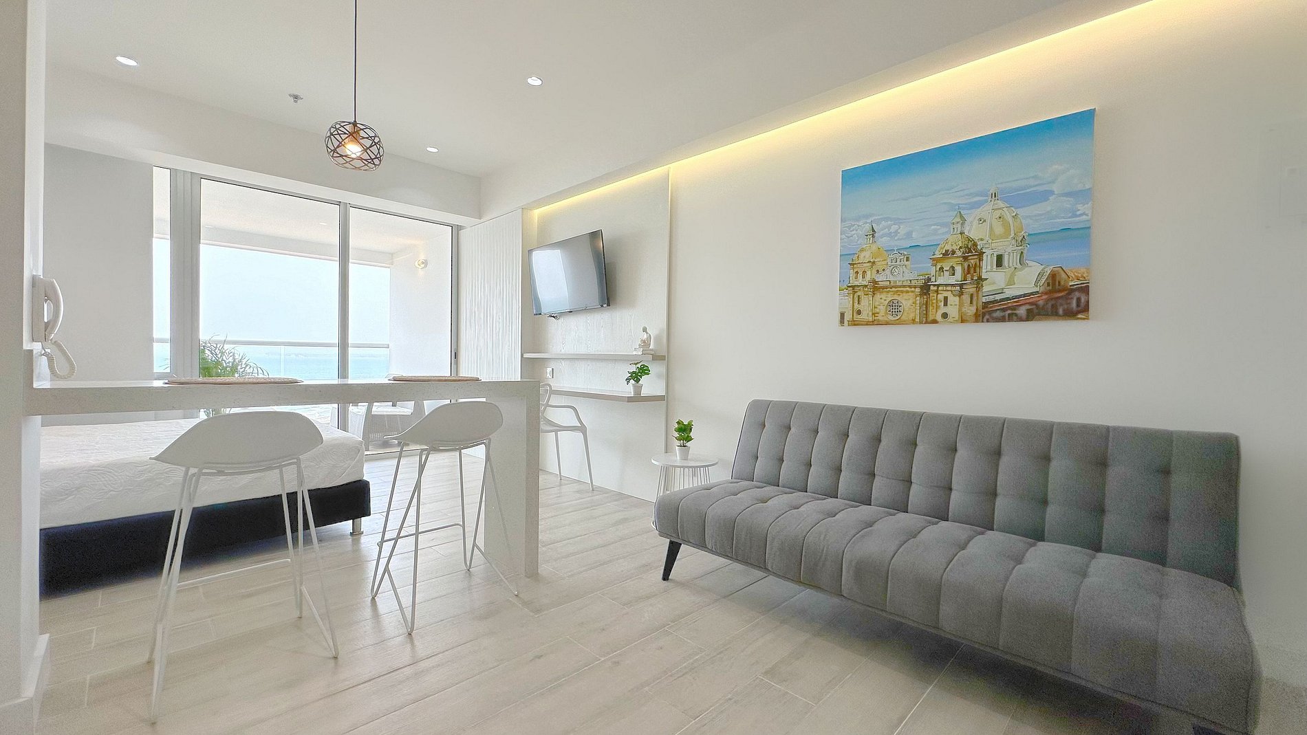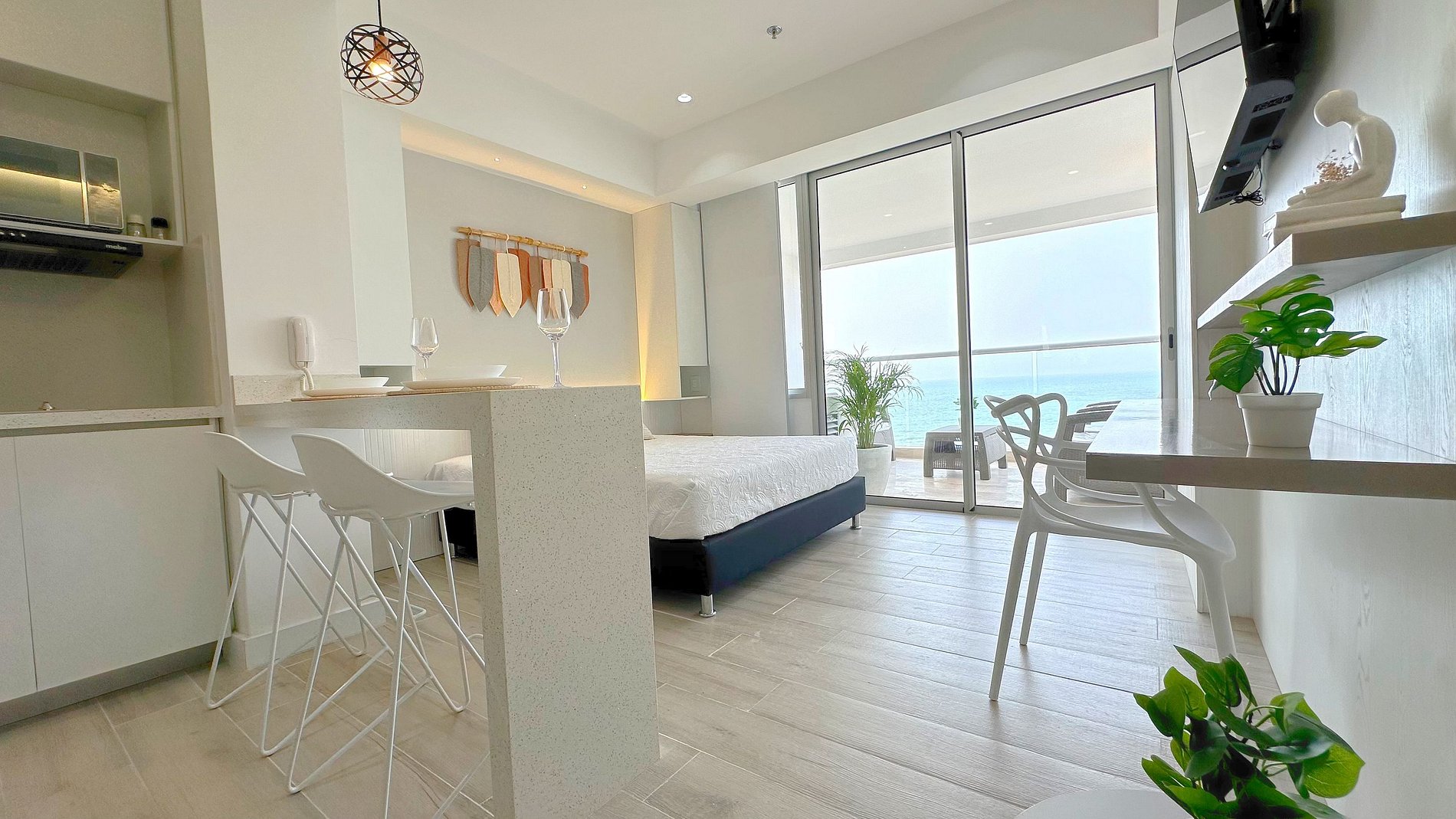 Apartamento frente al mar con balcón amoblado, cama Queen, sofá cama y cocina equipada. Diseño moderno, Wi-Fi veloz y baño elegante. En edificio con piscina, jacuzzi, sauna y turco. A 2 min del aeropuerto y 10 de la Ciudad Amurallada.