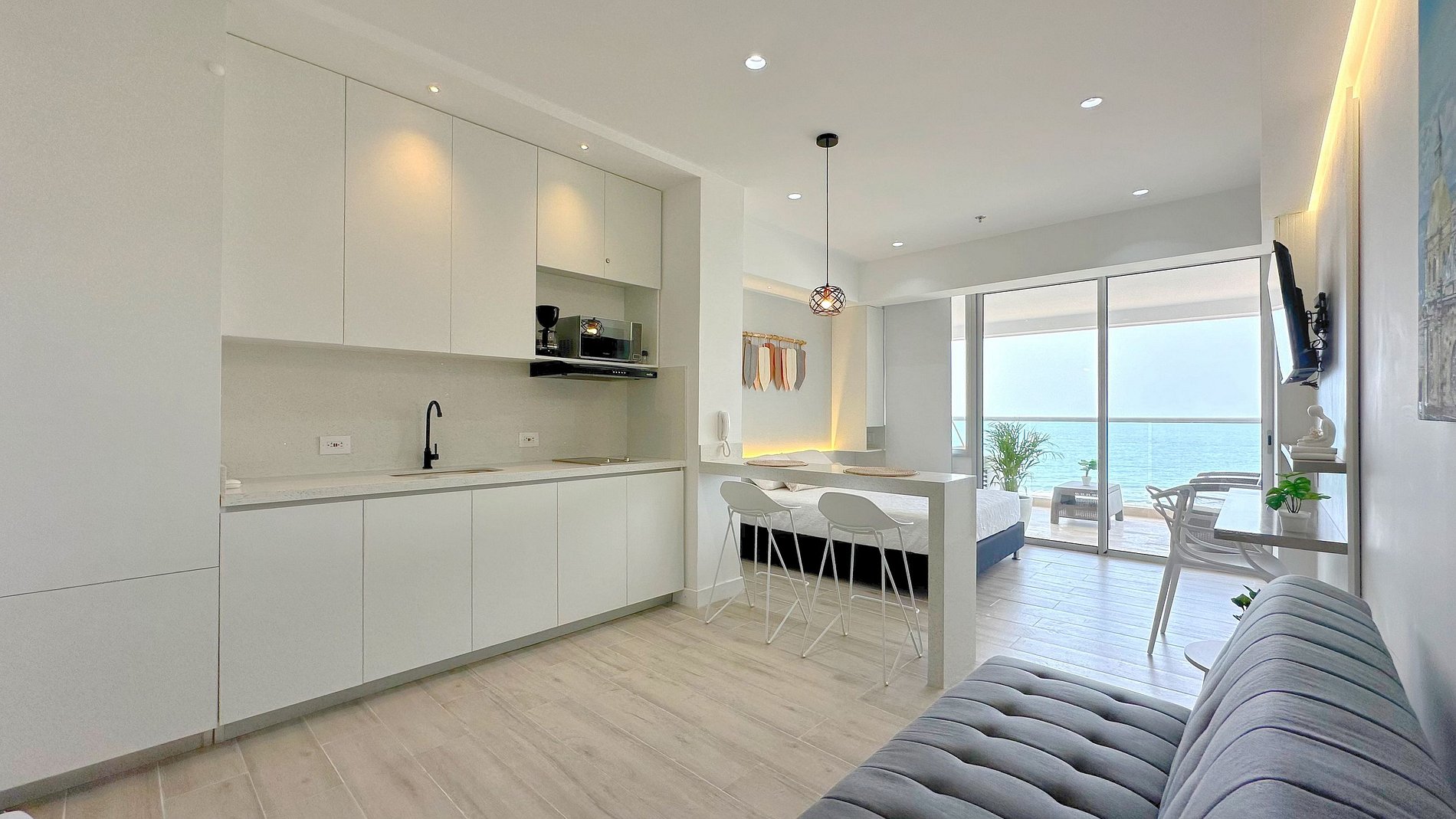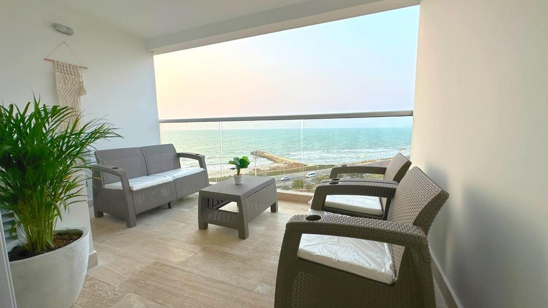 Apartamento frente al mar con balcón amoblado, cama Queen, sofá cama y cocina equipada. Diseño moderno, Wi-Fi veloz y baño elegante. En edificio con piscina, jacuzzi, sauna y turco. A 2 min del aeropuerto y 10 de la Ciudad Amurallada.