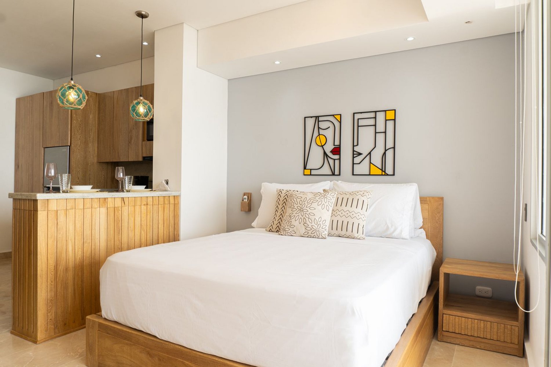 Disfruta de la vista al mar en esta suite moderna con balcón amplio y comedor exterior ideal para desayunos o cenas frente al océano. Interior minimalista con muebles en madera clara, cama Queen con ropa de calidad, blackout, aire acondicionado, Smart TV y escritorio. Sala con sofá cama que amplía la capacidad. Cocina equipada con barra, nevera, microondas, cafetera y menaje. Baño elegante con ducha amplia, espejo redondo y secador. Wi-Fi ultrarrápido y chapa digital para acceso con tarjeta