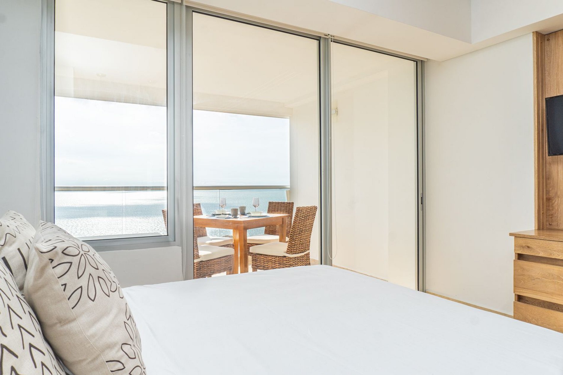 Suite minimalista frente al mar con balcón comedor, cama Queen, sofá cama, cocina equipada, baño moderno, escritorio con Smart TV y Wi-Fi