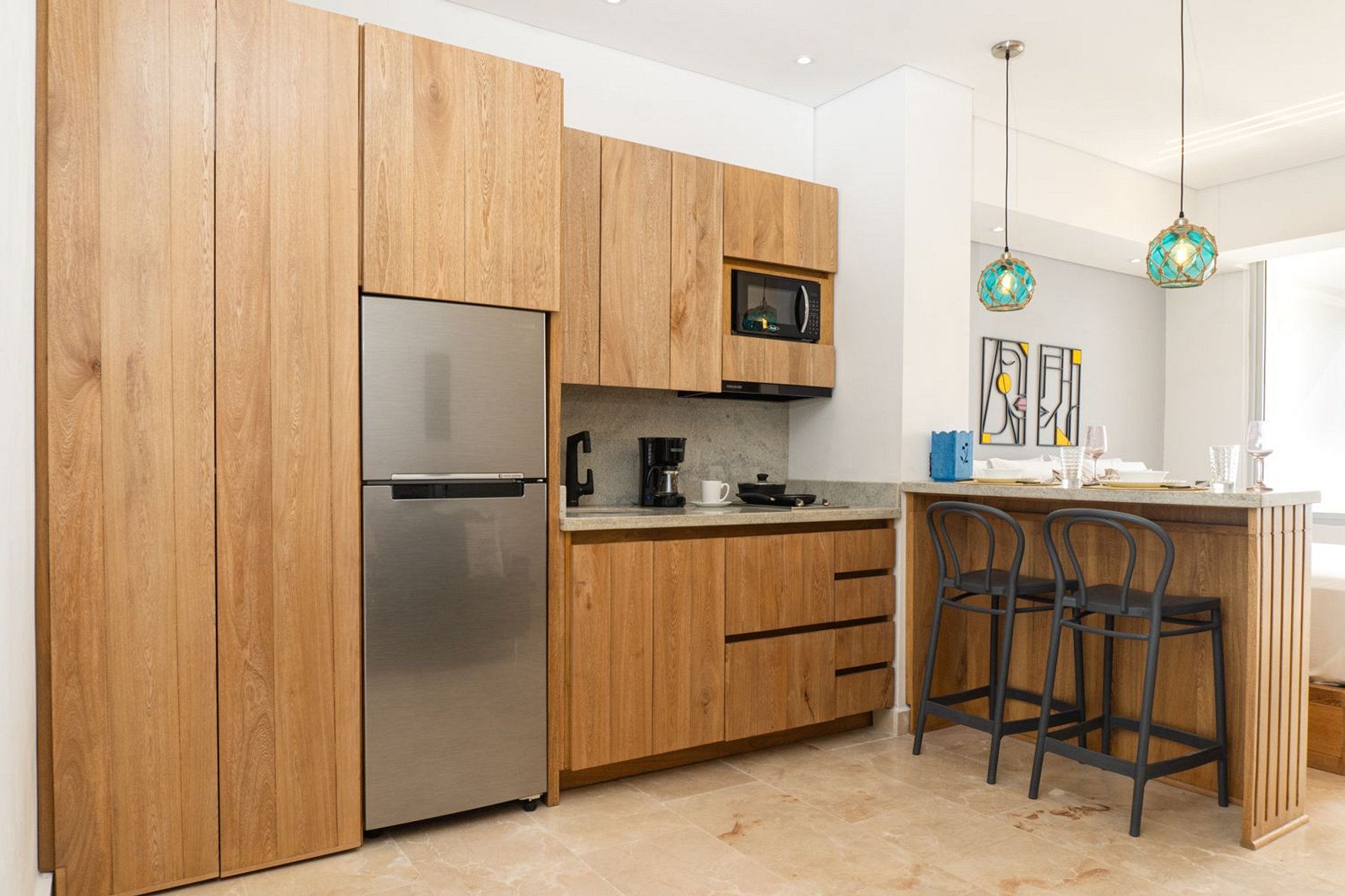 • Barra con superficie en piedra y 2 sillas altas