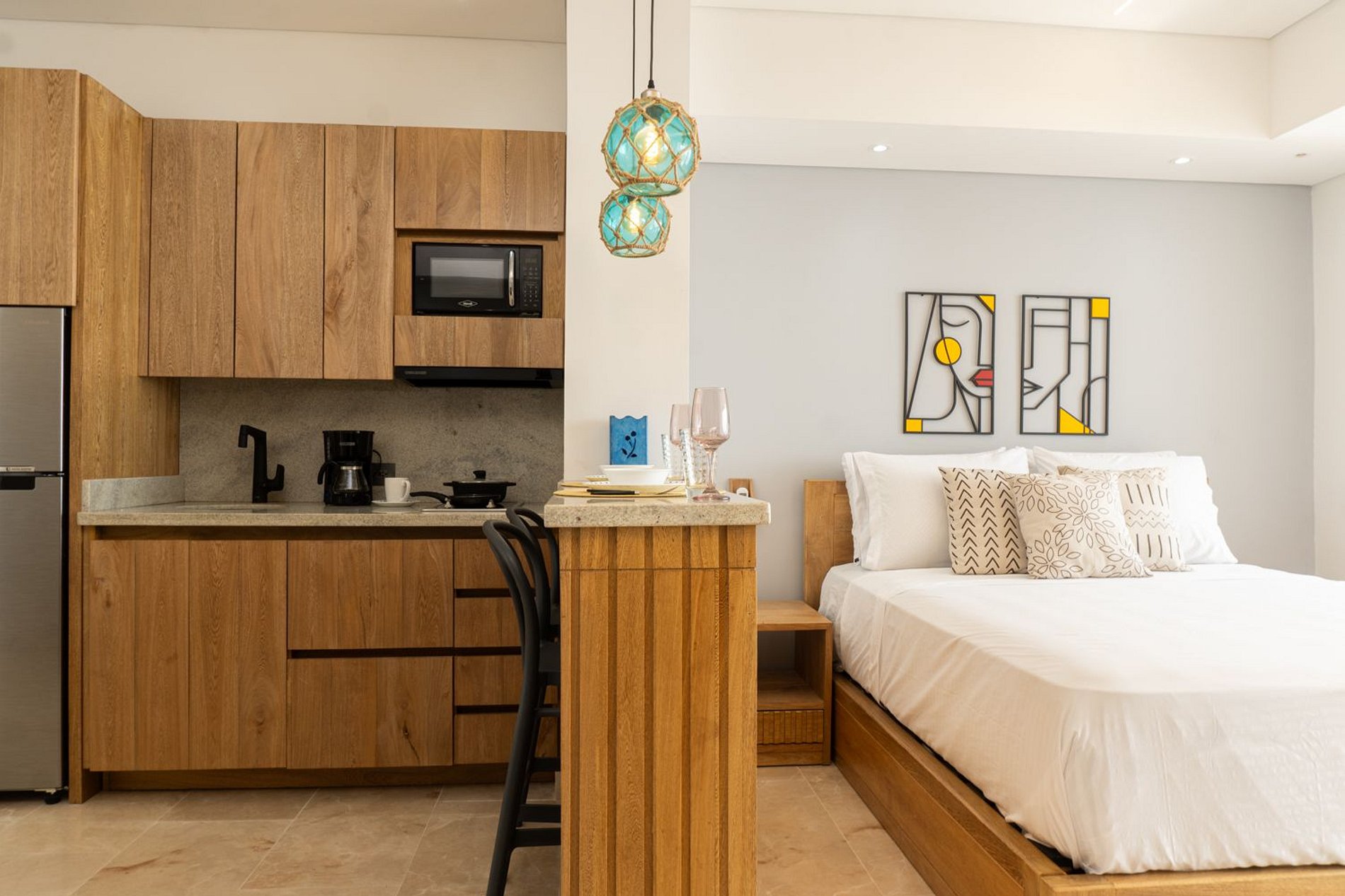 Disfruta de la vista al mar en esta suite moderna con balcón amplio y comedor exterior ideal para desayunos o cenas frente al océano. Interior minimalista con muebles en madera clara, cama Queen con ropa de calidad, blackout, aire acondicionado, Smart TV y escritorio. Sala con sofá cama que amplía la capacidad. Cocina equipada con barra, nevera, microondas, cafetera y menaje. Baño elegante con ducha amplia, espejo redondo y secador. Wi-Fi ultrarrápido y chapa digital para acceso con tarjeta