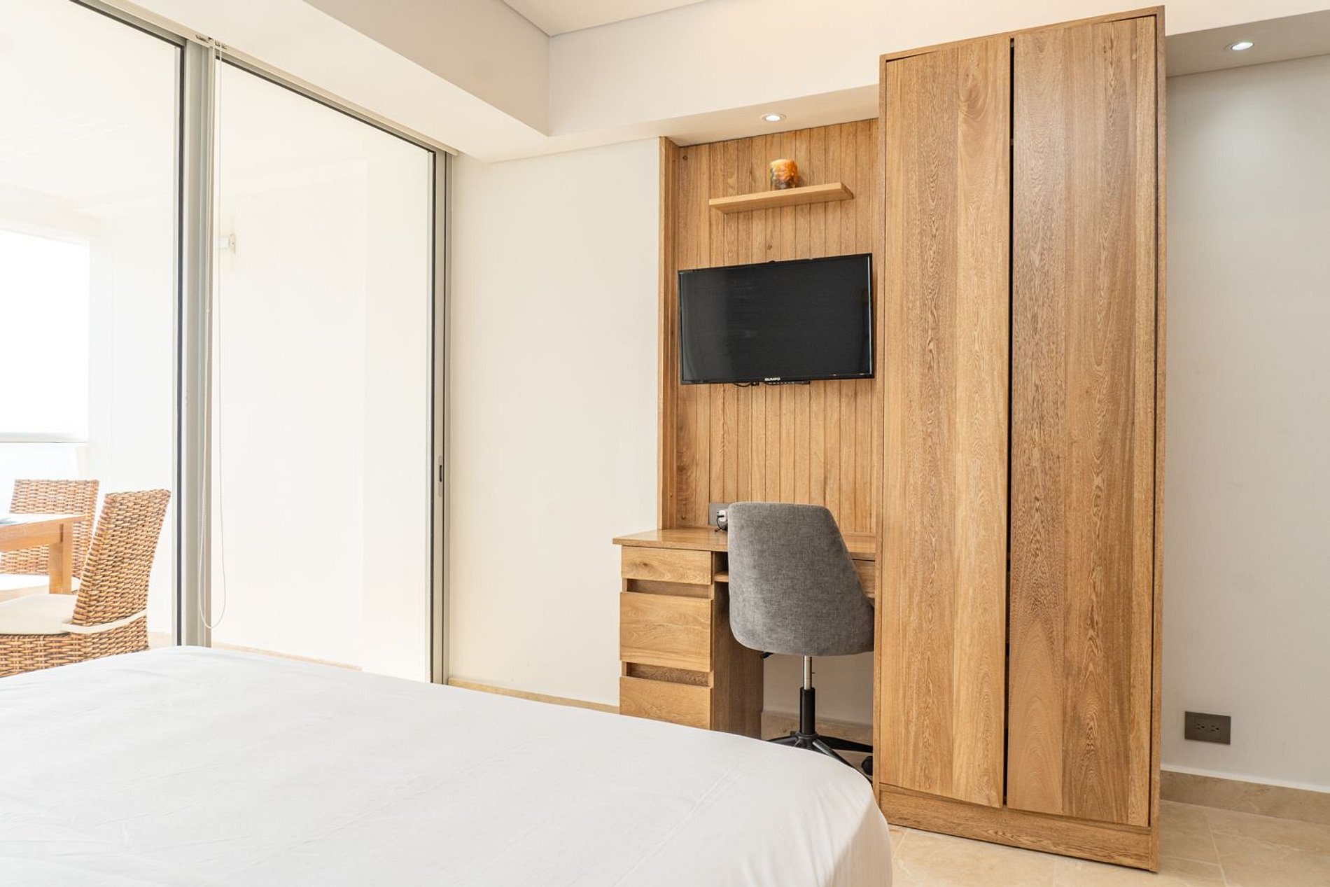 Suite minimalista frente al mar con balcón comedor, cama Queen, sofá cama, cocina equipada, baño moderno, escritorio con Smart TV y Wi-Fi