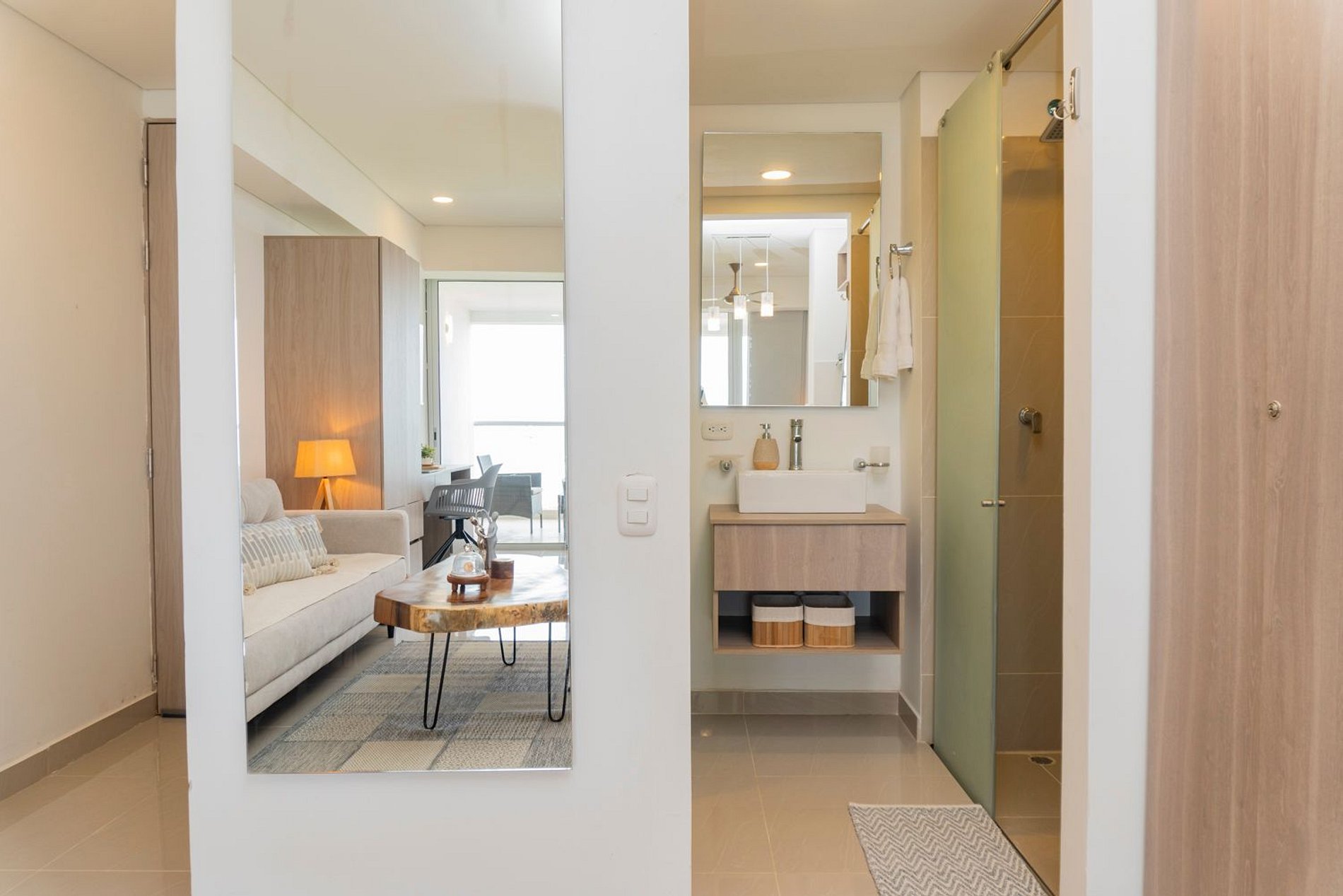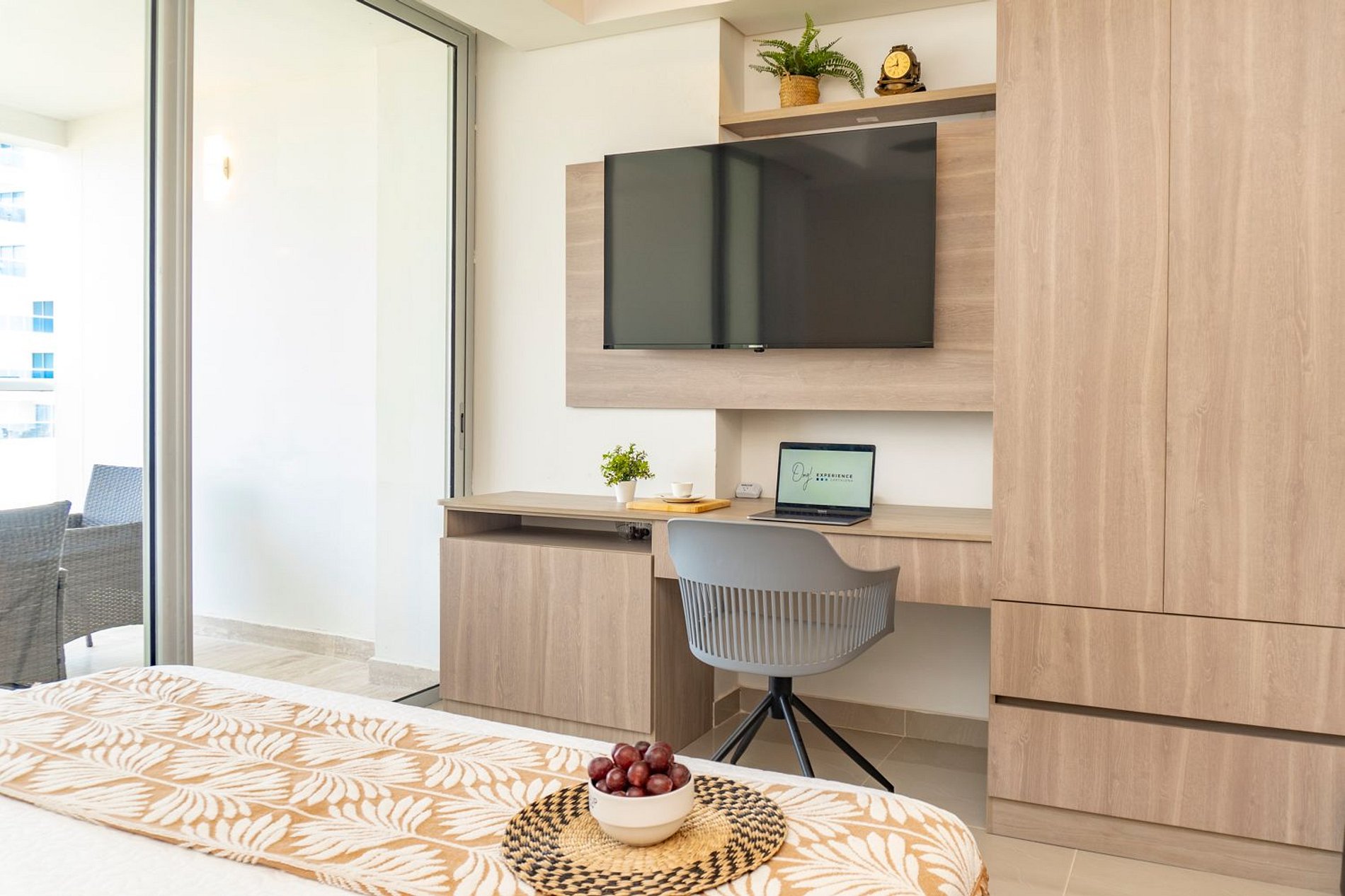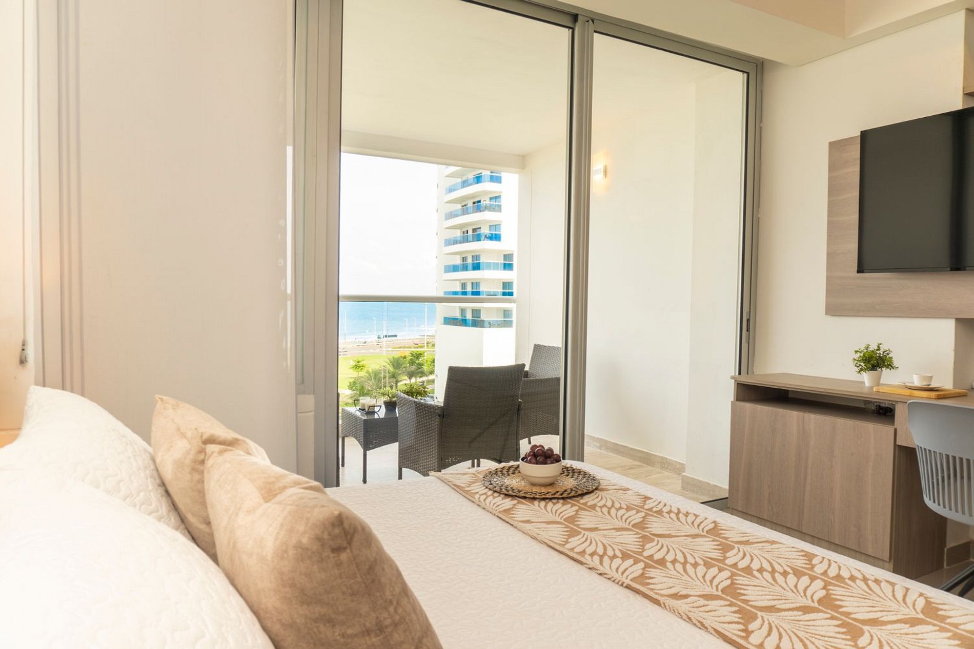 Apartamento moderno en el piso 6 con terraza privada y vista directa al mar y la Ciénaga. Espacio cómodo, luminoso y perfectamente equipado para estancias de trabajo o descanso.