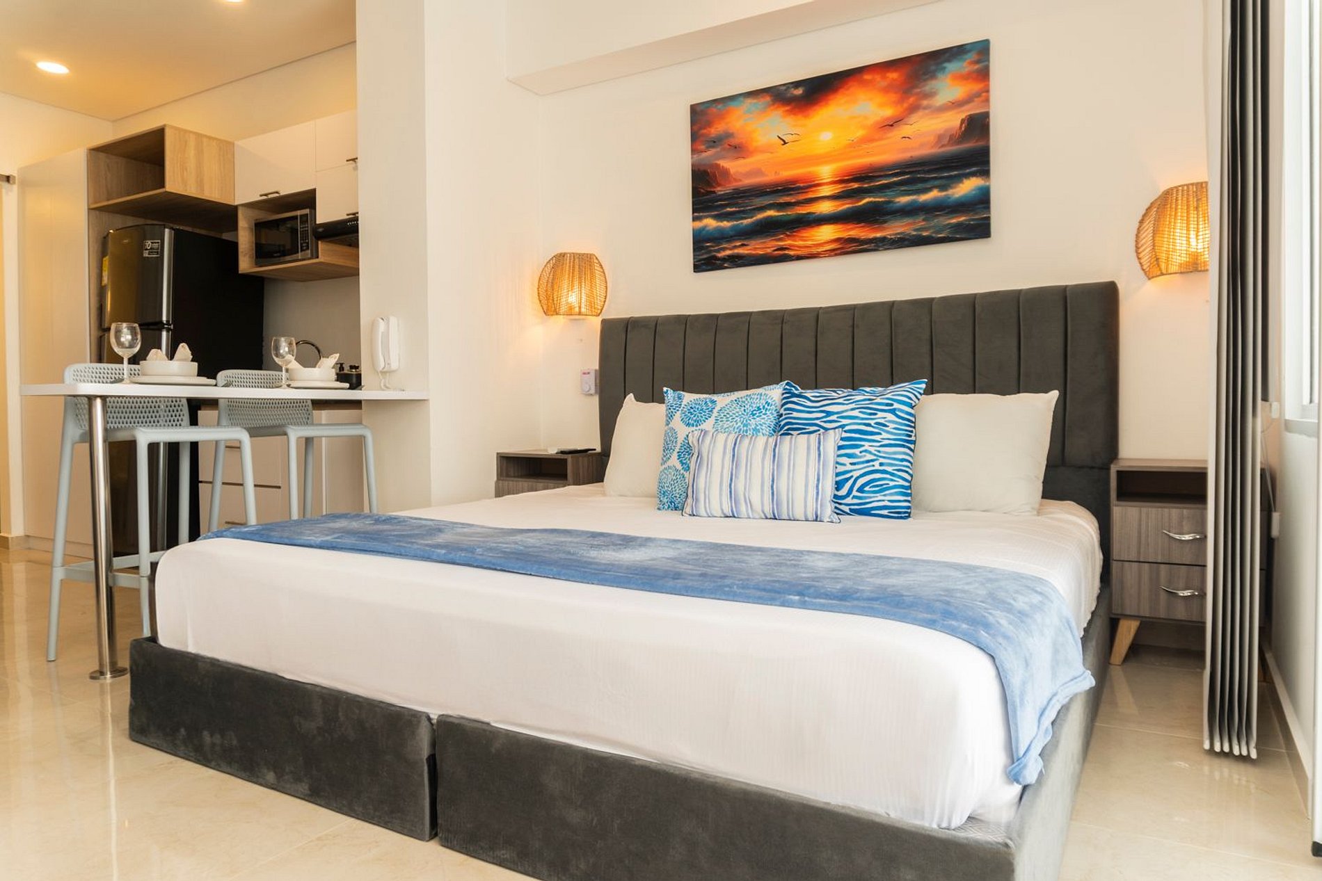 Esta suite moderna y luminosa está ubicada en el piso 6 del edificio Cartagena Beach. Diseñada para brindar confort y estilo, cada rincón ha sido pensado para que tu estadía sea tan cómoda como inspiradora, ya sea que vengas por trabajo, descanso o en pareja, ideal tambien para una pequeña familia.
